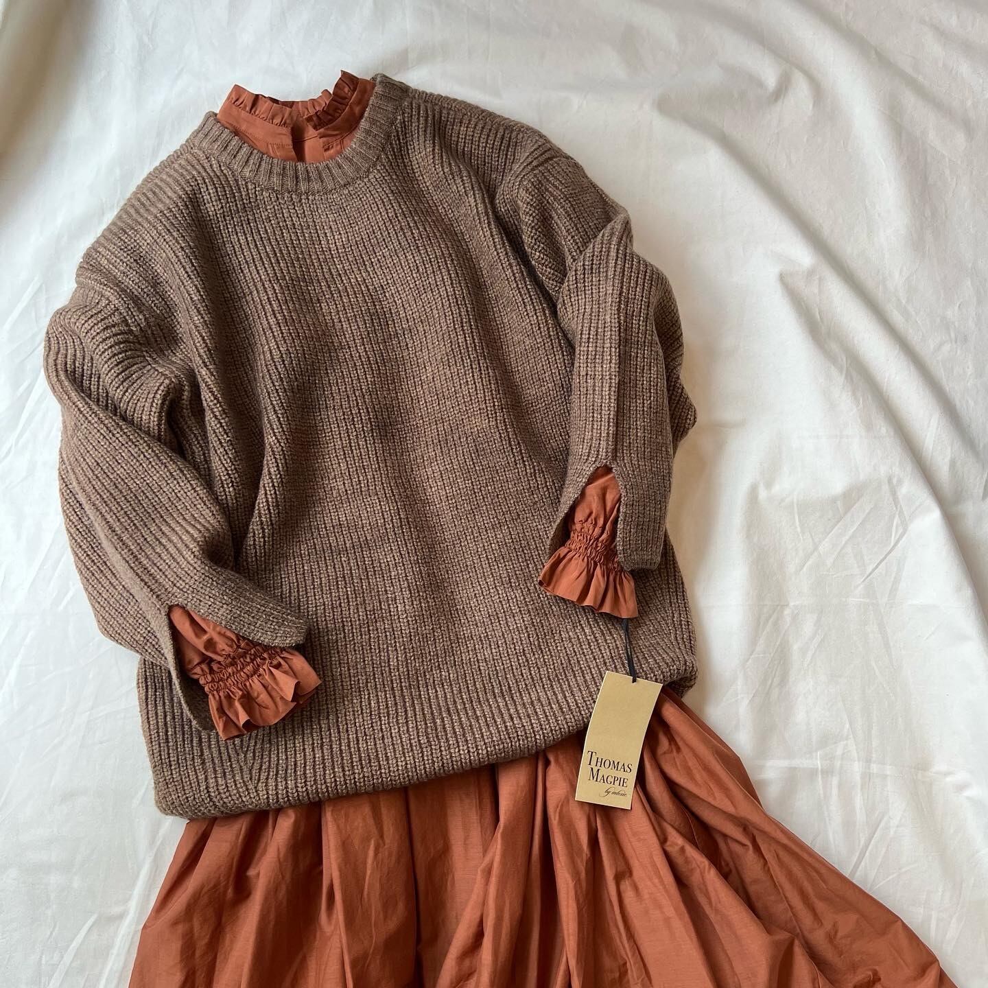 袖口は腕のどの部分でも留まるようにシャーリングのゴムにしてみました。ですので半袖にしたい場合はたくし上げて半袖使用にしてパフ部分を膨らませて着用してみてください。たくしあげて短めの袖のように見えるシルエットも、下ろして長袖のパフスリーブ仕様もどちらもロマンティックなシルエットです。