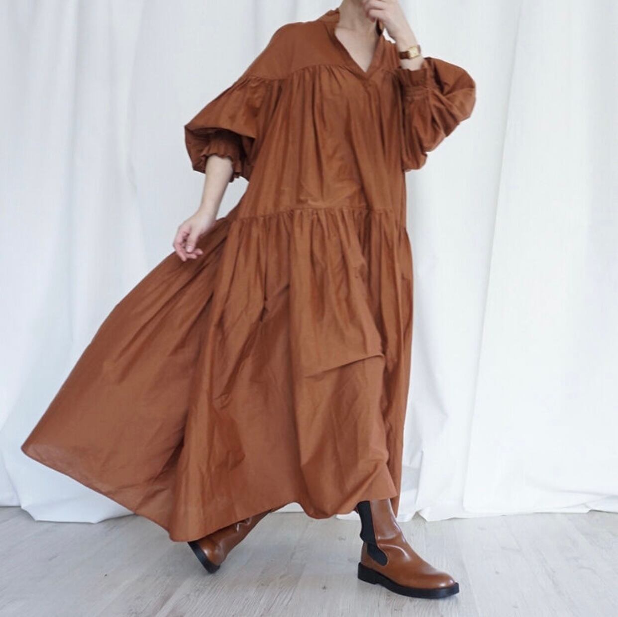体型がわからないオーバーサイズです。痩せ型の方にもふくよかな方にも向いているドレスですが、特に体型が気になる方には、体型を拾わないのでおすすめです。真夏に一枚で着て、とても涼しく、肌の露出なしに涼しく過ごすことができます。首元は大きめの開きにしました。女性の綺麗なデコルテ部分が少しだけ見えるデザインにしてみました。ですが、首の後ろ部分は襟が高くなっているので日焼け防止にもなります。
