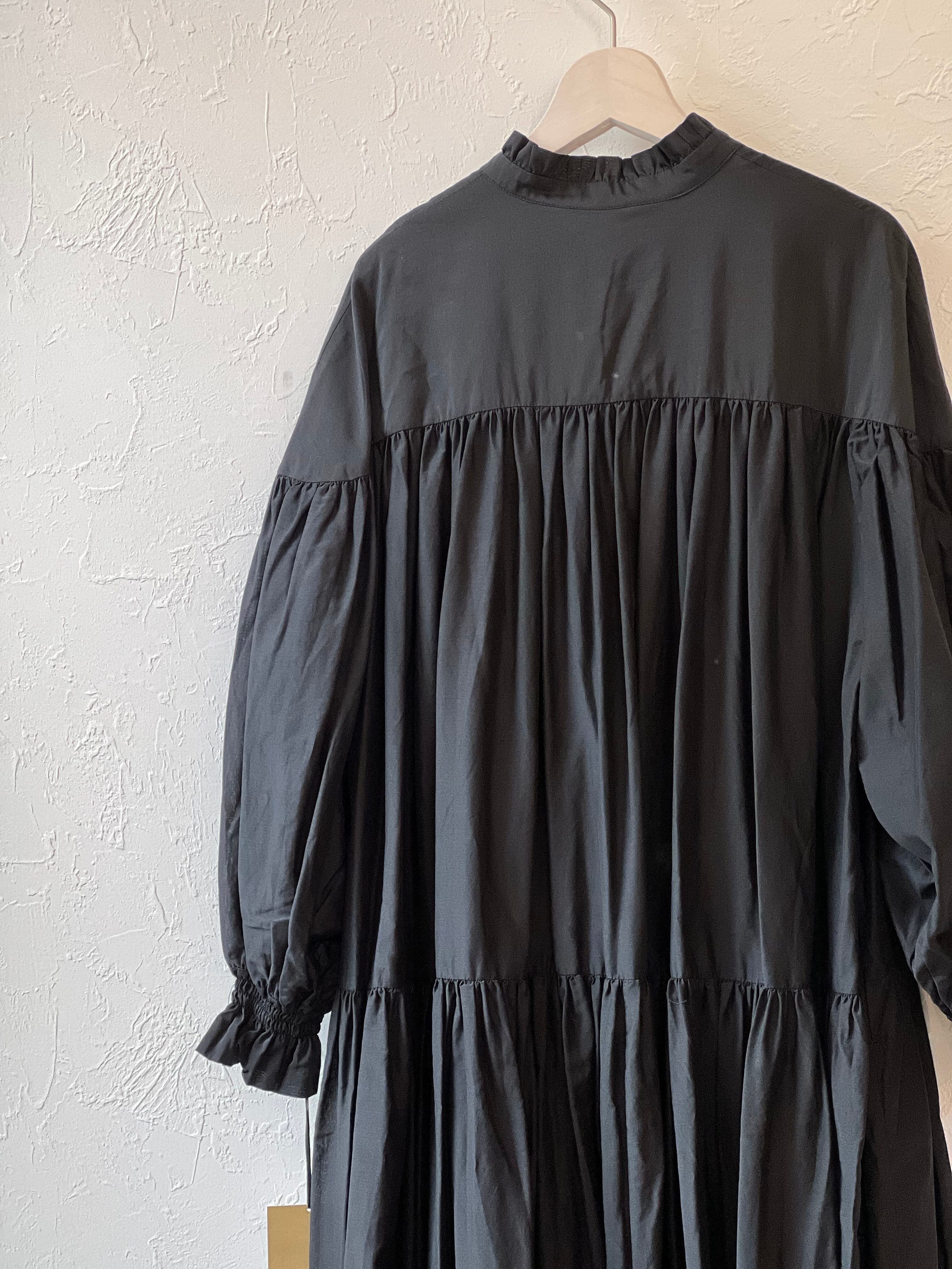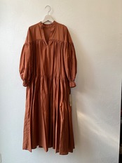 コットンシルクで優しい肌触りのドレスを作りました。今回はたっぷりとした用尺にして広がりが大変美しいシルエットを作っています。とても軽い素材のコットンシルクローンで歩く度に、広がり、その広がりが一度浮くと落ちるのに時間がかかります。その揺れ感と軽さゆえの落ちる緩やかさがとてもロマンティックで女性らしい瞬間ではないかと思います。長年女性として生きてきた中で、女性の美しさは若さ、メイクアップ、そして着る物からの演出の比重が多いと感じます。