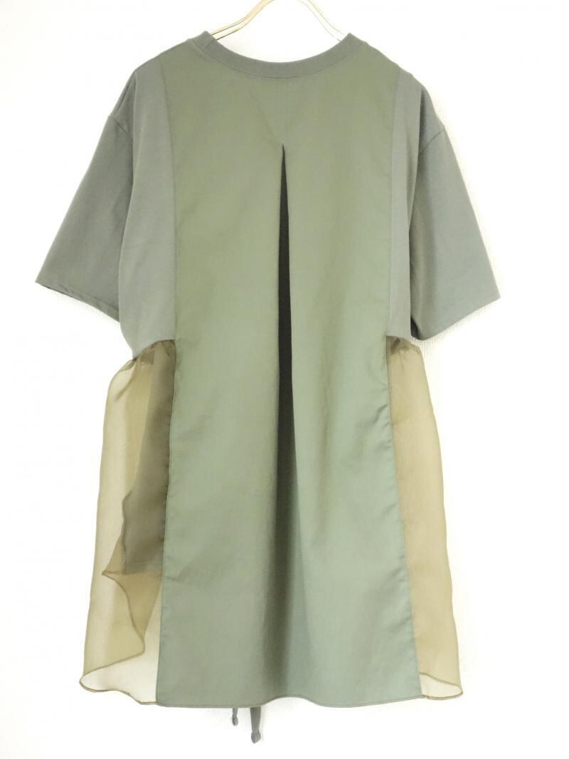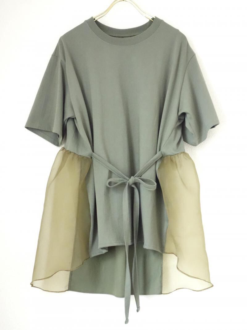 身頃に綿素材のカットソー、後中心パネルに布帛生地、裾にオーガンジーをあしらった、3素材をドッキングさせたデザインカットソーです。 ウエストリボンは前後どちらで結んでも、違った印象が楽しめます。少しデザインの効いたカットソートップスは、イージーなシンプルボトムと合わせても1枚でこなれ感が出るのでおすすめです。