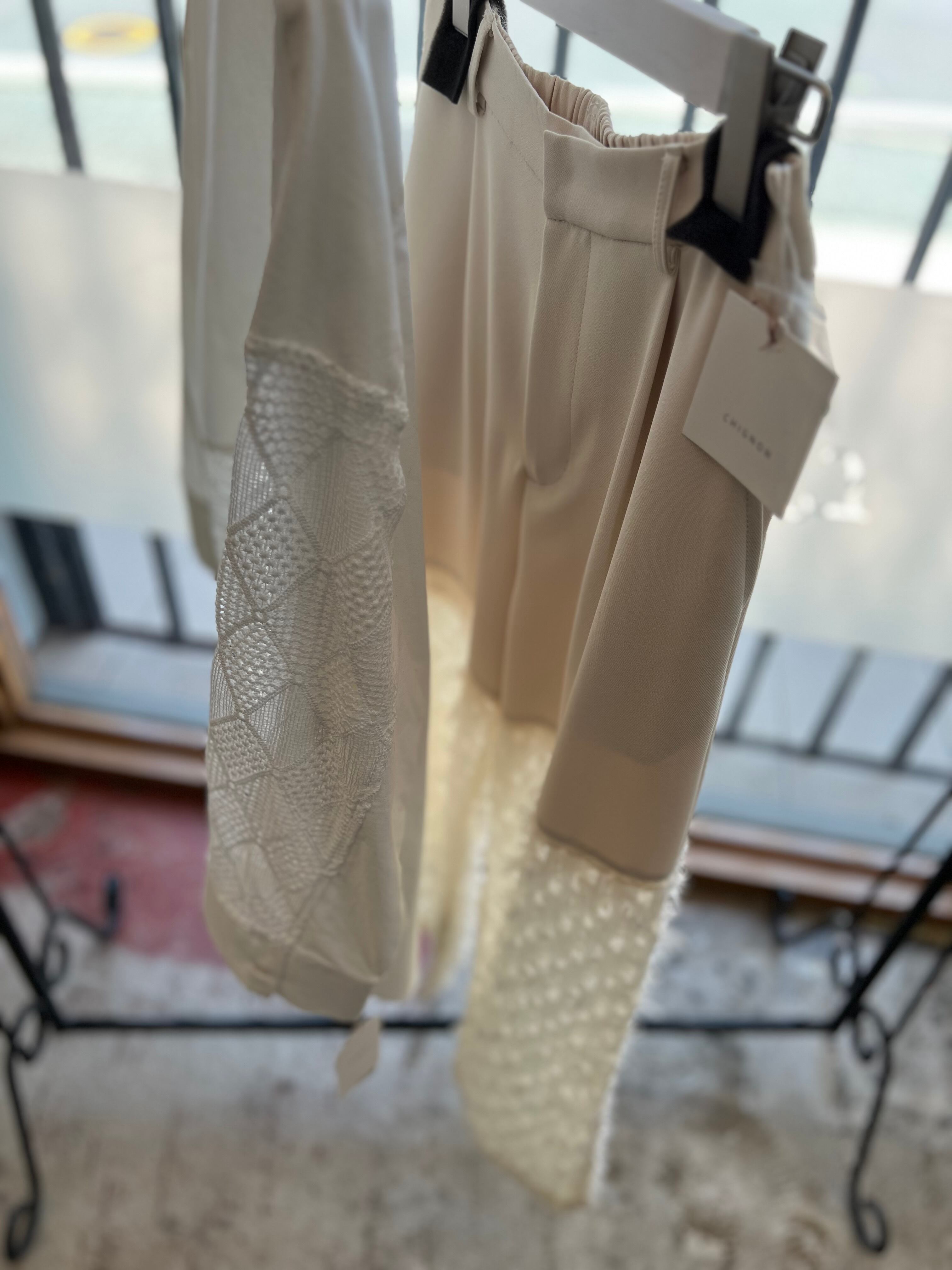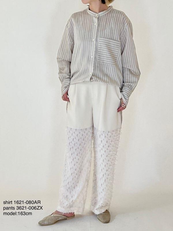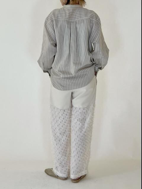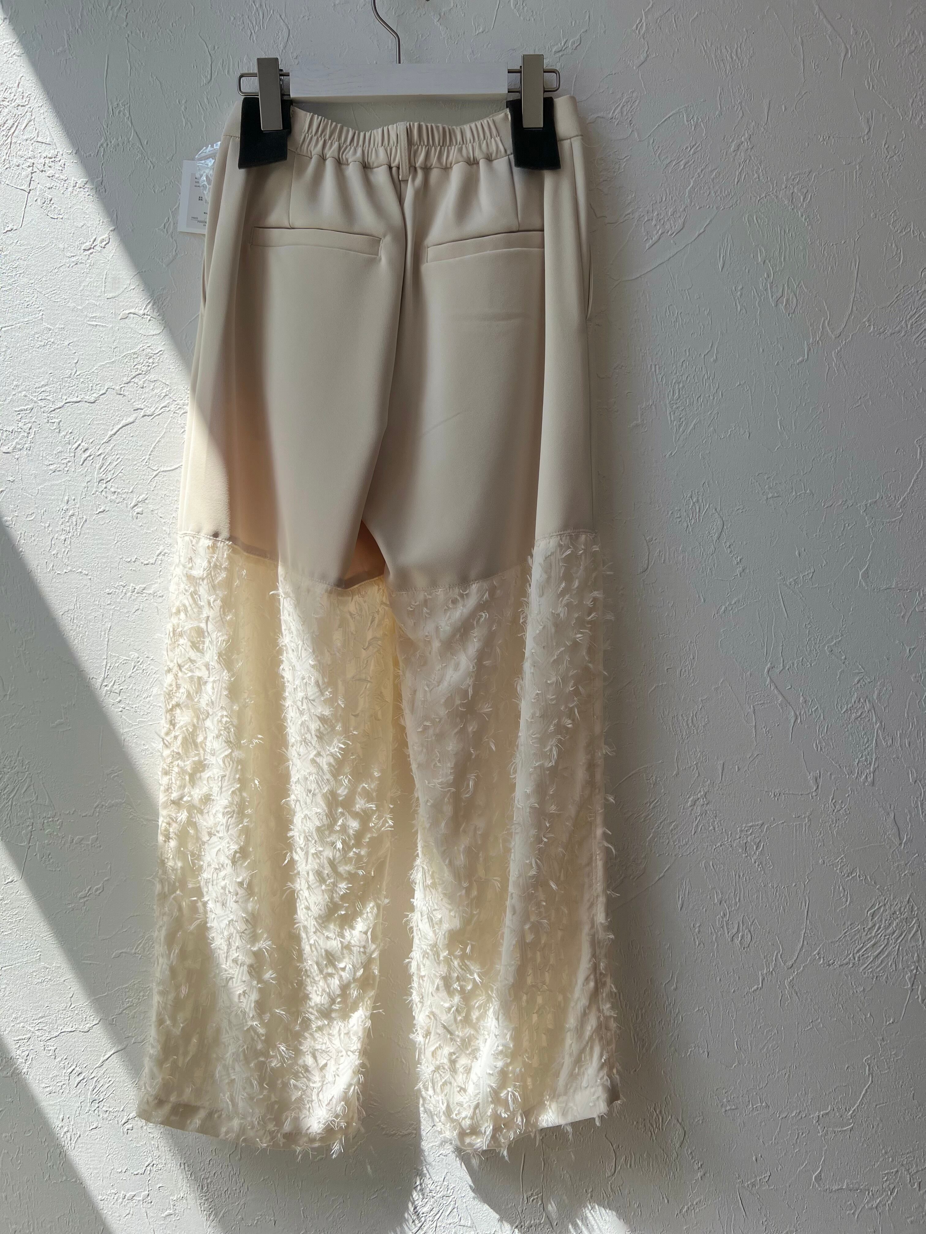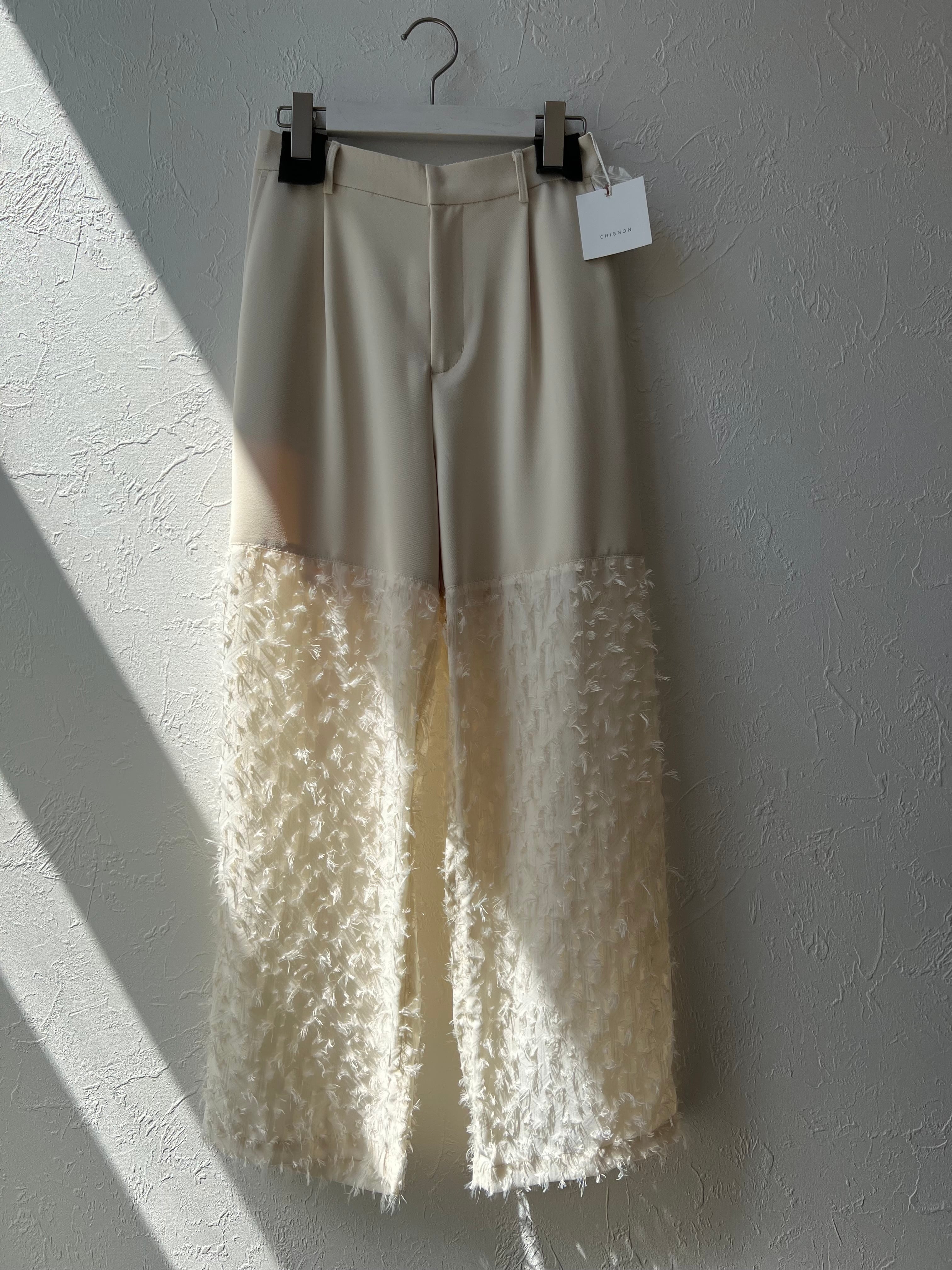 中肉の落ち感のあるツイル生地と透け感のあるフリンジカットジャガードをドッキングしたワンタックパンツです。