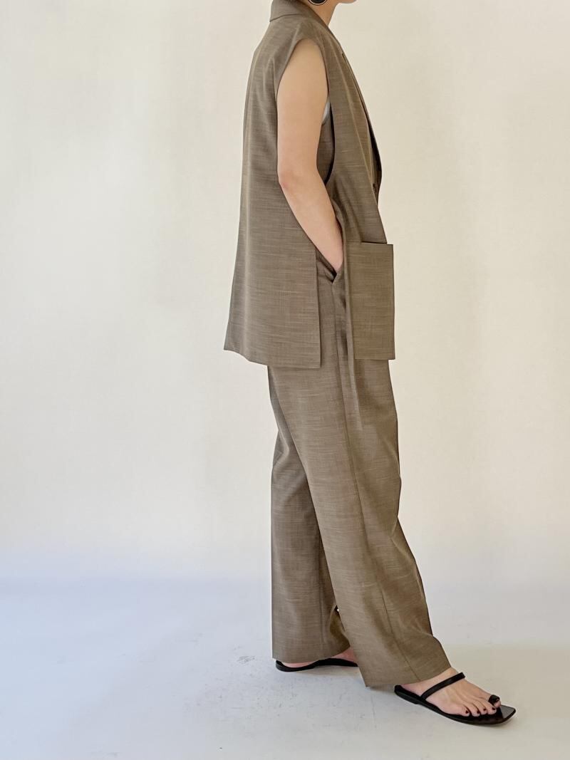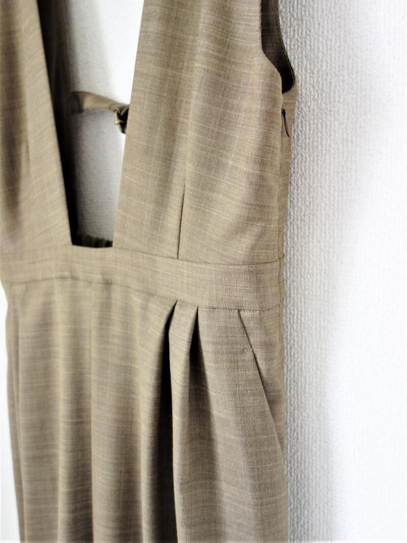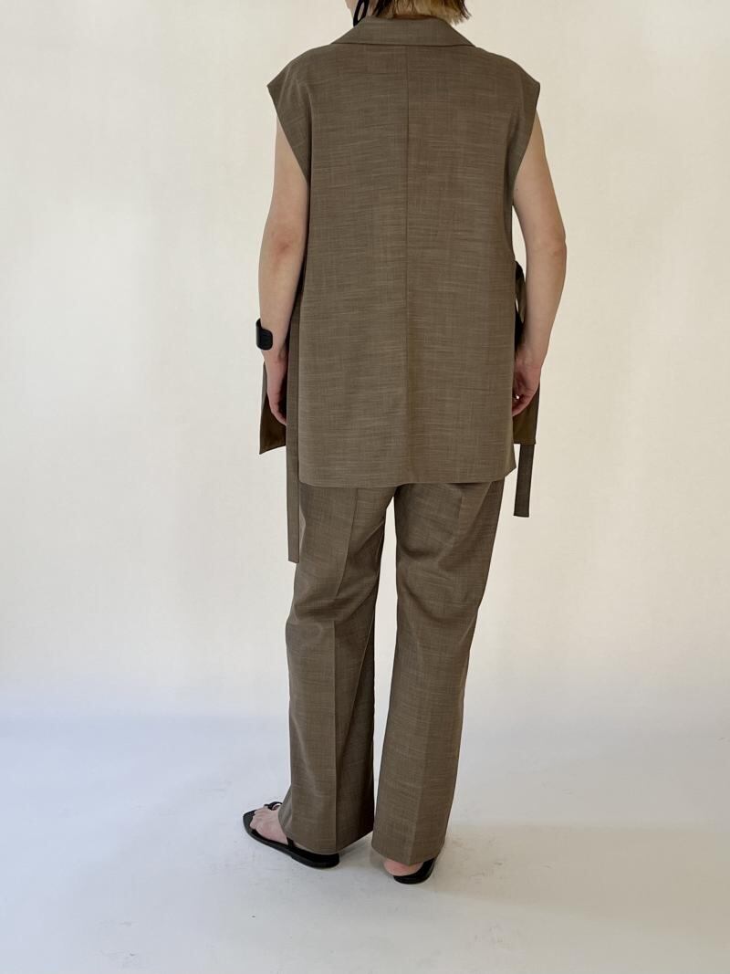 杢調のメンズライクな雰囲気のTR素材を使用しています。一見かっちりとした印象ですが、軽くさらっとした風合いの生地なので、夏の暑い時期にも着用いただけます。 バックスタイルの2連のベルトデザインがポイントです。 きちんと感があるアイテムなので、オケージョン提案にもおすすめの1枚です。
