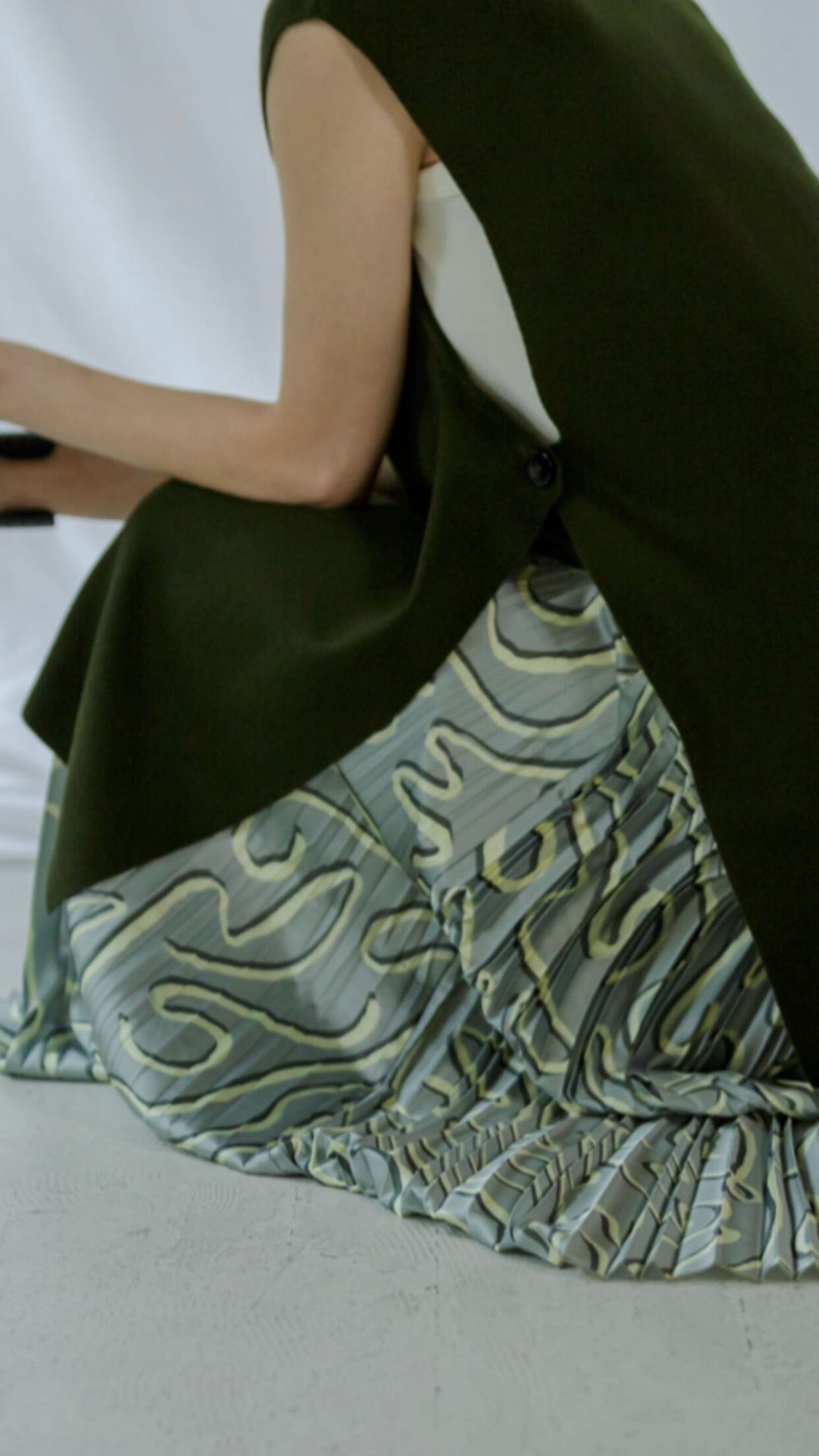 プリーツを細かく入れ、バイアスに裁断した落ち感のあるシルエットになっているので