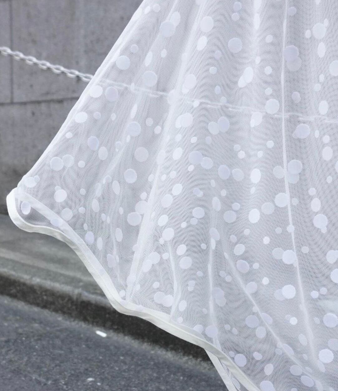 よくある切りっぱなしのチュールではなく裾はパイピングになり、子供っぽいコーディネートになりがちなチュールを贅沢にたっぷりと使うことで歩けば揺れてゆくさまがロマンティックで大人の洗練された印象を残します。