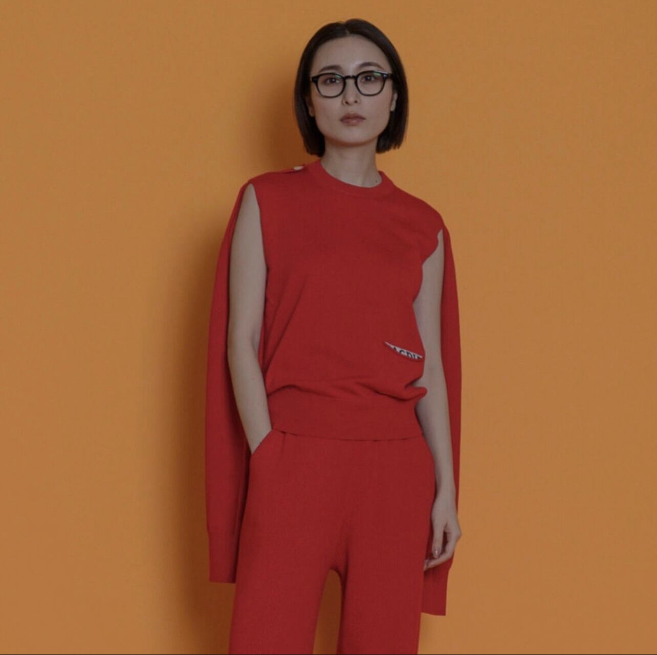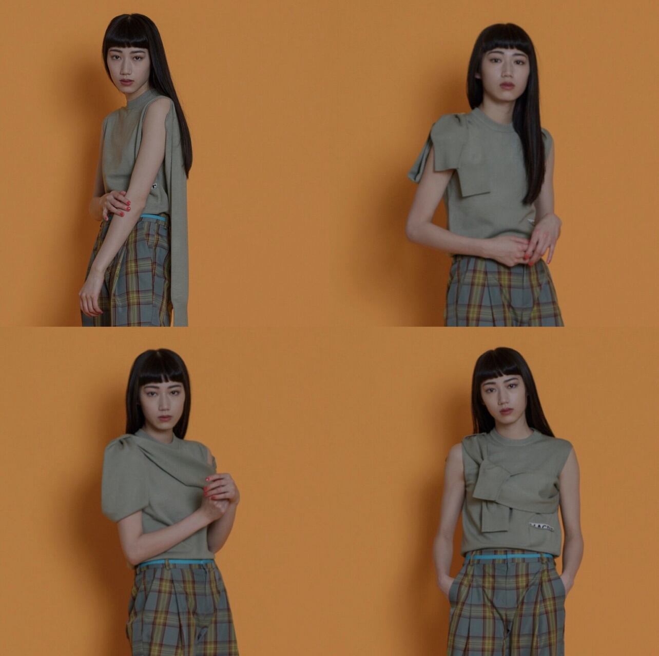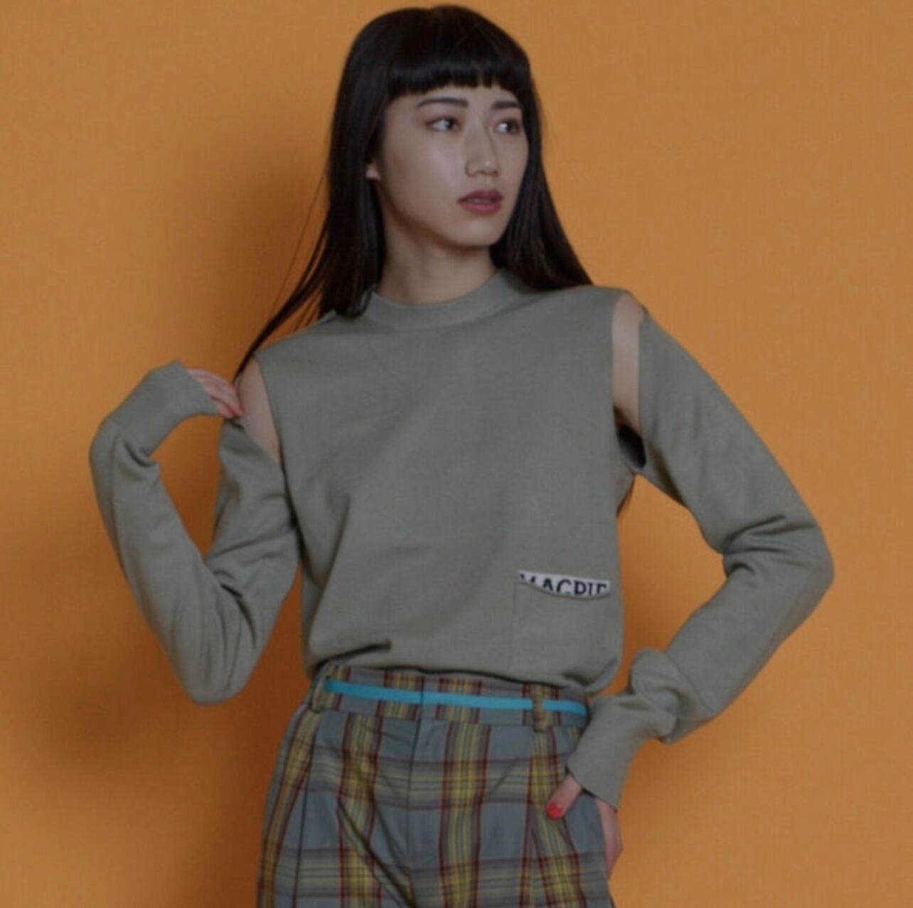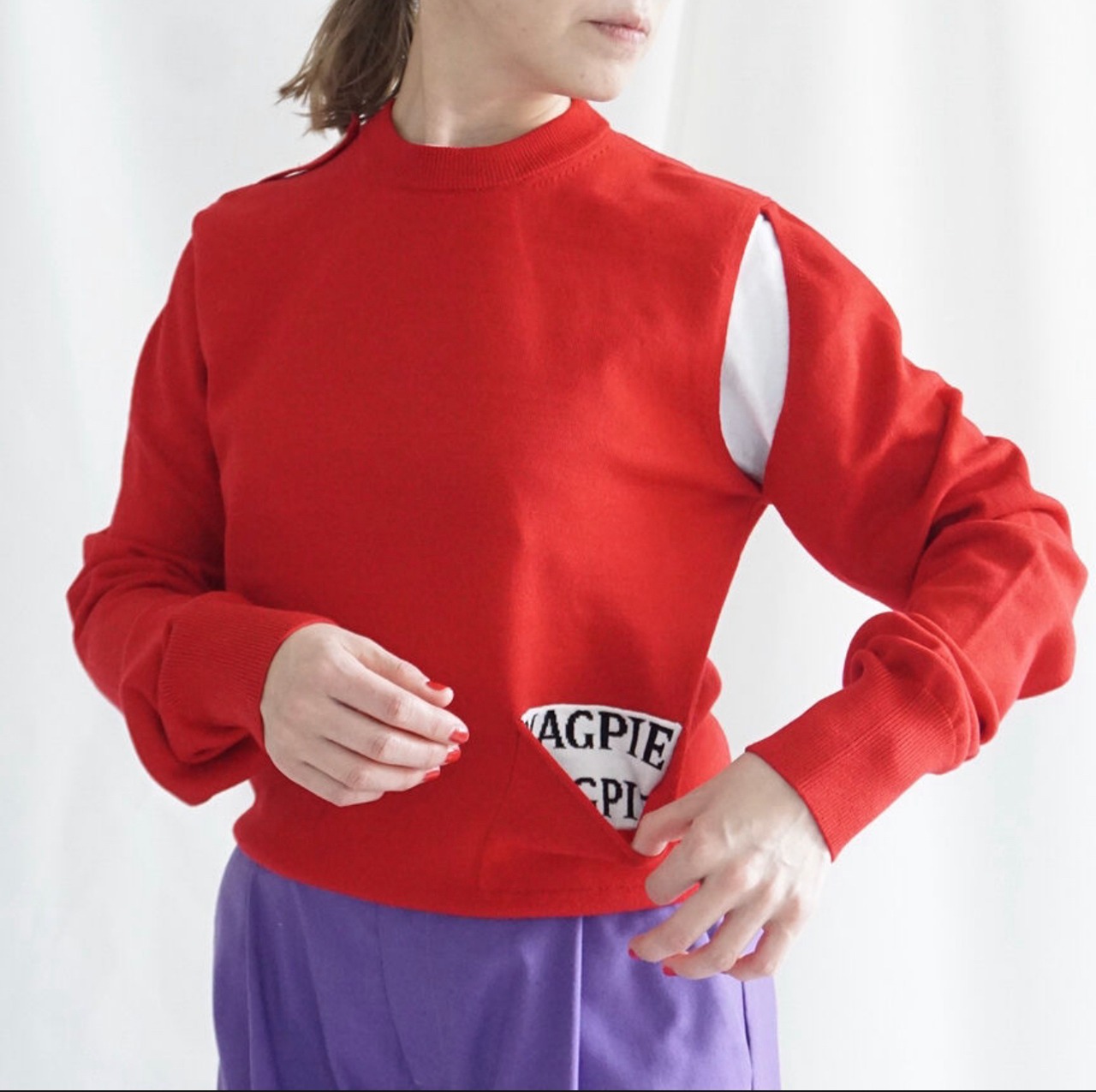今回は以前にヒットしていたポケット付きのニットをベースに肩部分のリンキングをなくし袖を通さず、ベストとしても着用できます。袖部分はアレンジができるように長めにしています。前で結んだり、また右肩にエポーレットをつけているので、袖を肩のエポーレットに通すこともでき、1枚で色々な形で着用できるオリジナル性の高いニットです。