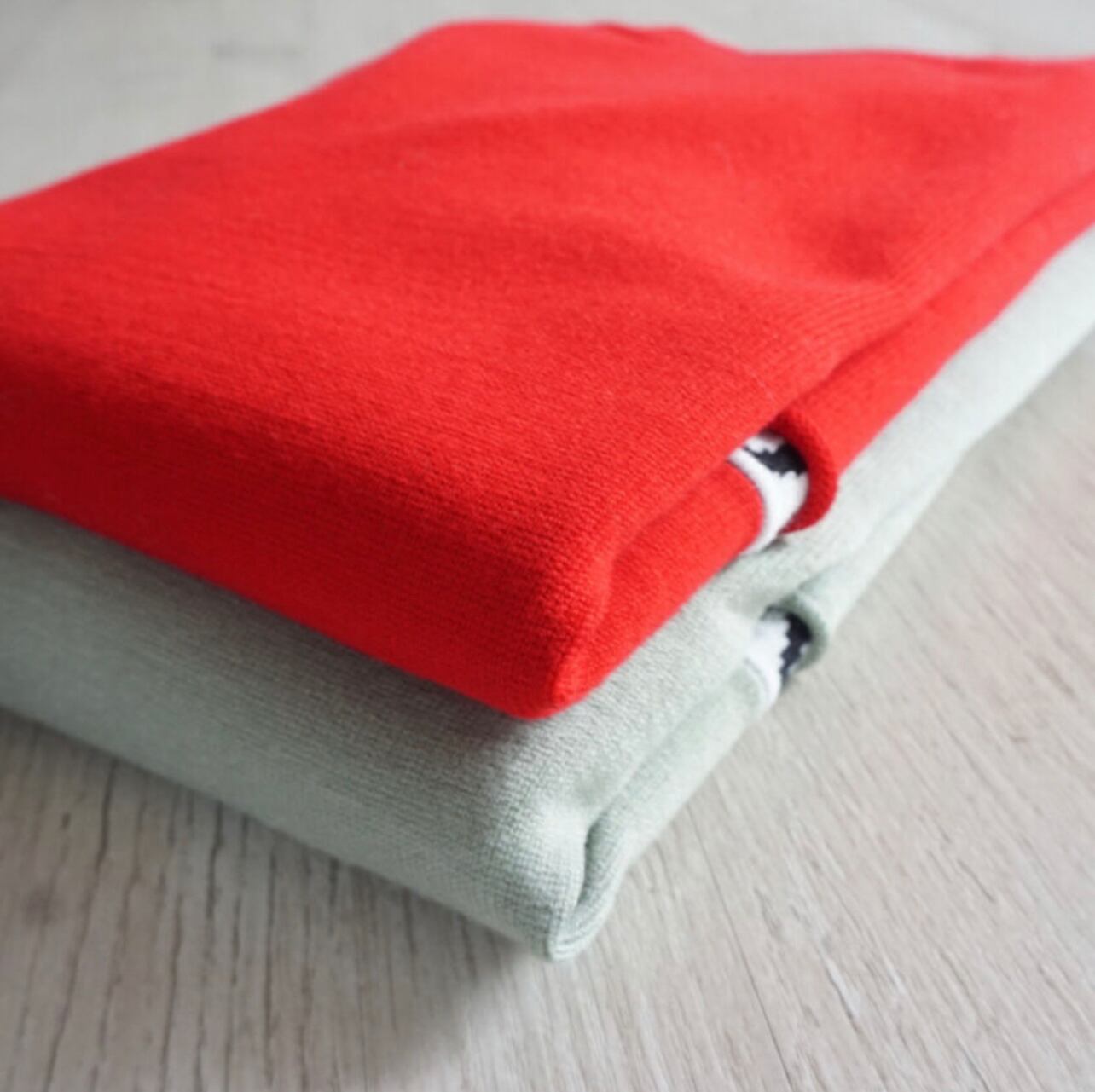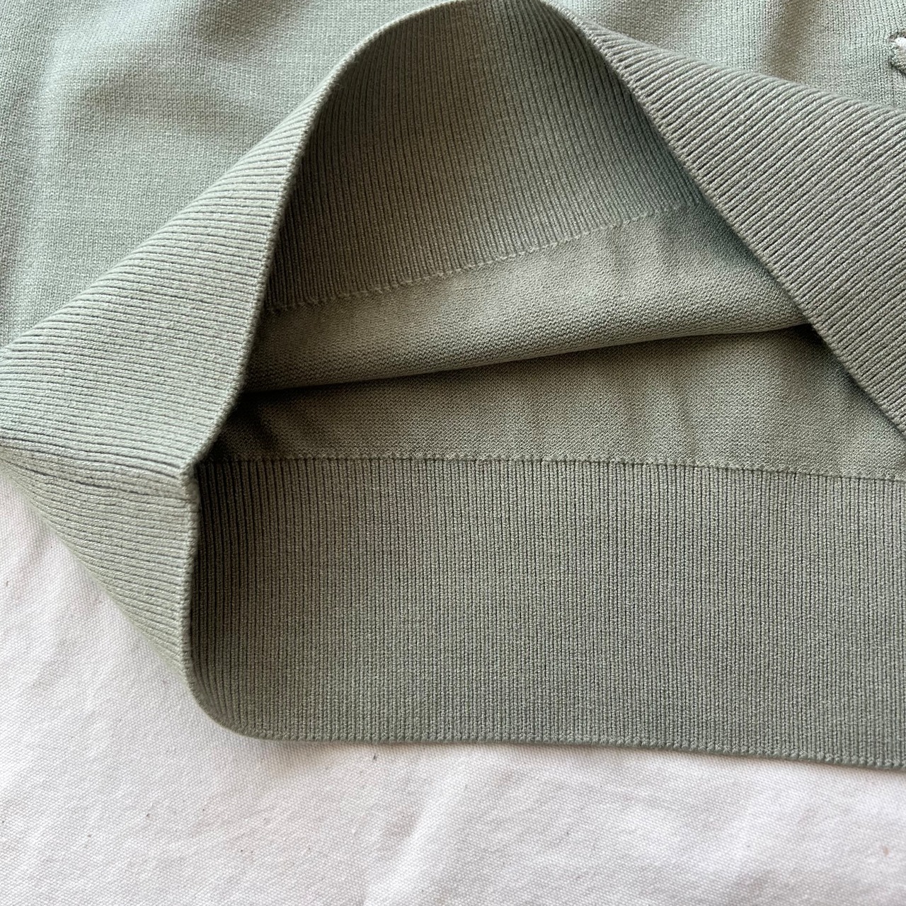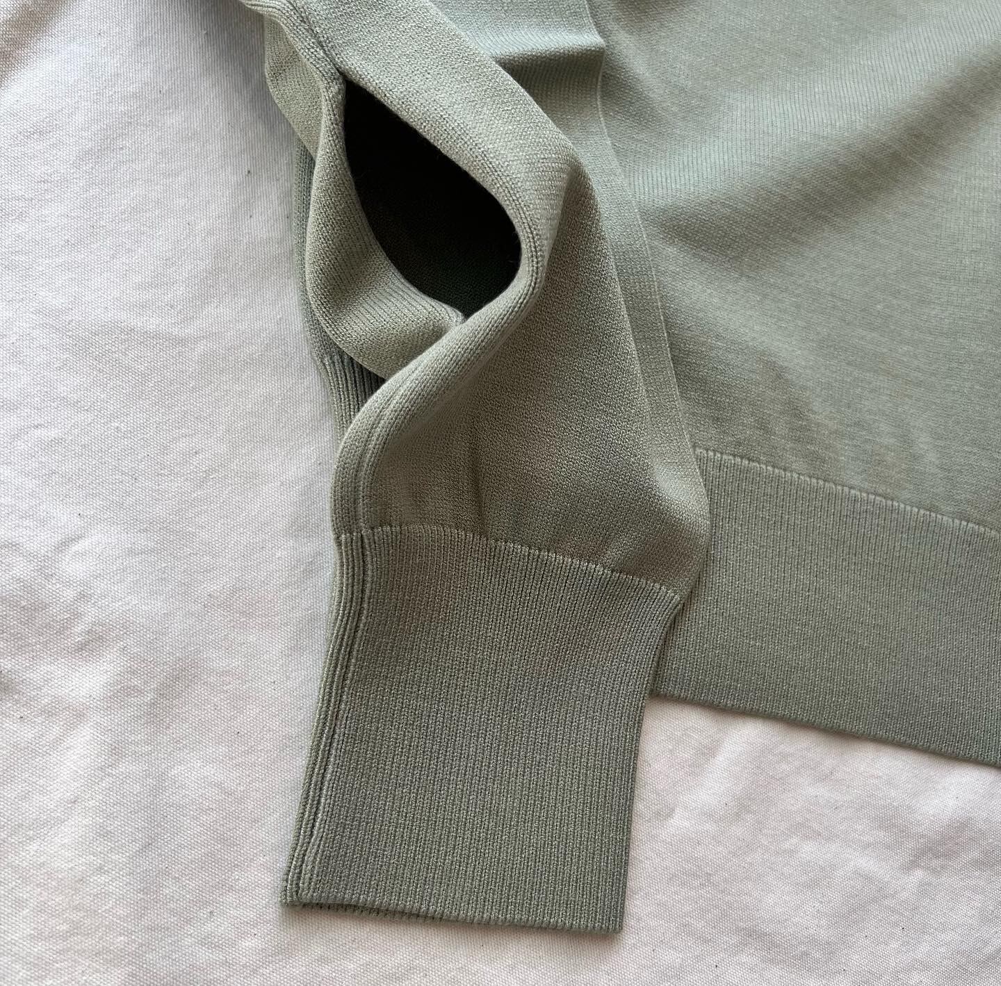 ハイブリッド素材のレーヨンポリエステルのニットです。糸はさらりとしていて形崩れや毛玉になりにくい素材をリピートしています。これまでも何度となく使ってきた消耗感の少ないとてもコストパフォーマンスの良い糸です。以前は襟付きのニットなどで販売をしてきましたが非常に人気でとても気に入ったので色違いで購入する方もいらしたそうです。
