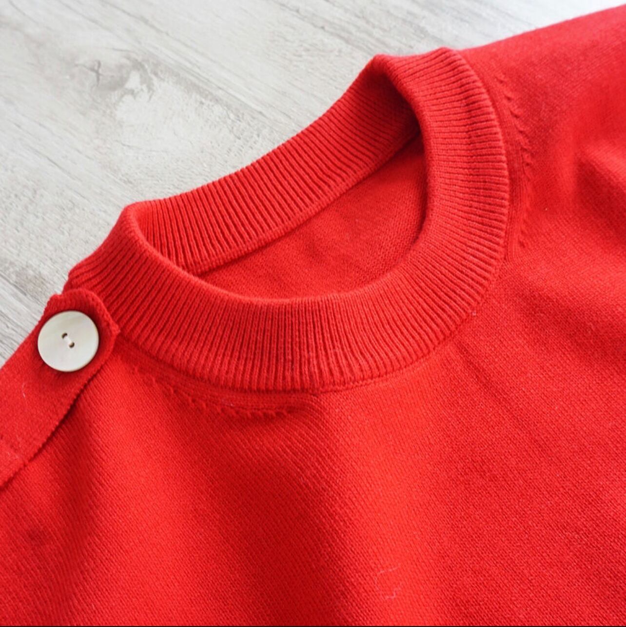 今回のお勧めのカラーはレッドです。レーヨンの発色が美しく絵の具から出したての様なフレッシュな真紅が肌の色をより白く見せてくれます。ボトムにデニムでカジュアルな雰囲気でも着てもらいたいと思います。