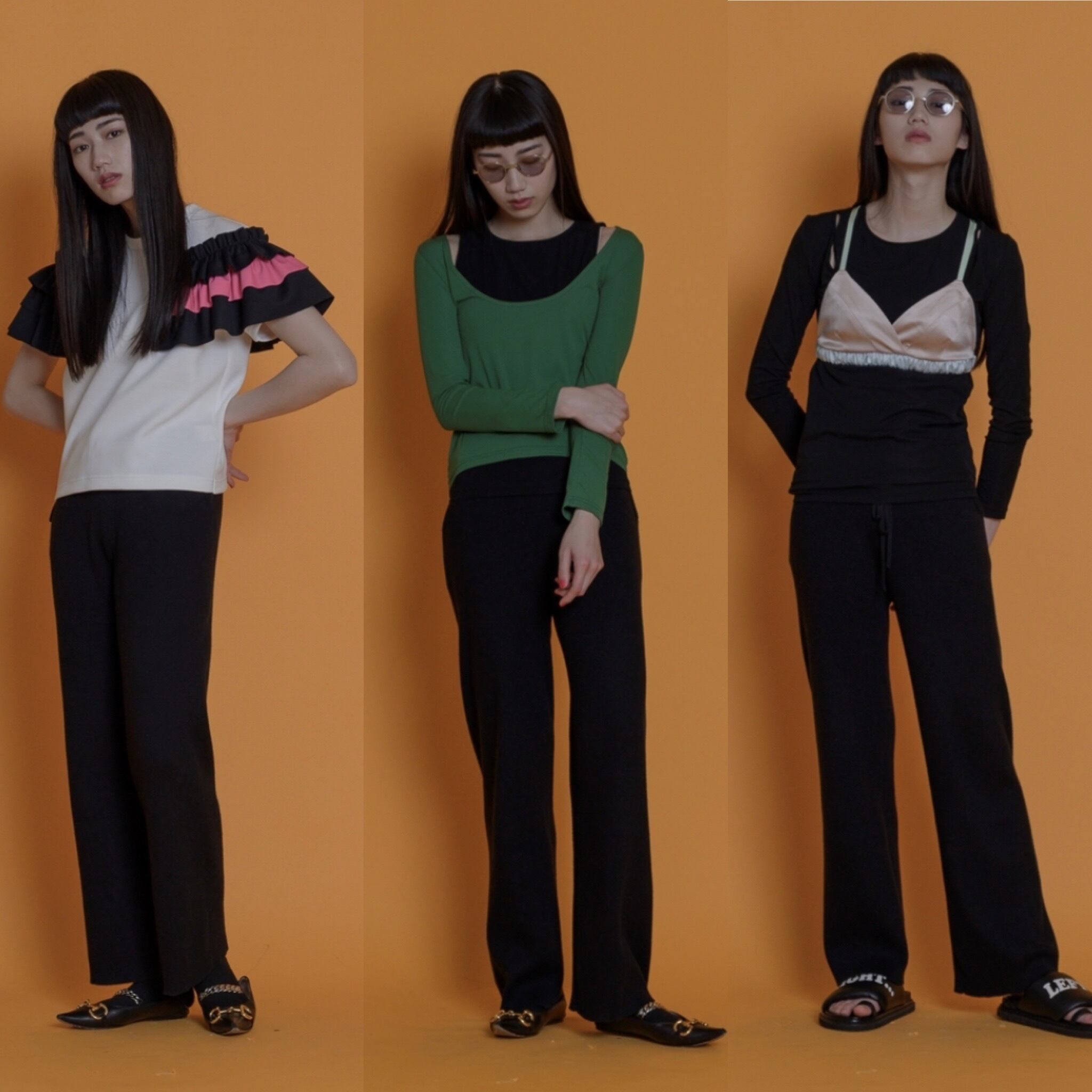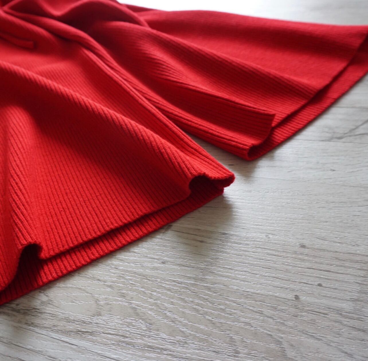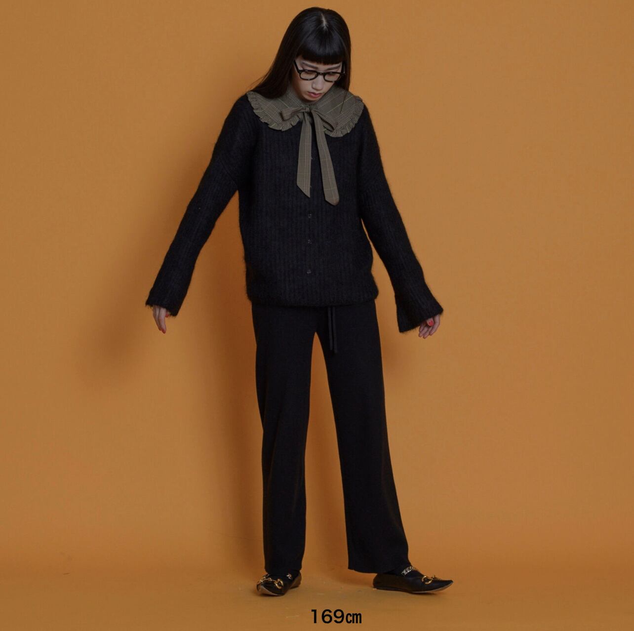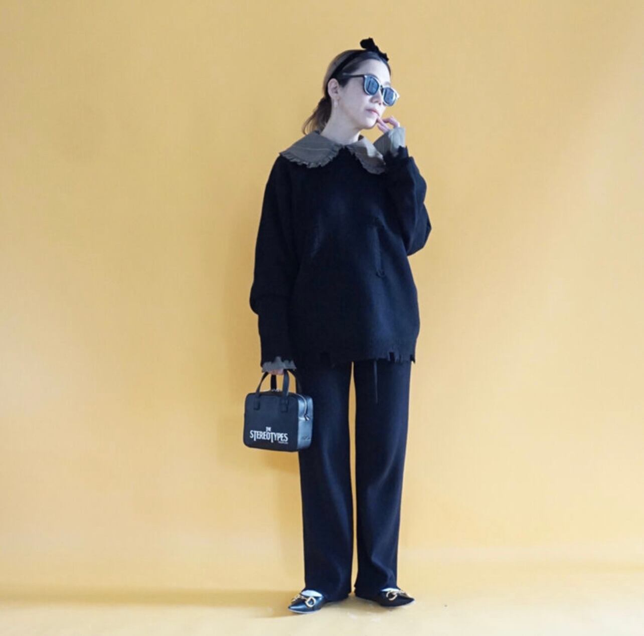 以前出していたニットパンツのリピートで今回は先行予約を受け付けます。これは以前よりほとんど変更していないのですが、特にバイヤーの方々から大変好評でした。何度着ても膝が出にくいと評判です。糸は、パフスリーブニットなどと同じハイブリット糸。キックバックの強いリブ編みで重みのある糸なので落ち感がよくほっそりと見えます。股上はやや深めですが、ウエスト部分は幅広めのタックゴム+ドローストリングで紐で縛ることができる作りにしています。細い方は紐で縛ることが出来るのでストレスなく、またストレッチが聞いているのでふくよかな方にもおすすめで、色々な体型の方へ向いているパンツです。細い方よりも肉付きの良い方の方がスタイルアップに見えると思います。太ももはあまり広がっていないのでほっそりと見える効果があります。丈はやや長めにしました。165cmくらいの方にちょうど良いレングスです。150cmの方にはカットをお勧めできます。私自身がサンプルが長かったので自分でカットしたものを着ていますが、ほとんどほつれがありませんでした。心配な方はお近くでお直しに出されることをお勧めしますが、通常のハサミでカットしても問題ないと思います。156cm程度の方はウエスト部分をひと曲げして着用もOKです。159cmの私はウエストをきゅっと絞り少し上めのウエストで着用するとちょうど良いフルレングスになりました。