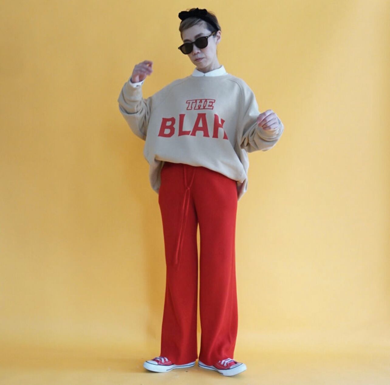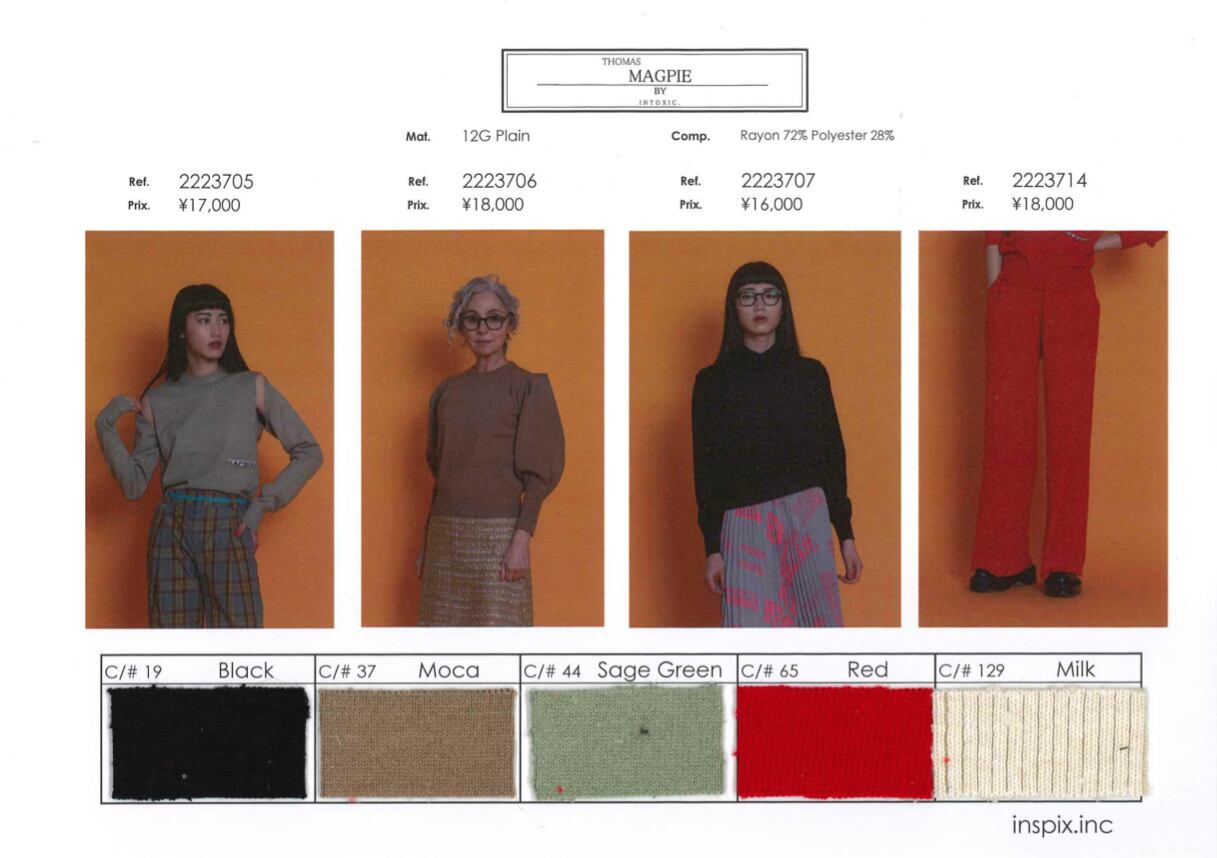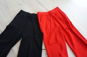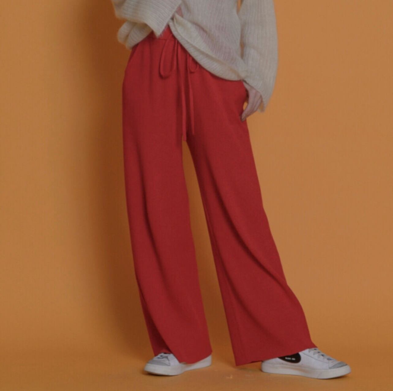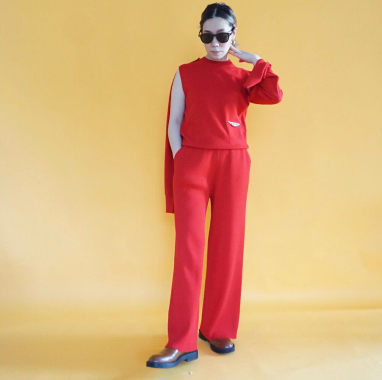 こちらも発色の良いレーヨンが入っていて、レッドのカラーは非常にお勧めです。今回のコレクションは赤を基調色として真っ赤なカラーを入れています。最近あまり着ていなかった赤いパンツも新鮮でとてもお勧めです。この赤はスタッフにも大変好評でした。シックな黒も重宝するカラーです。ブラックのパンツはたくさん持っている、という方が非常に多いので、今回はニットでの赤いパンツをお勧めします。ぜひこれまで着用しなかった方にもチャレンジしてほしいカラーです。私も個人購入は迷わず赤をピックアップすることにしています。