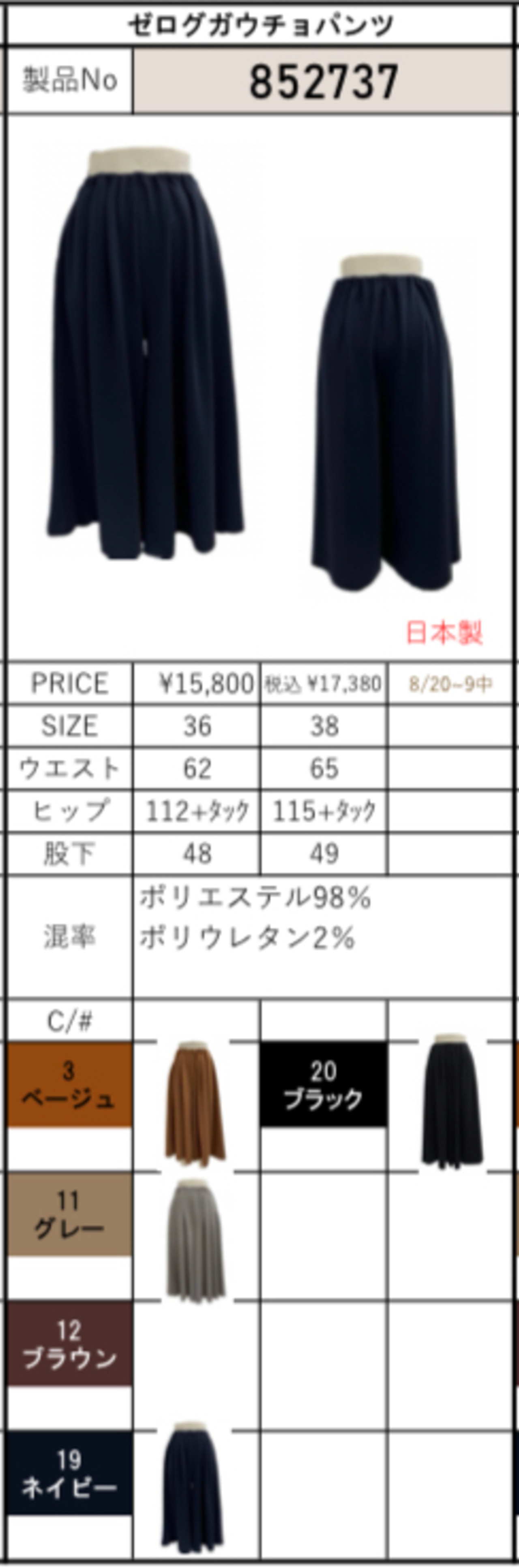 color No.3ベージュ/No.11グレー/No.12ブラウン/No.19ネイビー/No.20ブラック