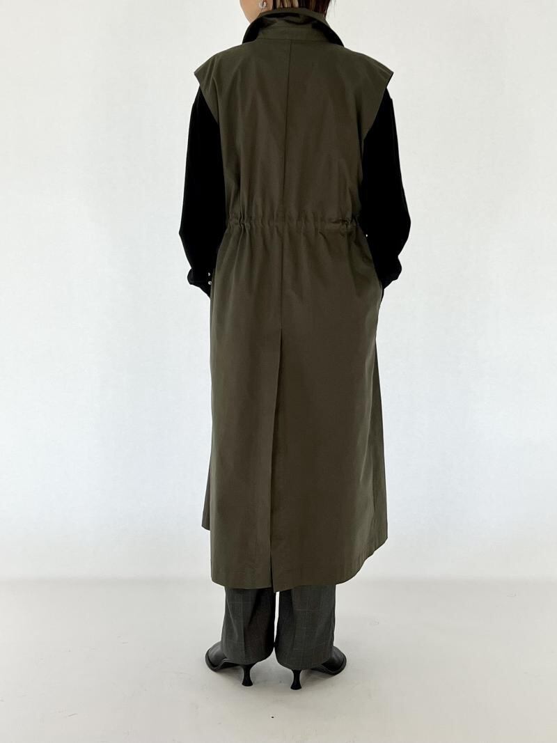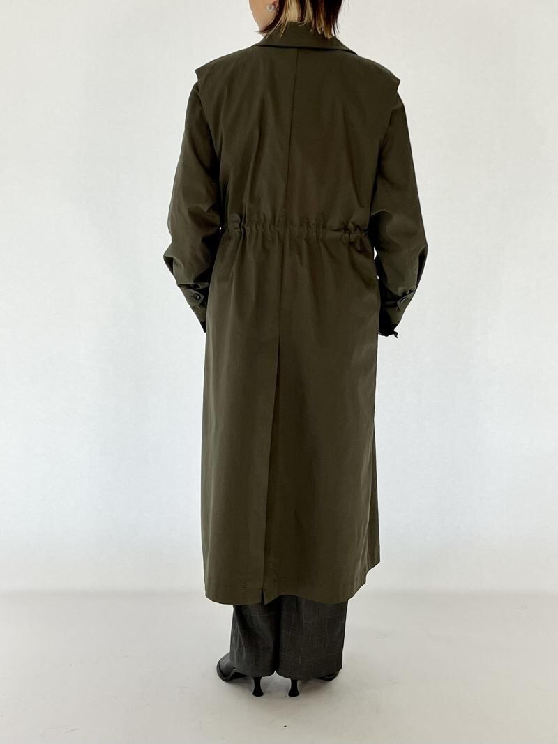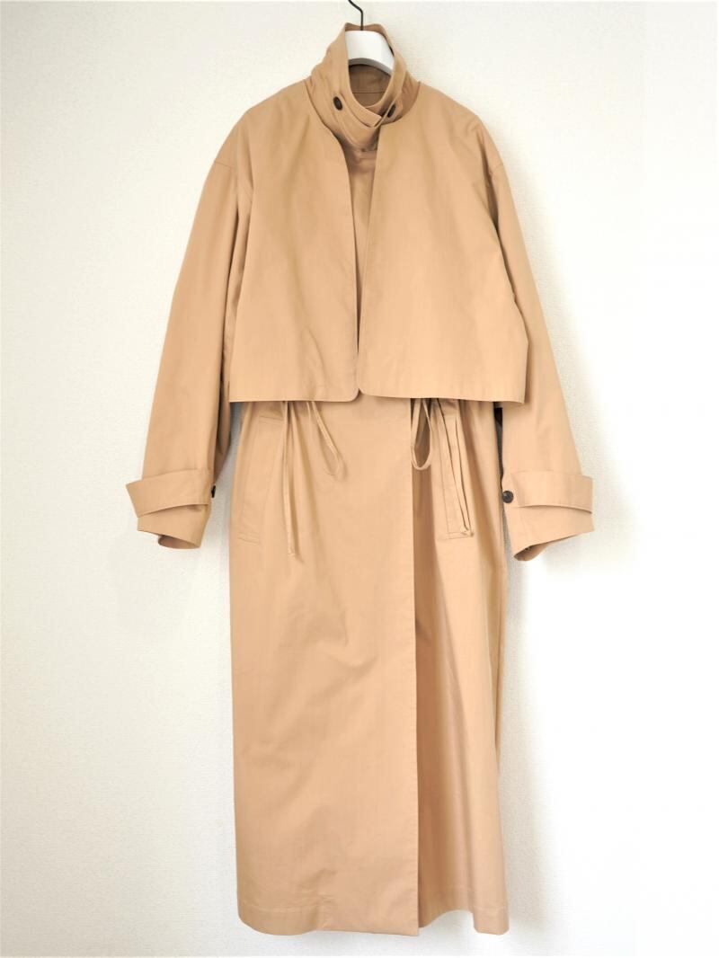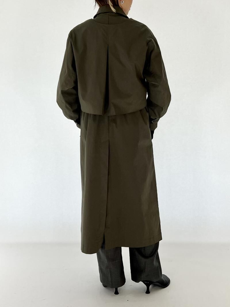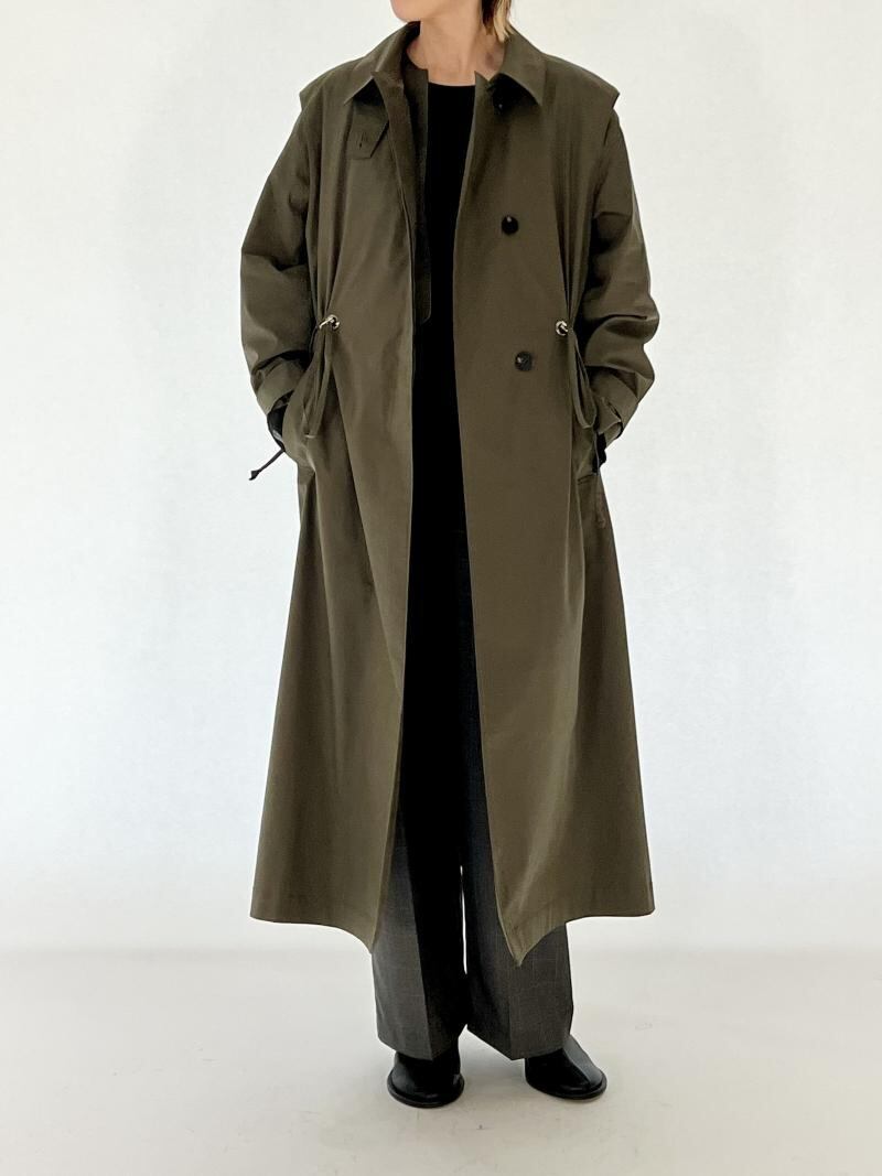 コートの着用方法としては、ジレの上にジャケット羽織ればトレンチコートのような印象になり、ジャケットの上にジレを羽織るとウエストのスピンドルが効いたロングブルゾンのような印象になり2タイプの着こなしが可能です。