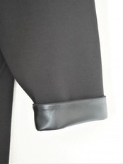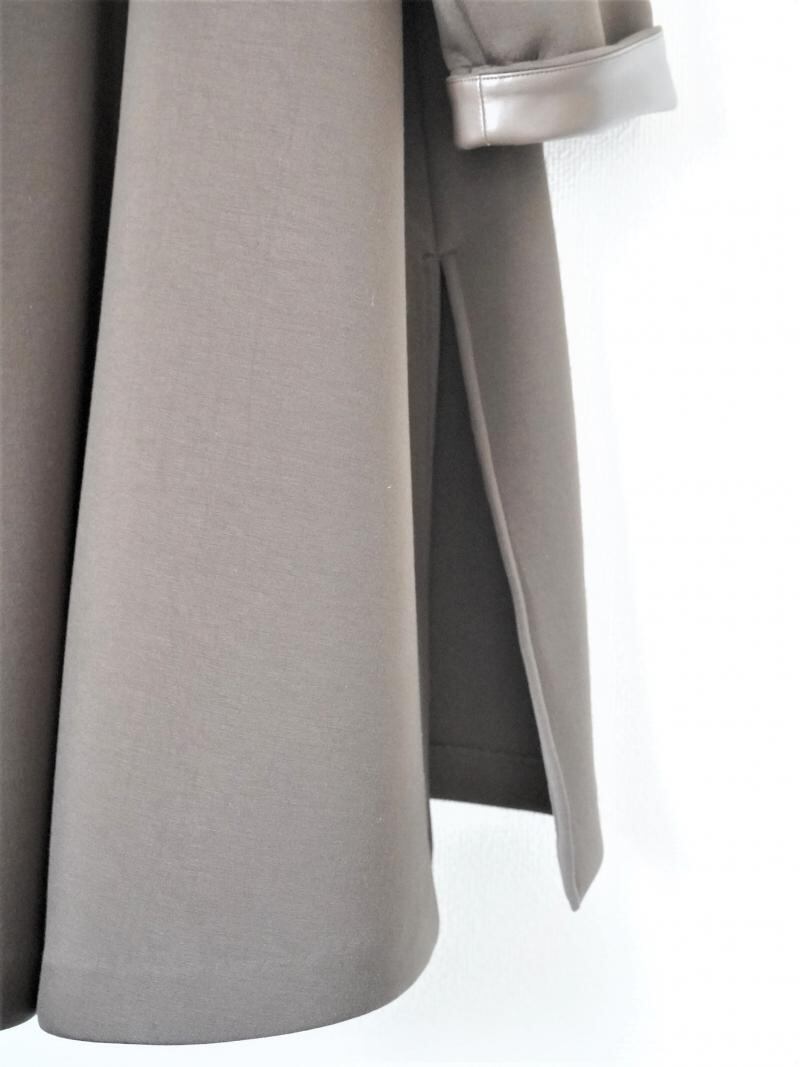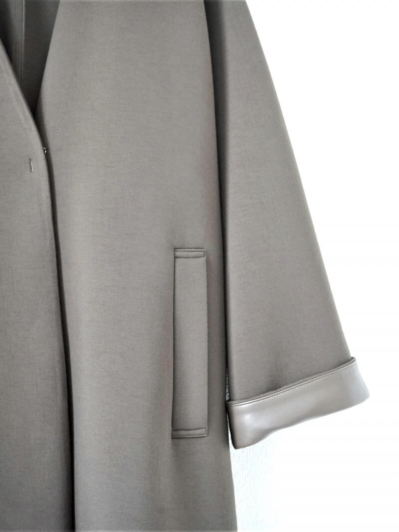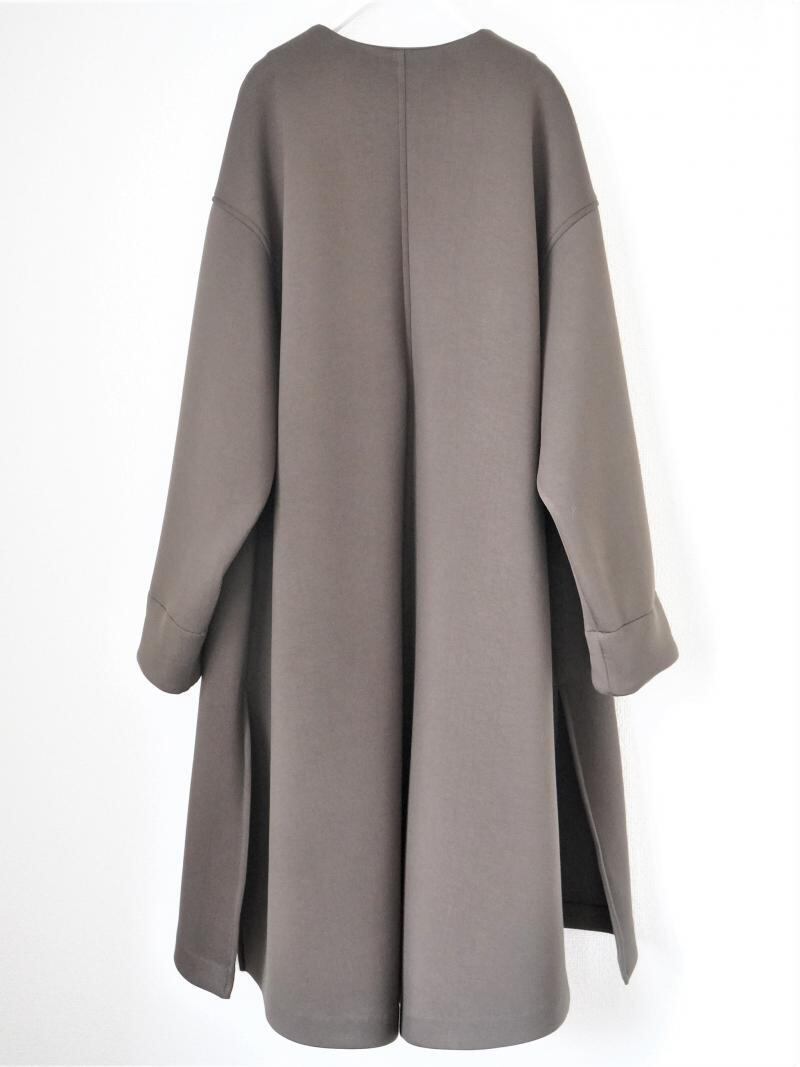 中肉のダンボールニット素材を使用したノーカラーコートです。ノーカラーのシンプルなデザインの中にもフォルムが出るようテントラインのシルエットにし、前後差のある丈感やスリットなどで動きを出しました。カットソー素材ですがカジュアルになりすぎないように仕立てており、袖口には合皮使いのディテールを入れ上品で高見えする1枚です。