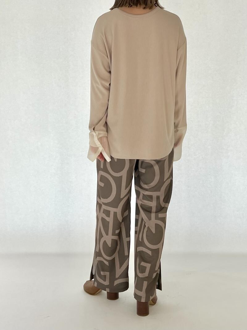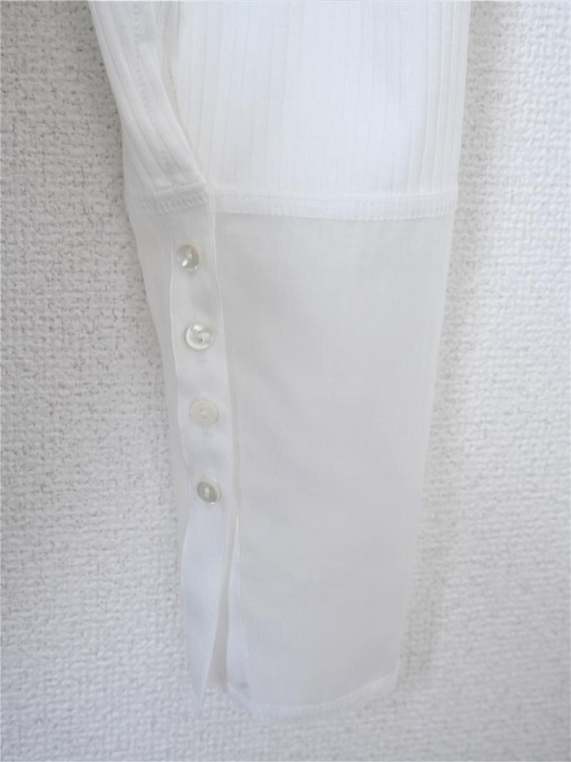 落ち感のあるリブ生地と、シアー素材をドッキングさせたデザイントップスです。