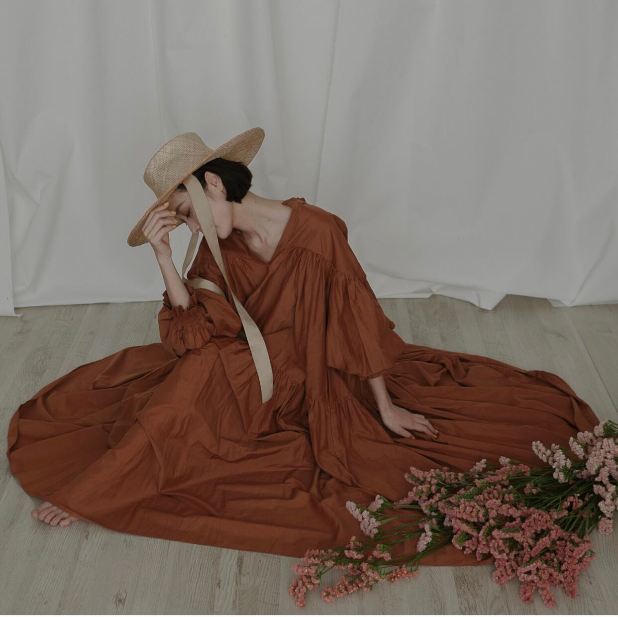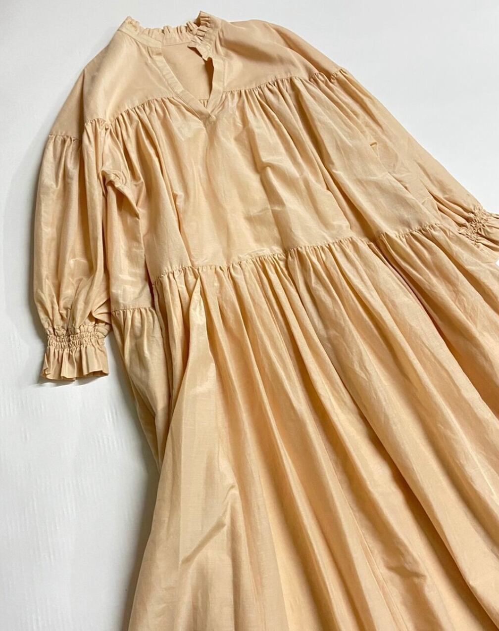 コットンシルクで優しい肌触りのドレスを作りました。今回はたっぷりとした用尺にして広がりが大変美しいシルエットを作っています。とても軽い素材のコットンシルクローンで歩く度に、広がり、その広がりが一度浮くと落ちるのに時間がかかります。その揺れ感と軽さゆえの落ちる緩やかさがとてもロマンティックで女性らしい瞬間ではないかと思います。長年女性として生きてきた中で、女性の美しさは若さ、メイクアップ、そして着る物からの演出の比重が多いと感じます。