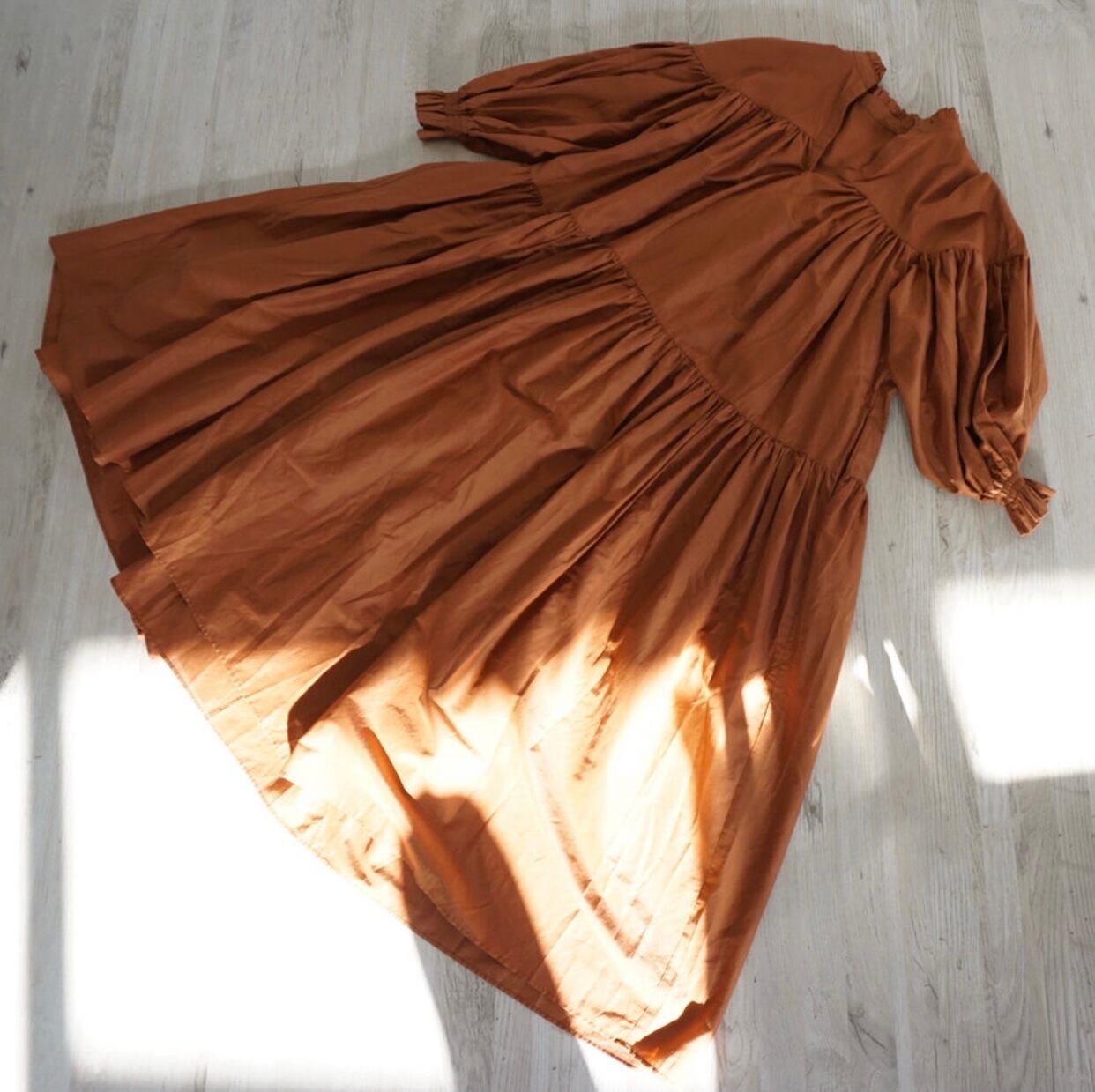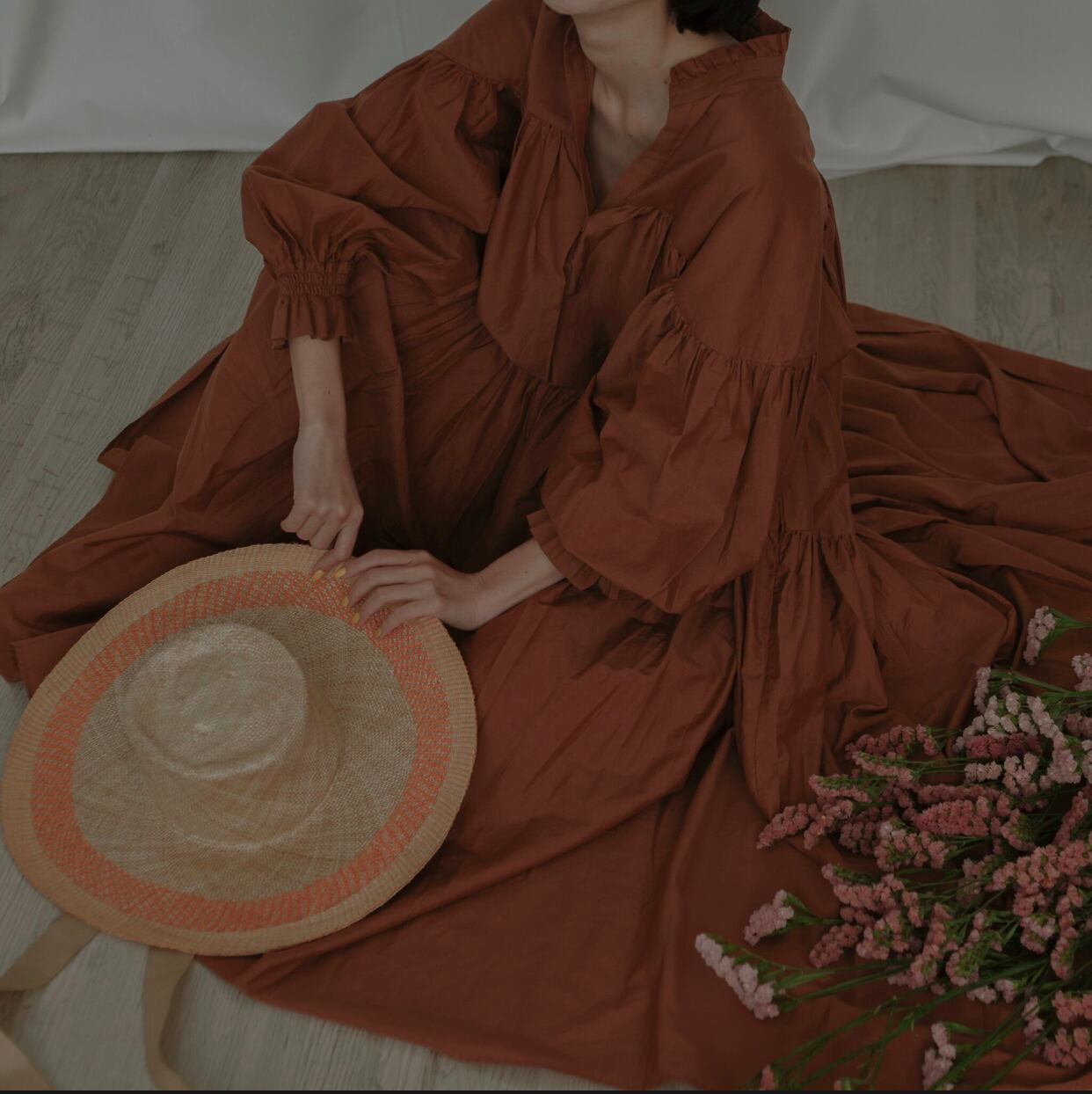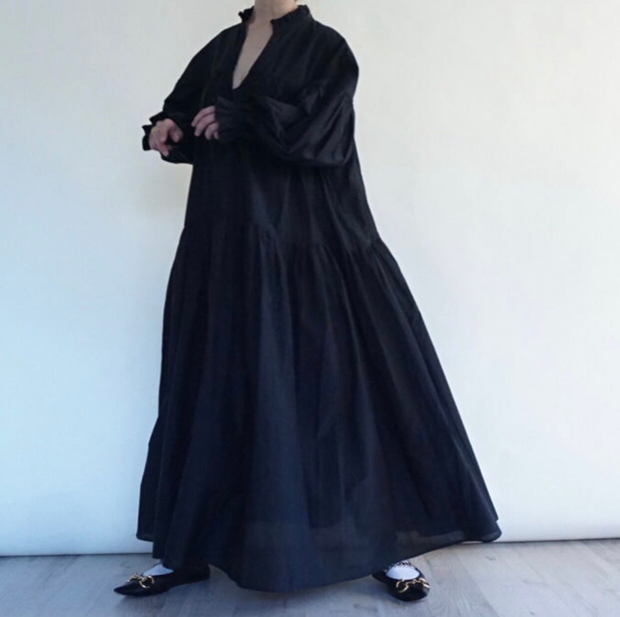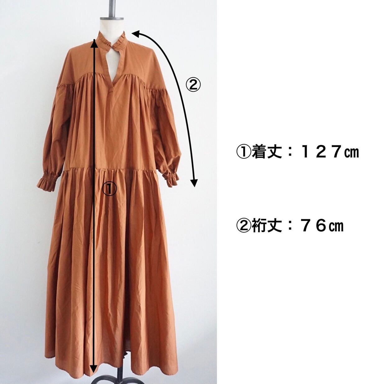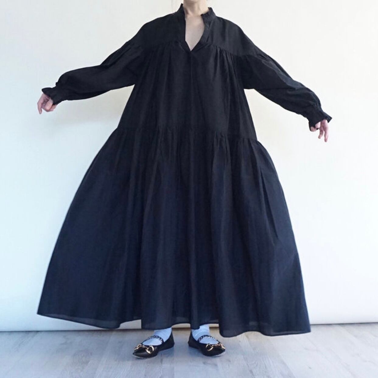 体型がわからないオーバーサイズです。痩せ型の方にもふくよかな方にも向いているドレスですが、特に体型が気になる方には、体型を拾わないのでおすすめです。真夏に一枚で着て、とても涼しく、肌の露出なしに涼しく過ごすことができます。首元は大きめの開きにしました。女性の綺麗なデコルテ部分が少しだけ見えるデザインにしてみました。ですが、首の後ろ部分は襟が高くなっているので日焼け防止にもなります。