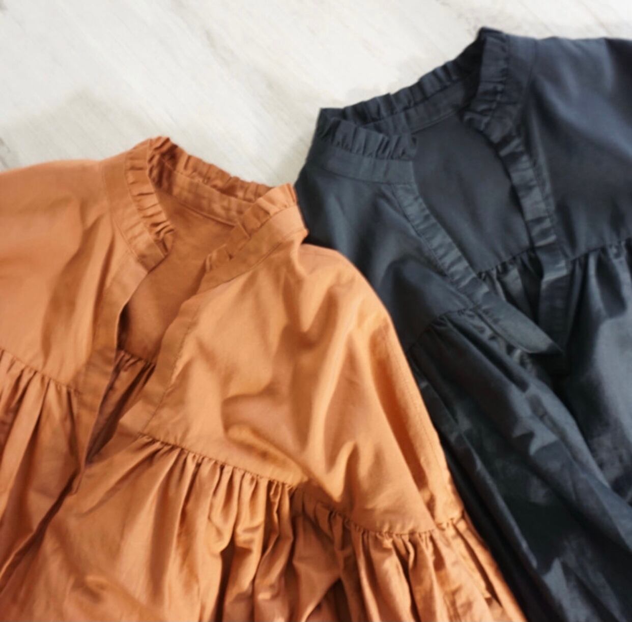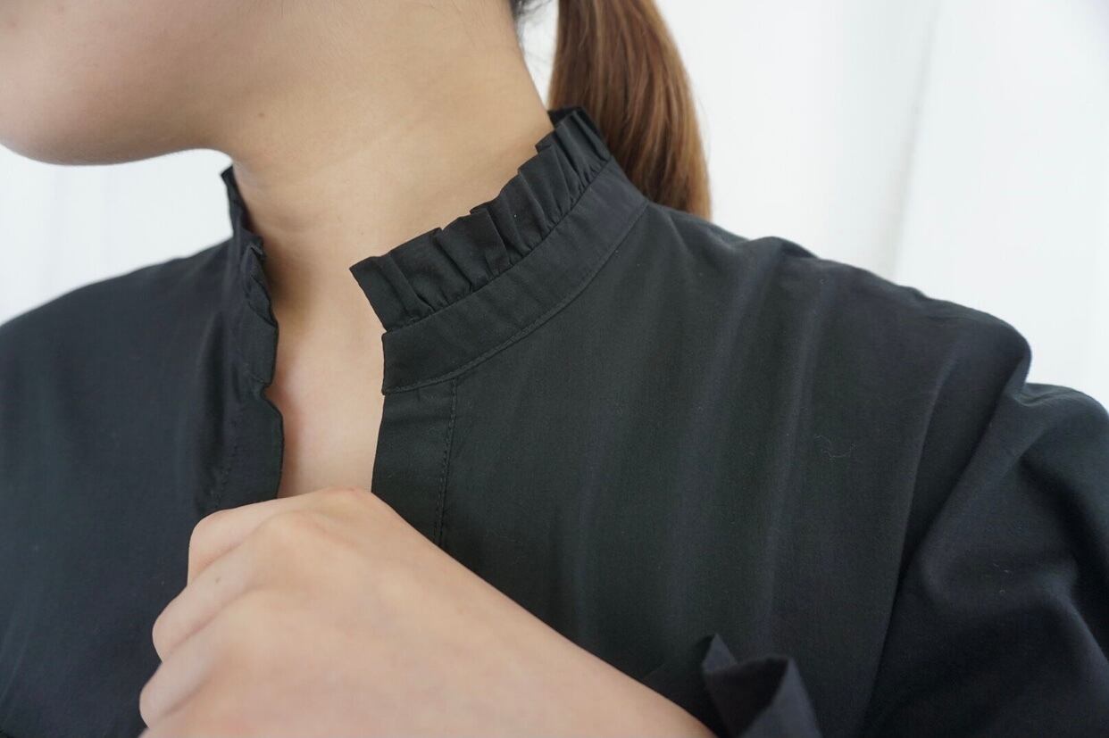 袖口は腕のどの部分でも留まるようにシャーリングのゴムにしてみました。ですので半袖にしたい場合はたくし上げて半袖使用にしてパフ部分を膨らませて着用してみてください。たくしあげて短めの袖のように見えるシルエットも、下ろして長袖のパフスリーブ仕様もどちらもロマンティックなシルエットです。