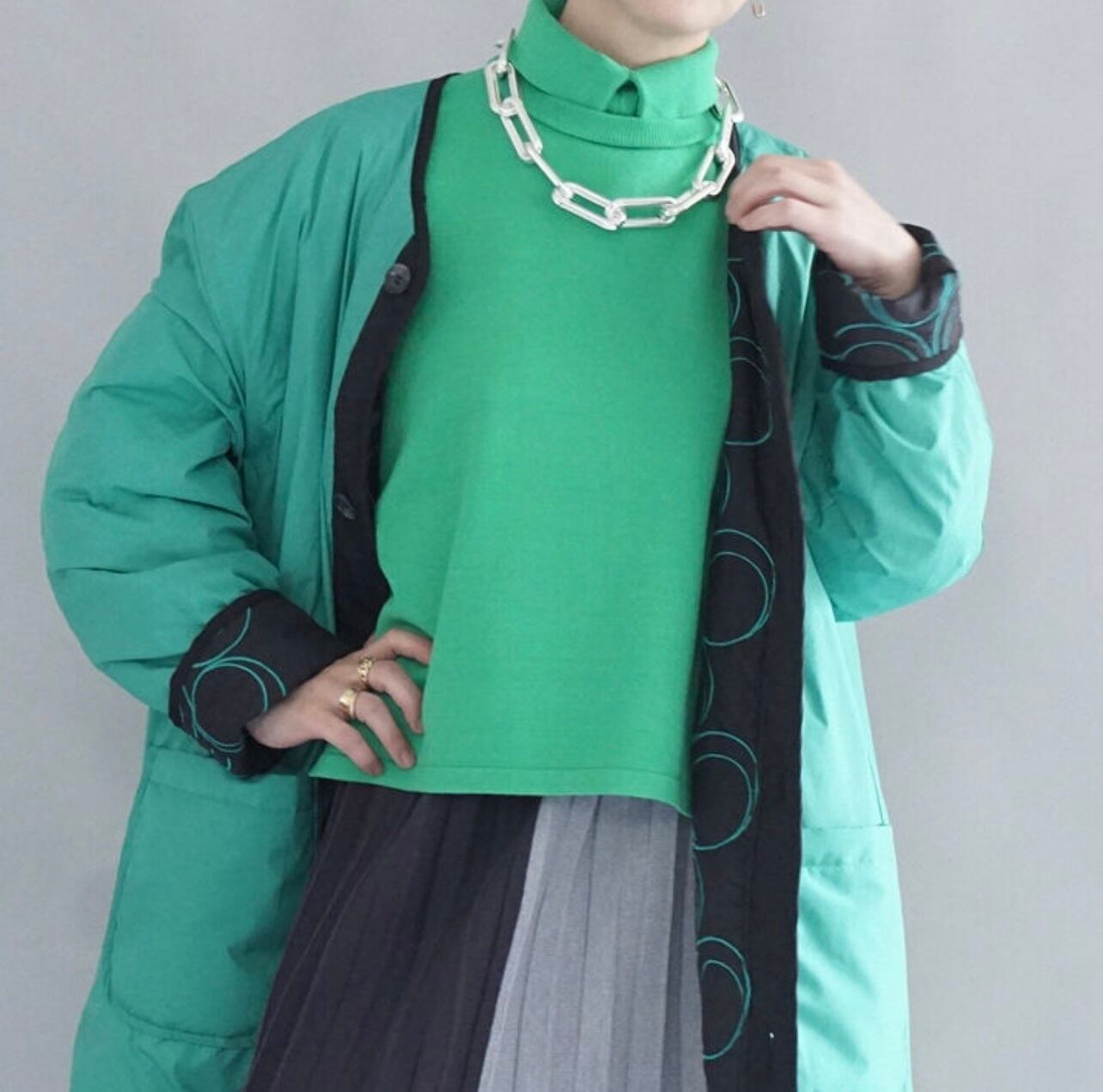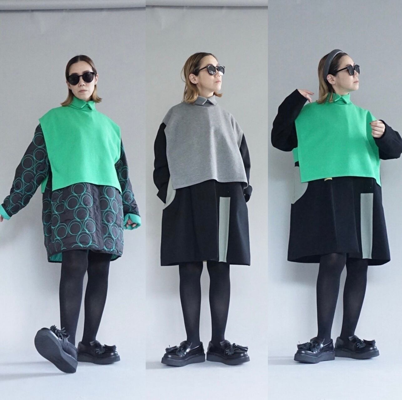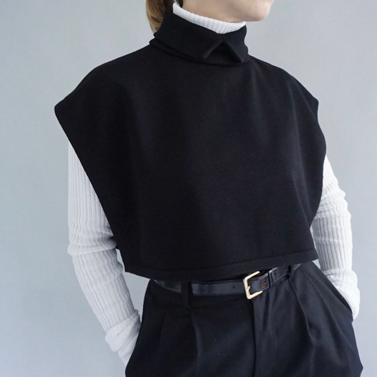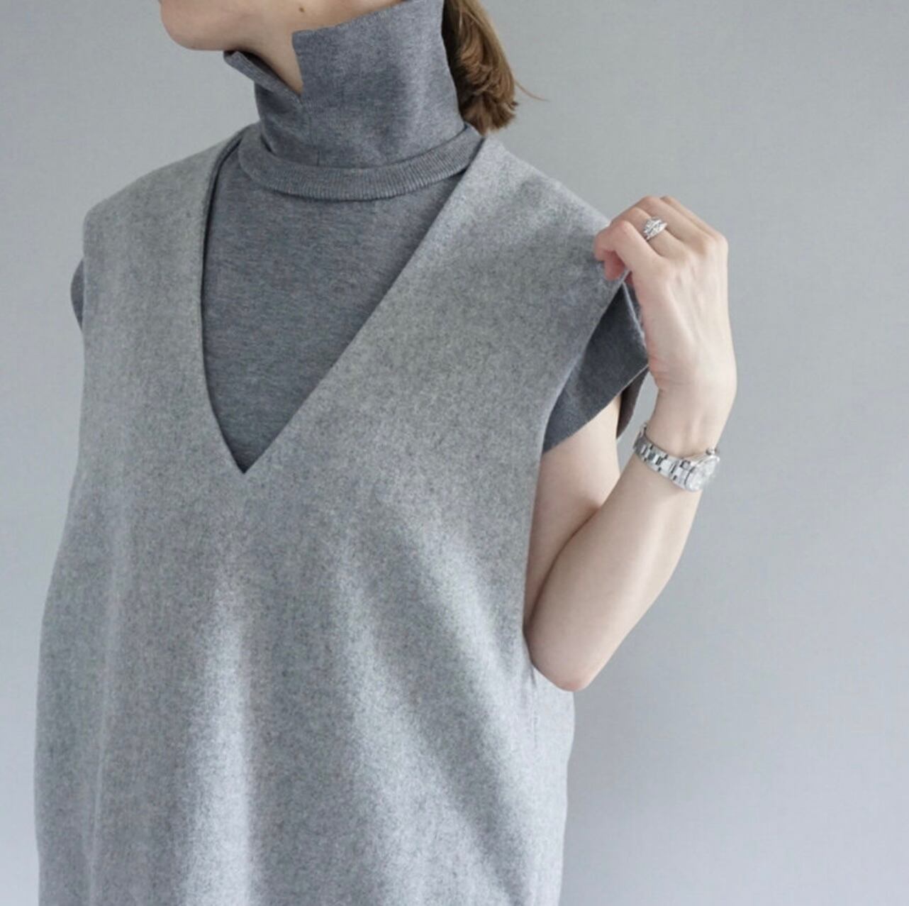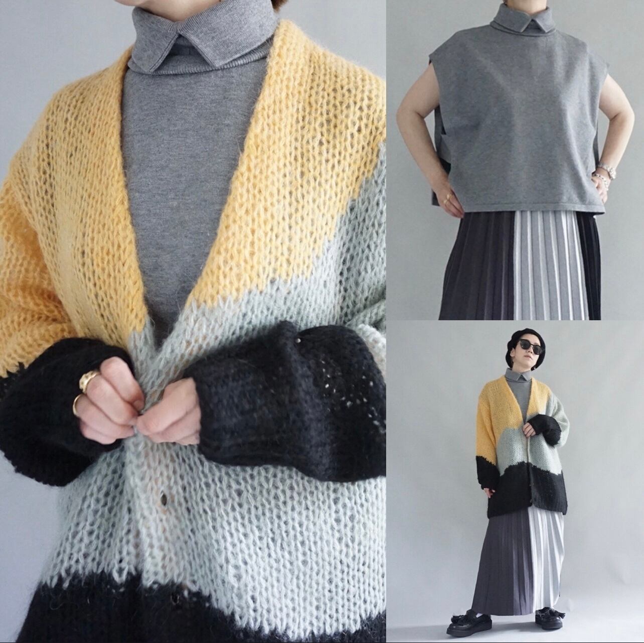 定番的に出していた人気の襟付きニットのネックウォーマーバージョンを作ってみました。今回もこの糸はレーヨンポリにスパン糸が入りコットンライクでサラッとした肌触り。以前は毛玉が出来にくくとても使いやすかったので何色も購入して良かったとわざわざ連絡をくださるお客様もいらしたほどでした。ベスト感覚で着ることができます。また寒い日にはニットの上から着用も可能。春夏はインナーにTシャツ、カットソーなど。真夏日以外はヘビーに使い回すことができると思います。スタッフのお勧めはグリーン。私も今回は購入候補に入れています。お勧めは飽きこないブラックのはずでしたが、サンプルが出来上がってくると、グリーンの目が覚めるような発色の良さに惹かれています。大人っぽくオフィスでも使えるのはグレー。綺麗めのパンツに合わせてパールなどを合わせればオフィスカジュアルでも使っていただけるのではないかなと思います。着丈は今年っぽく短めにしました。ワイドパンツなどでもスタイルアップして見えると思います。またほどよい厚みなのでボトムにフロント部分だけインしても良いかなと思いました。