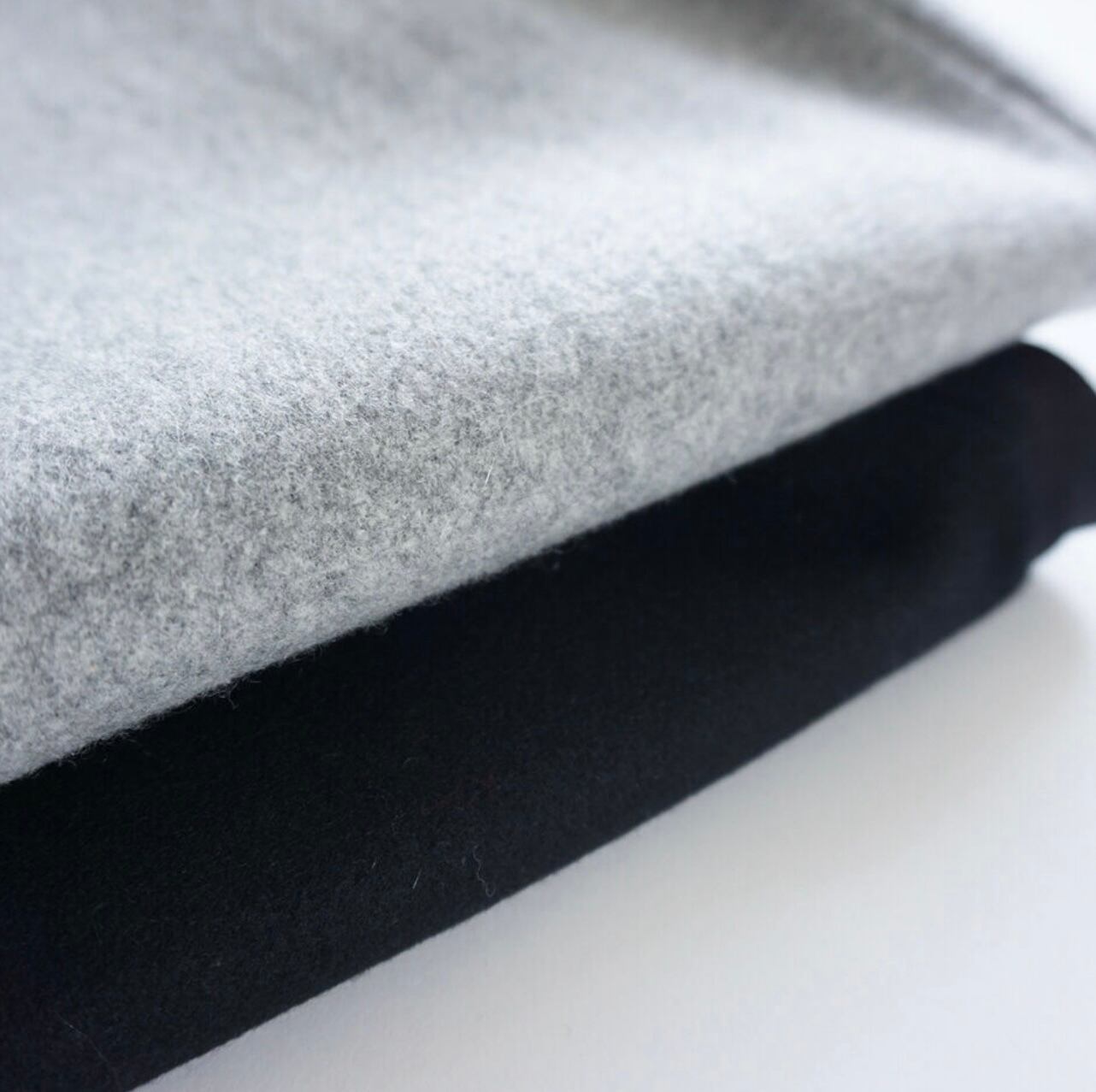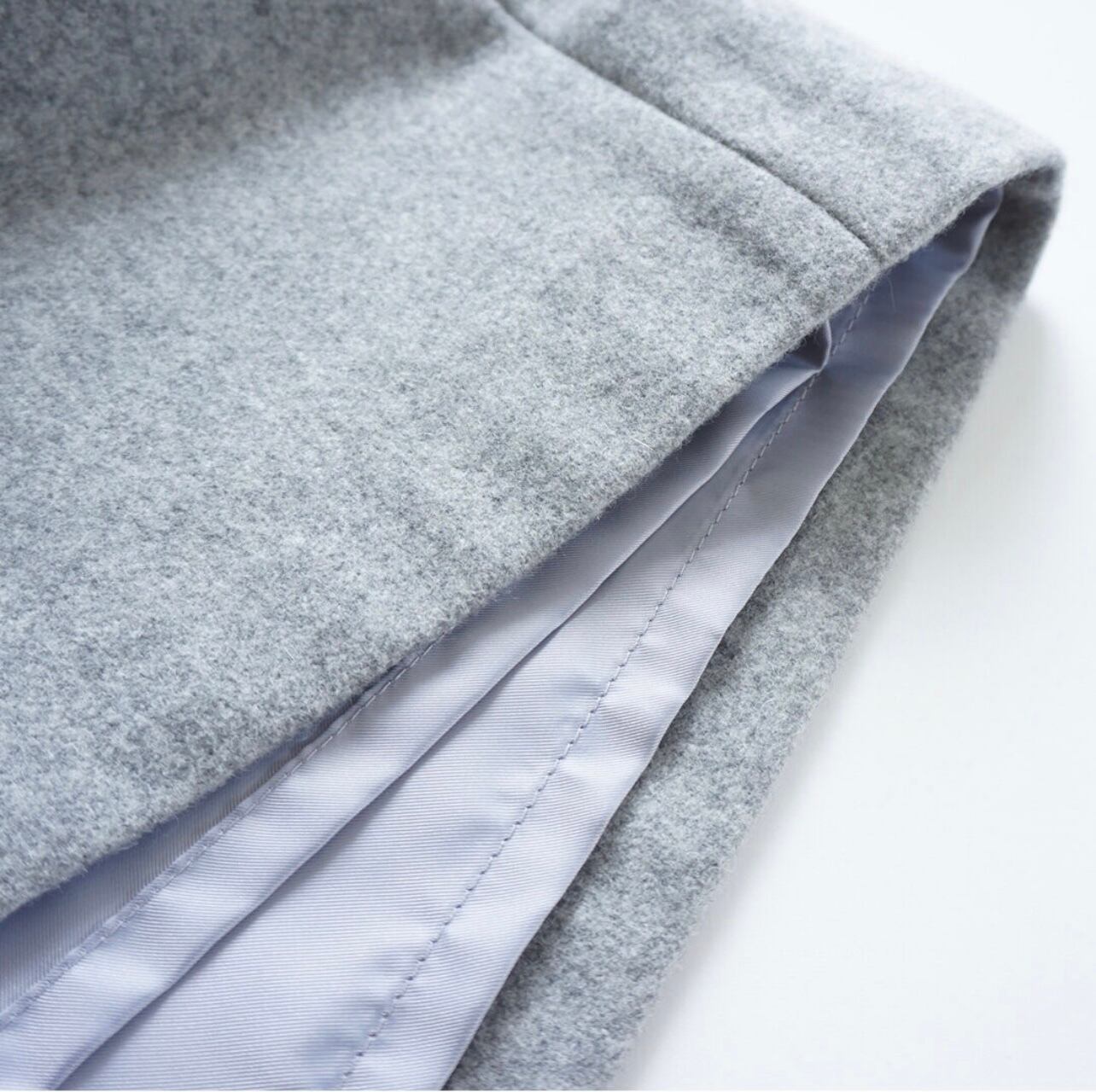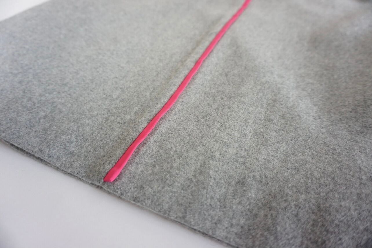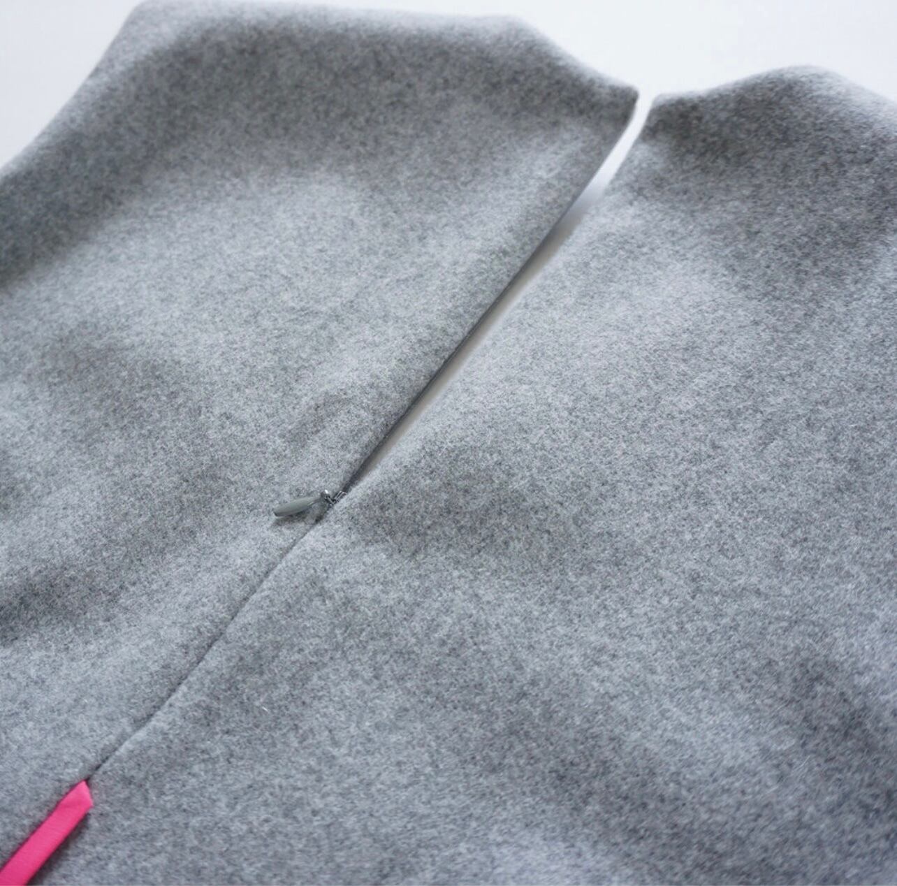 後ろ身頃の接ぎの中央にラインを入れています。グレーにはトキシックピンクのライン、ブラックにはターコイズブルーのラインを入れました。前から見るとシンプル、後ろから見るとちょっと変わった蛍光色のラインとぽってりとしたメルトンとの組み合わせが意表をつく新鮮なカラーリングになっているところが気に入っています。お勧めはブラック。中に同じく予約販売中のタートルニットやニットプリーツスカートを入れて着るとコーディネートが完成します。