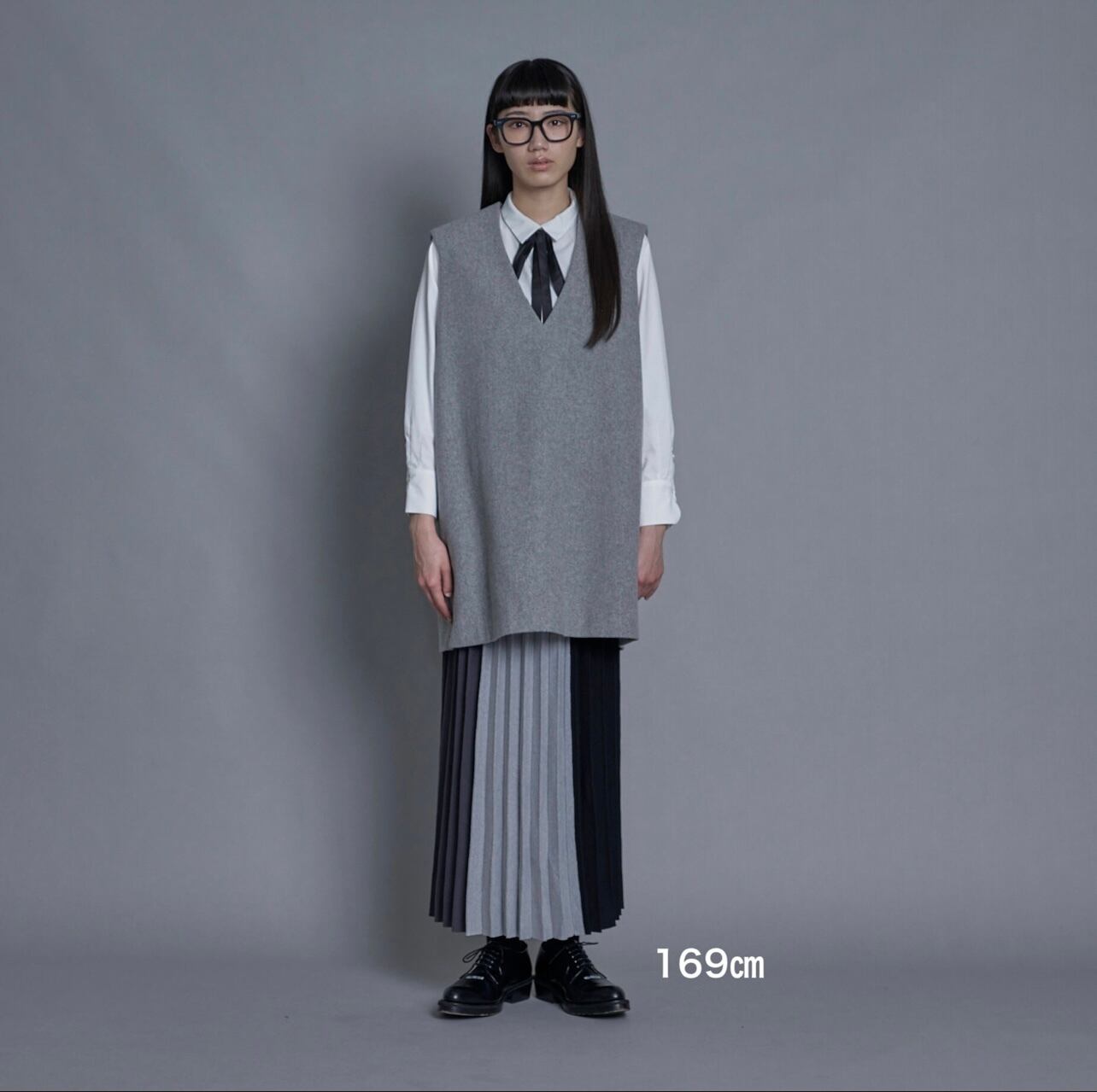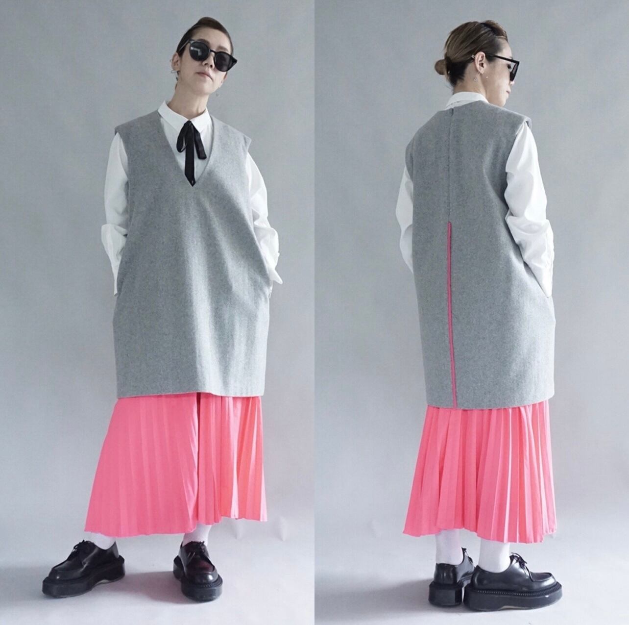 Vネックのシンプルなワンピース。ベストとしても着用可能です。やや薄手のメルトンに裏地をつけ滑りを良くしています。
