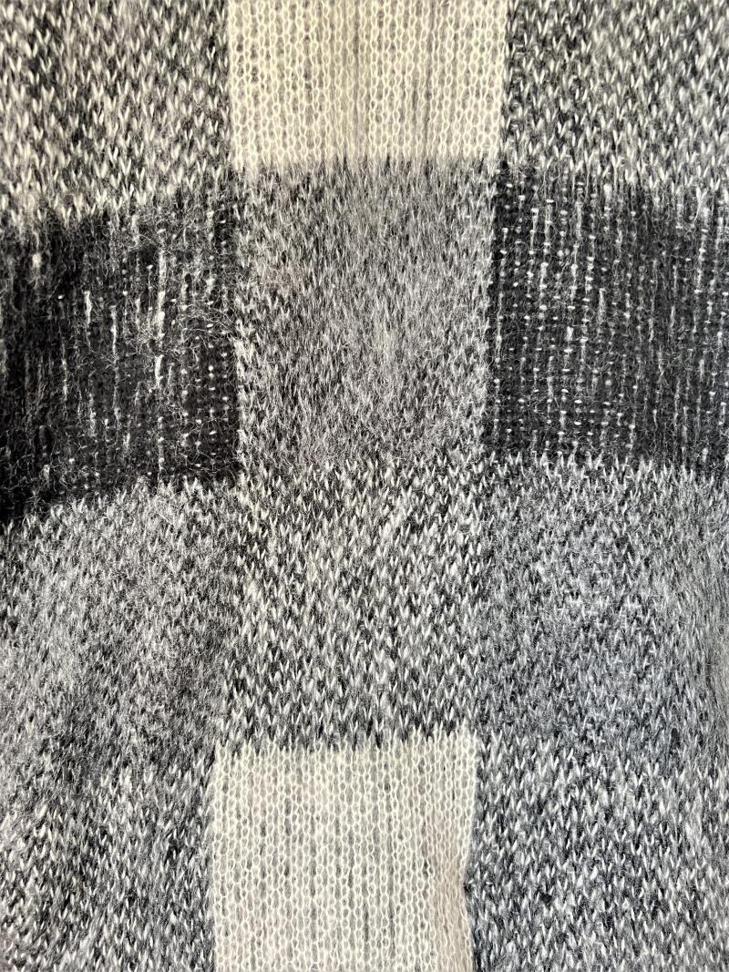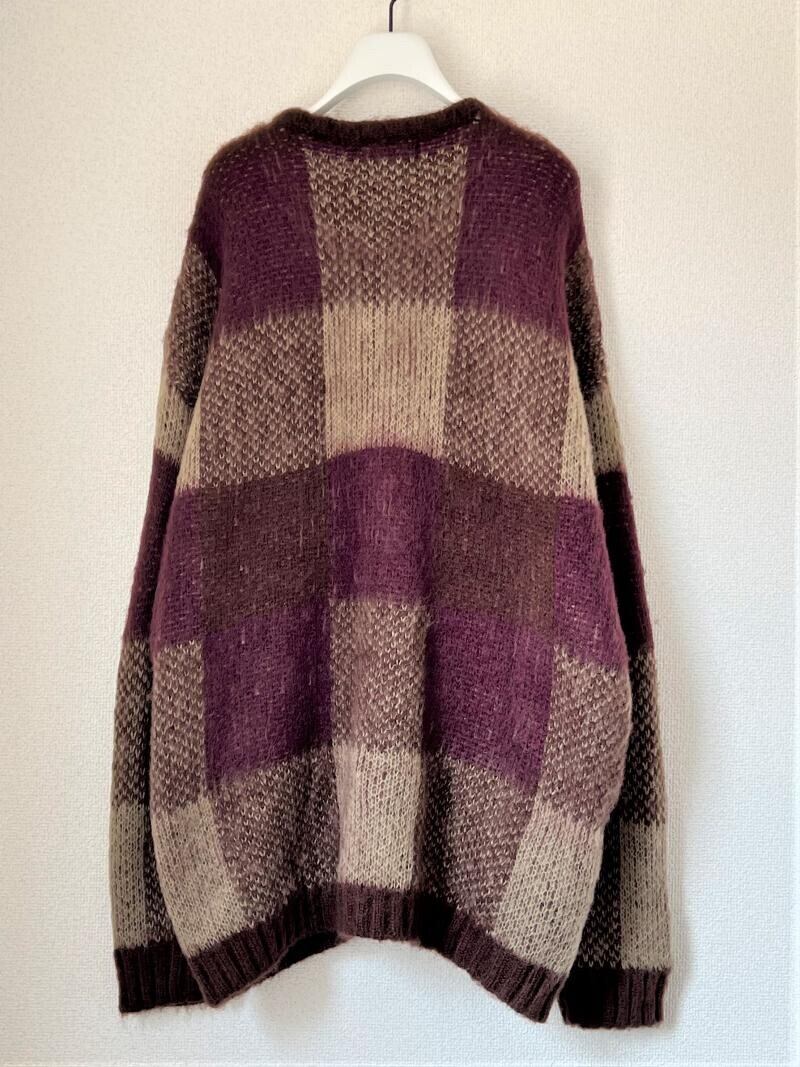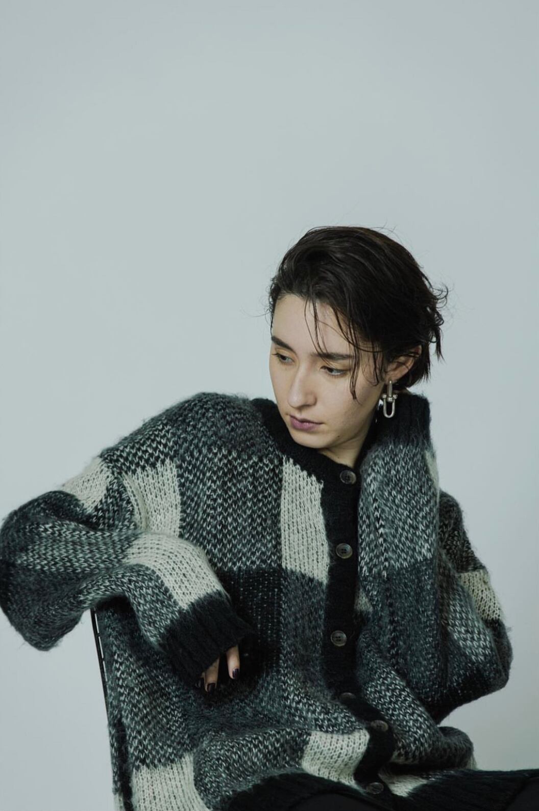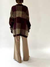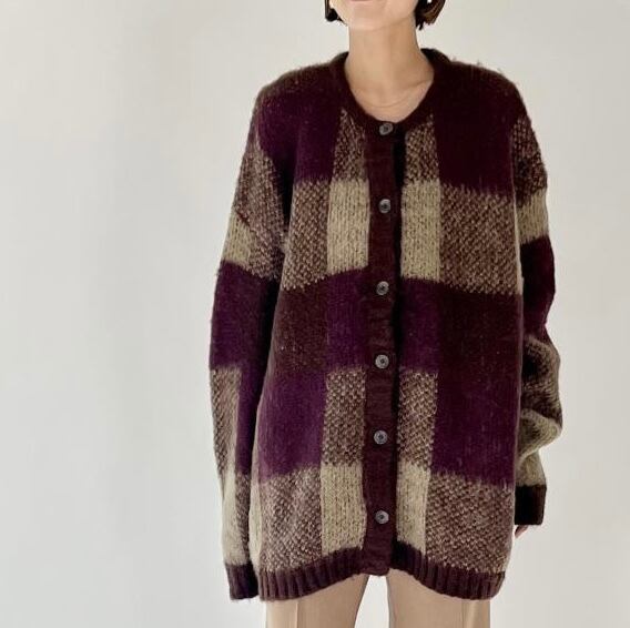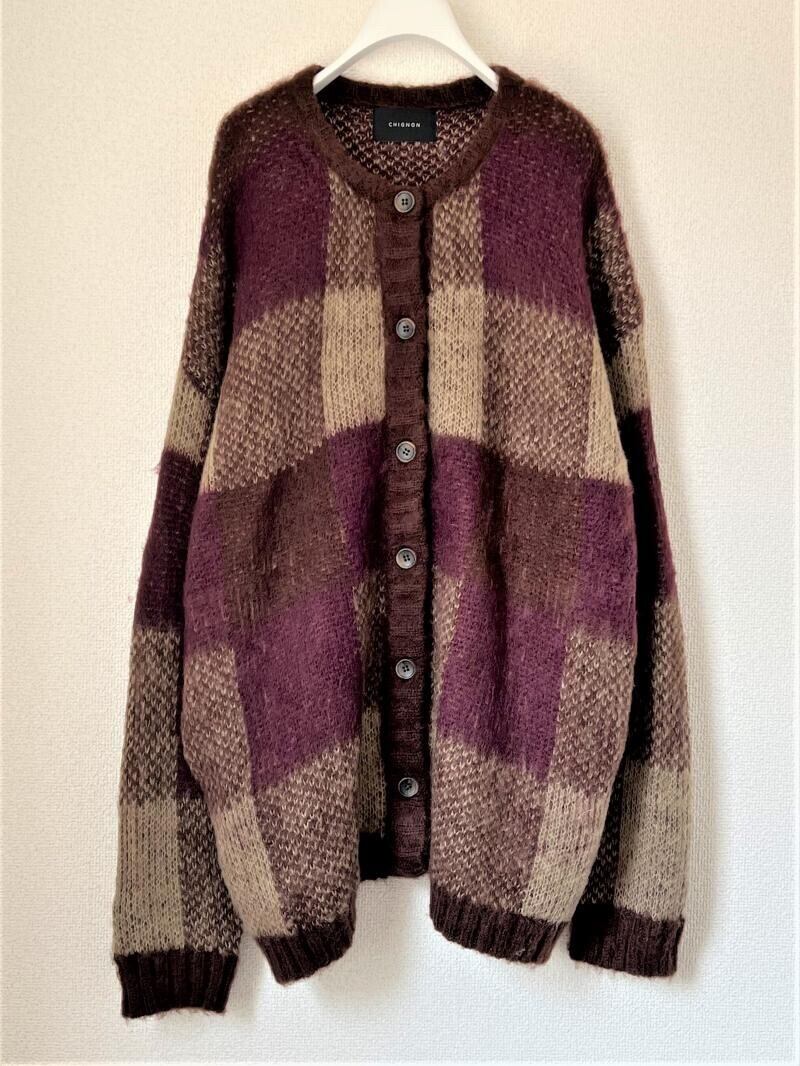 前回よりも少し肉感のあるモヘヤ素材を使用した、チェックジャガード柄のニットカーディガンです。