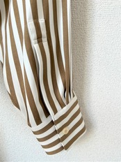太めピッチの先染めストライプで合繊素材のシワにもなりにくく程よい落ち感がある生地を使用したシャツです。