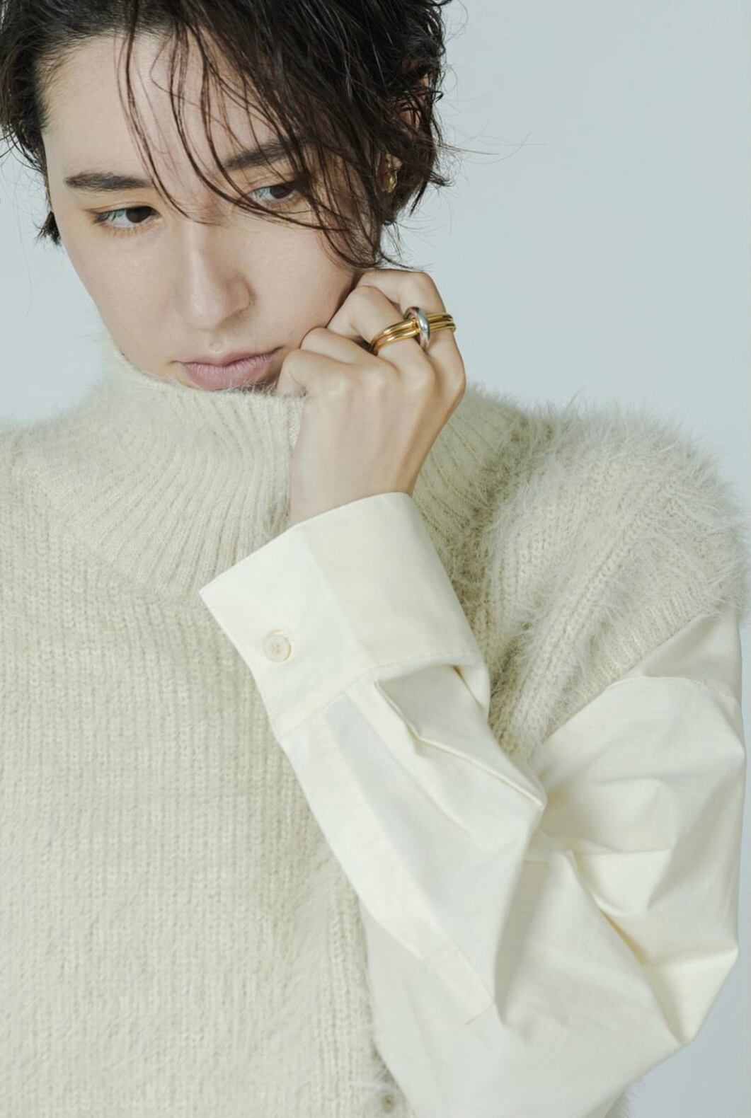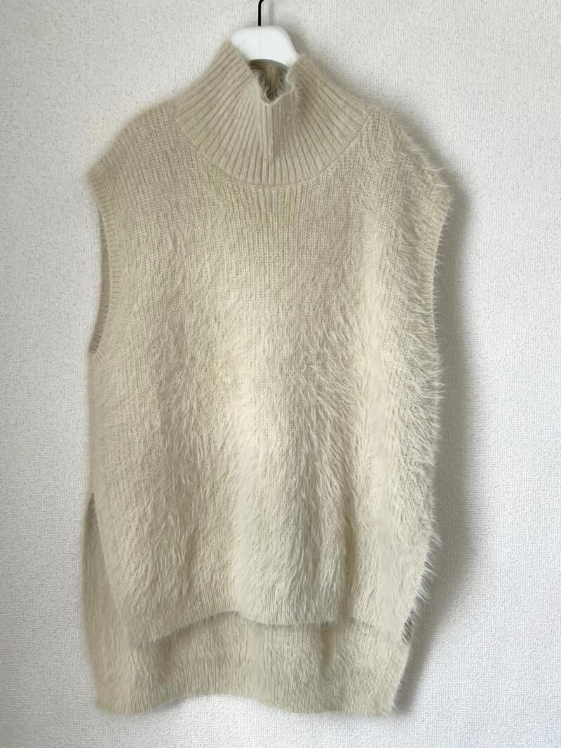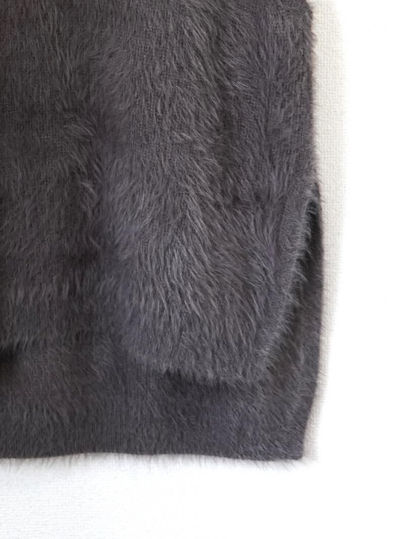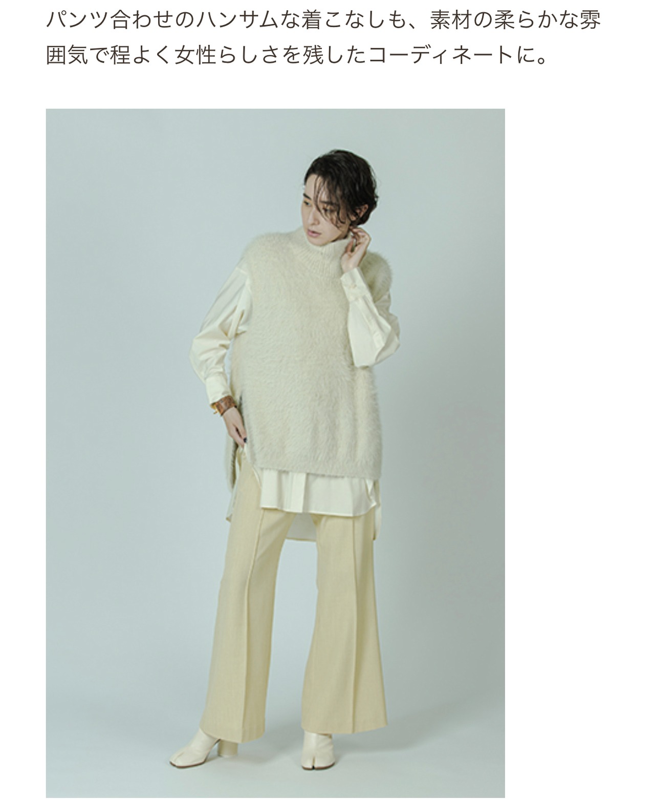 毛足があり、ボリューム感ある素材のニットですが、両脇の深めのスリット明きと、前後の丈差でスッキリとした印象に仕上げています。