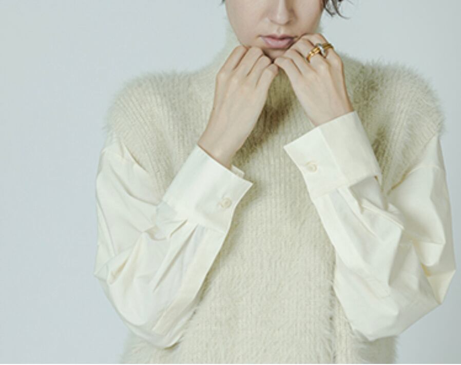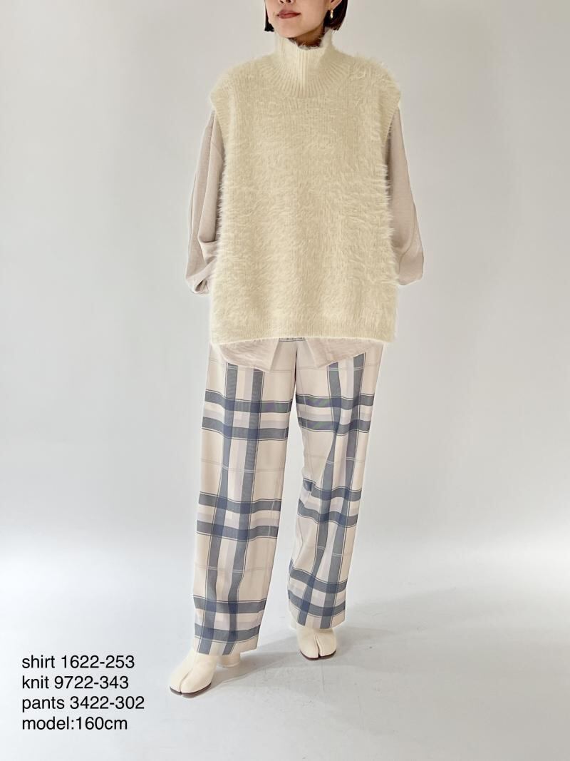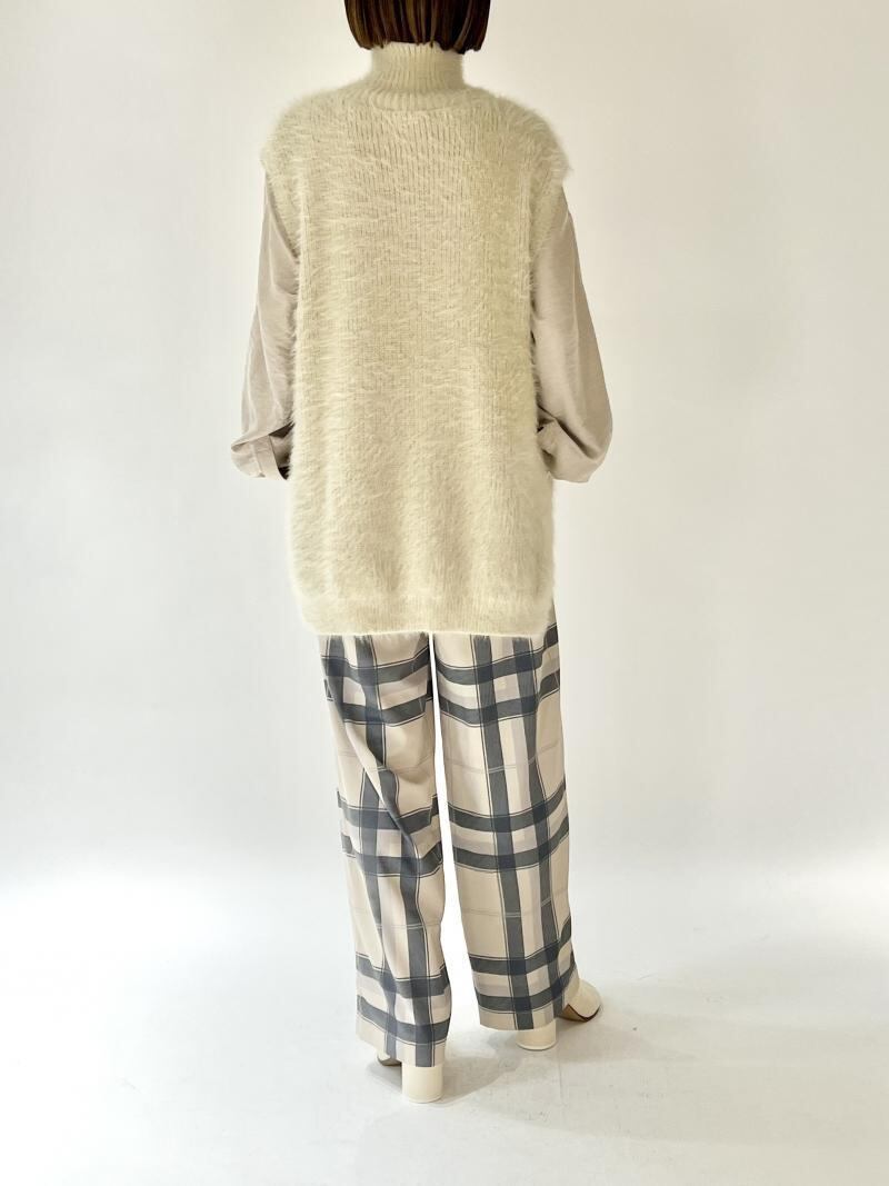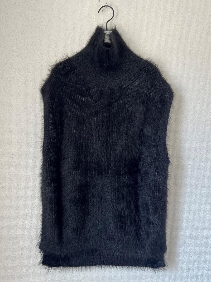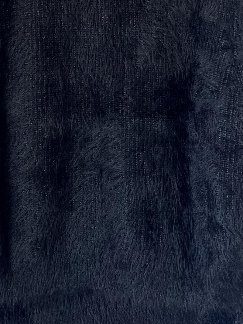 毛足があり、ボリューム感ある素材のニットですが、両脇の深めのスリット明きと、前後の丈差でスッキリとした印象に仕上げています。