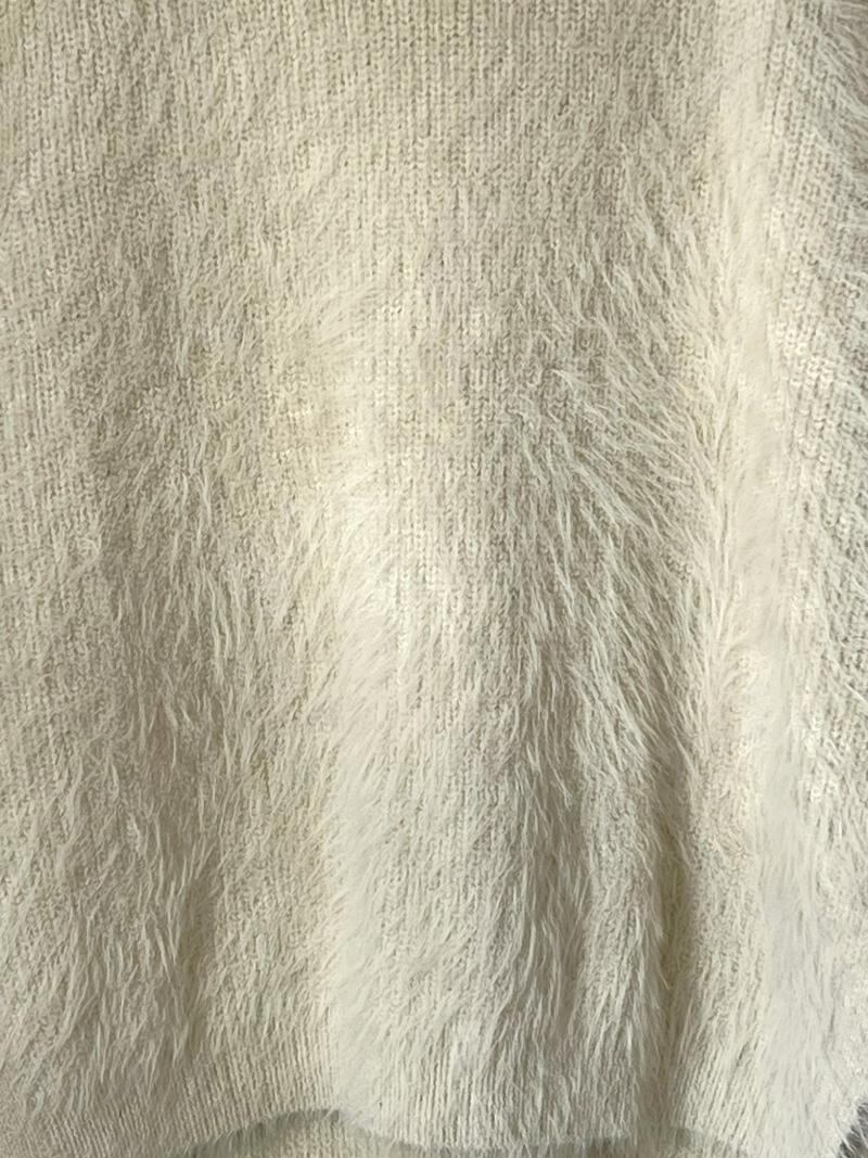 とても肌触りがなめらかで、ふわふわなタッチがかわいい印象の糸を使用しています。やわらかい糸を使用しているので、着ぶくれせず、肌なじみも良いです。