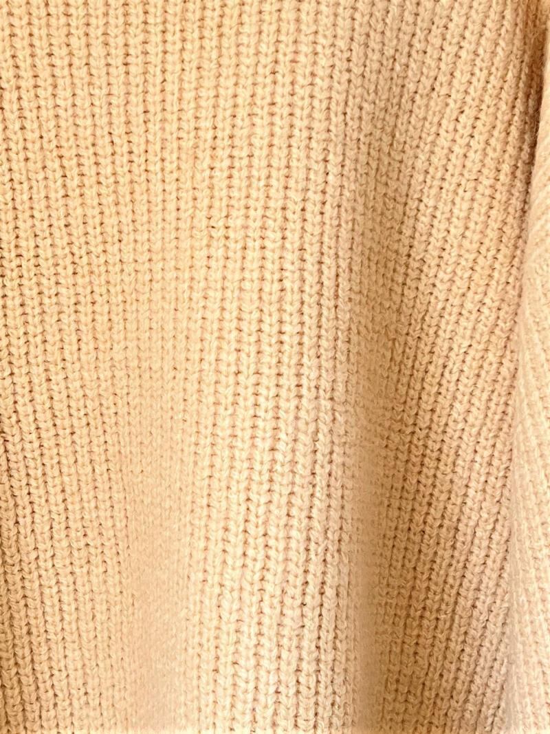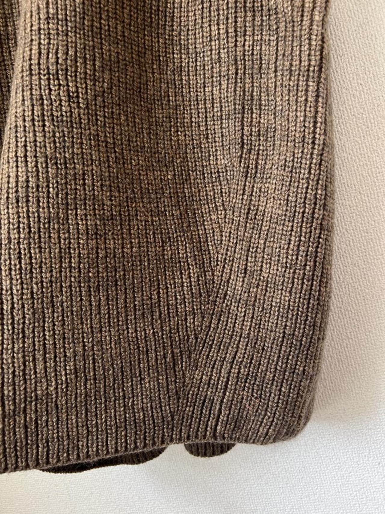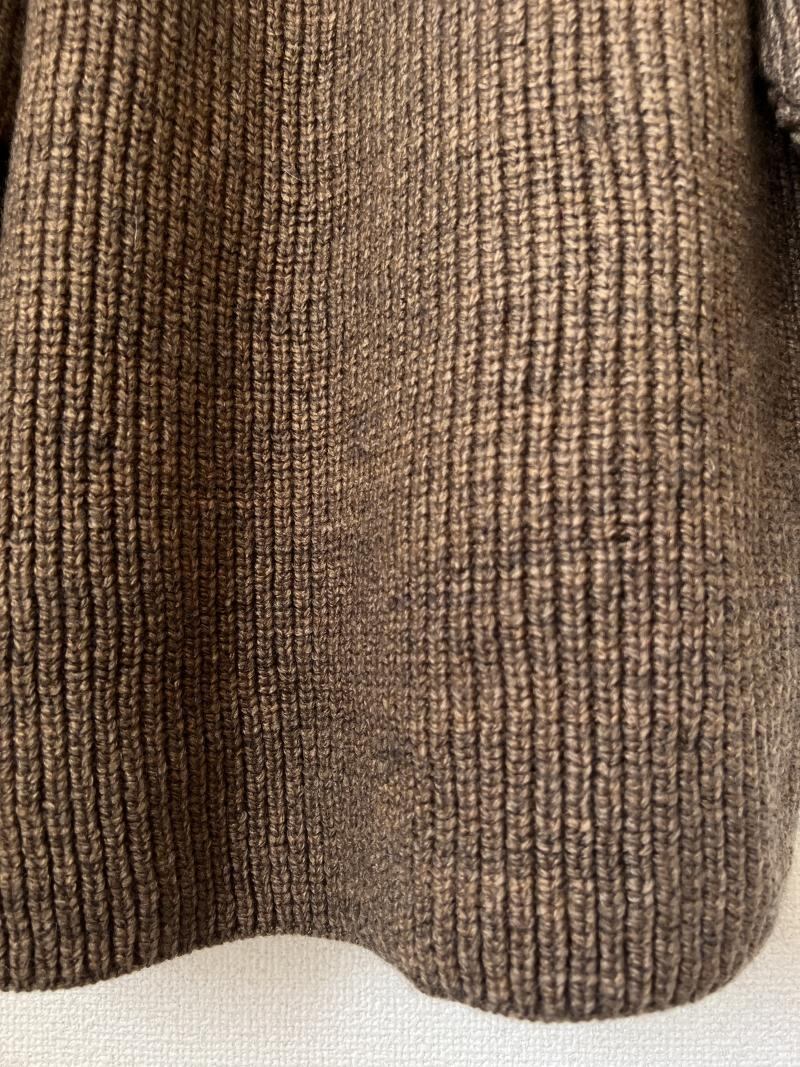 ニットならではの前裾のみに入れた減らし目や、前振りの脇線、そして少し前肩になっていますが着用時はそちらを肩にあわせて着用して頂くと、後ろに少し丸みがでるようなシルエットになります。