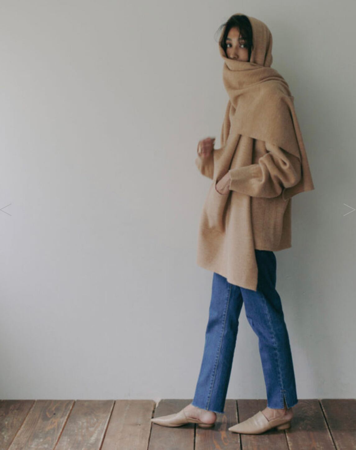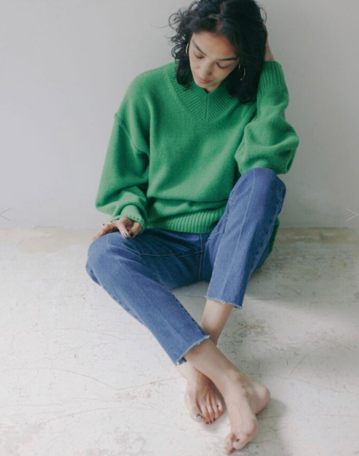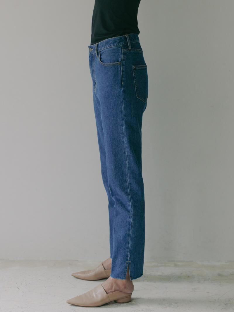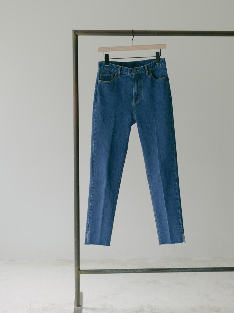 裾は切りっぱなしにしてカジュアルさをいれているのと、スリットをいれることでブーツからフラットシューズやパンプスまでいろいろな靴に合わせやすいデザインになっています。