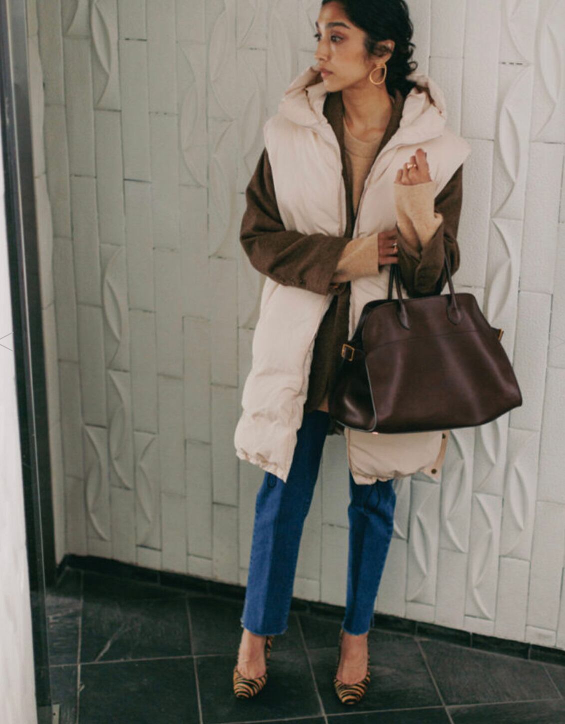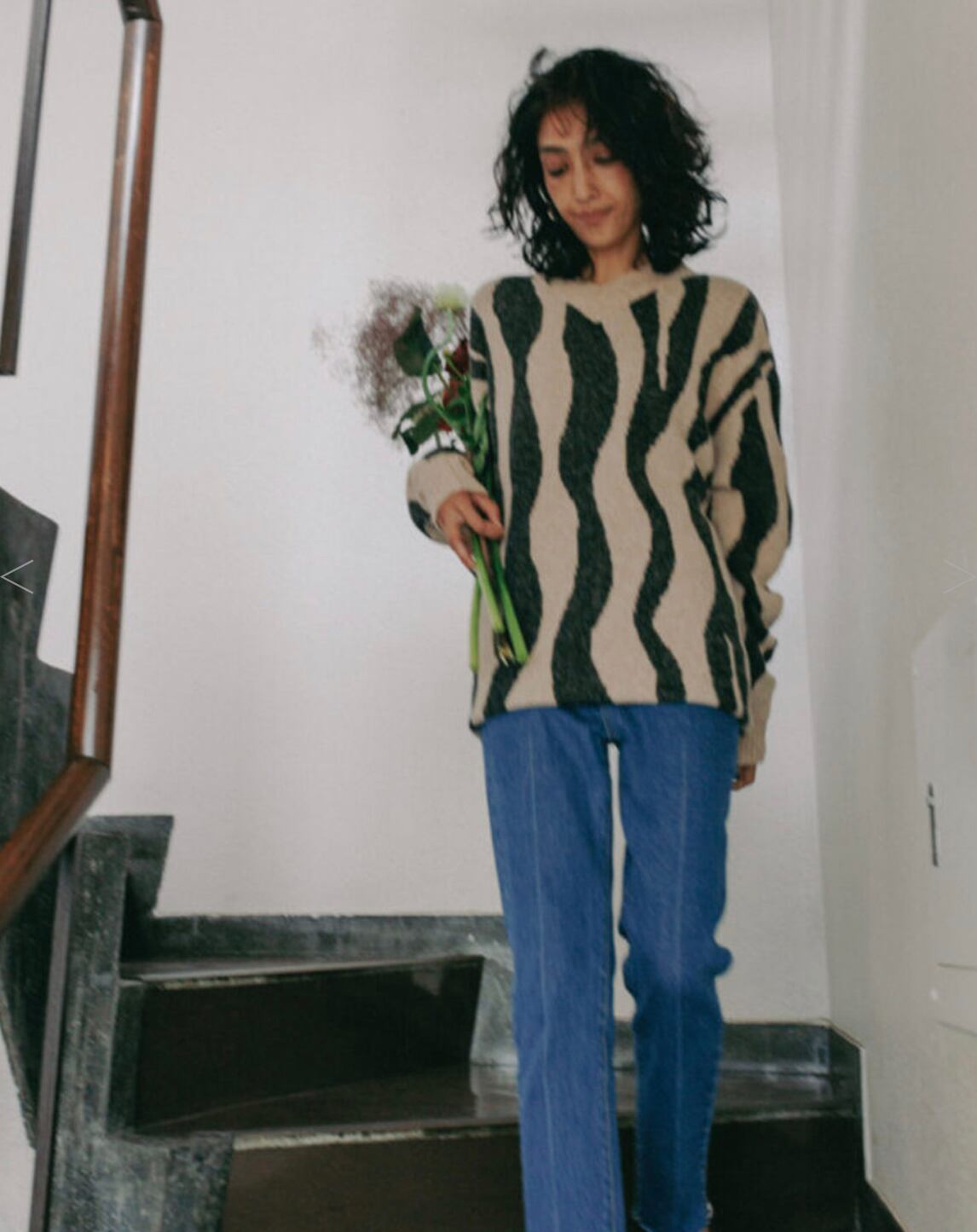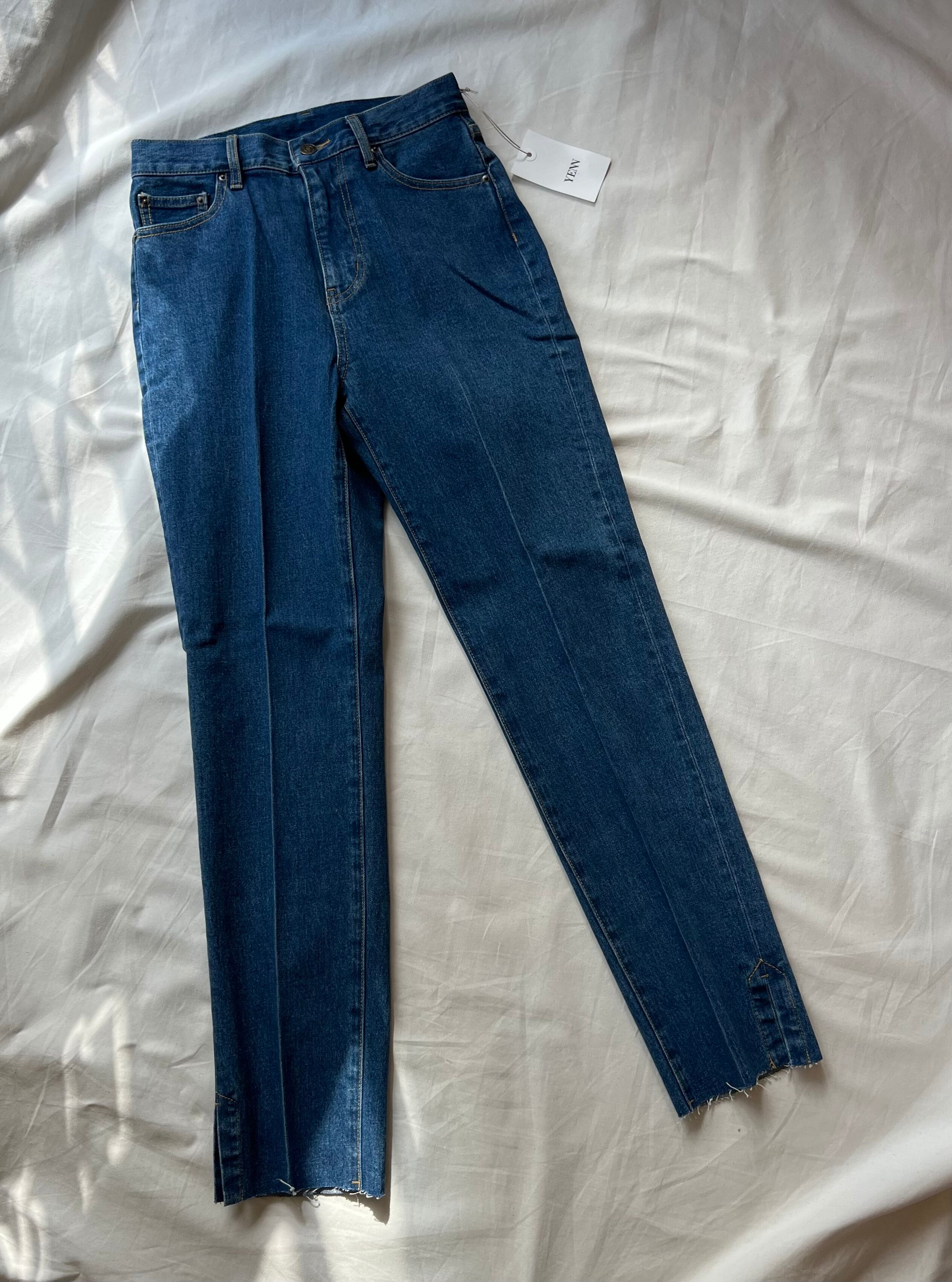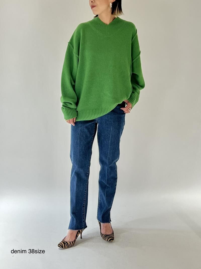 裾は切りっぱなしにしてカジュアルさをいれているのと、スリットをいれることでブーツからフラットシューズやパンプスまでいろいろな靴に合わせやすいデザインになっています。