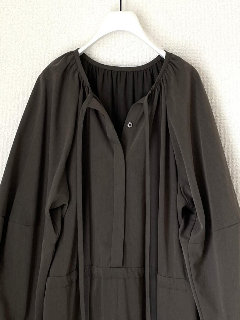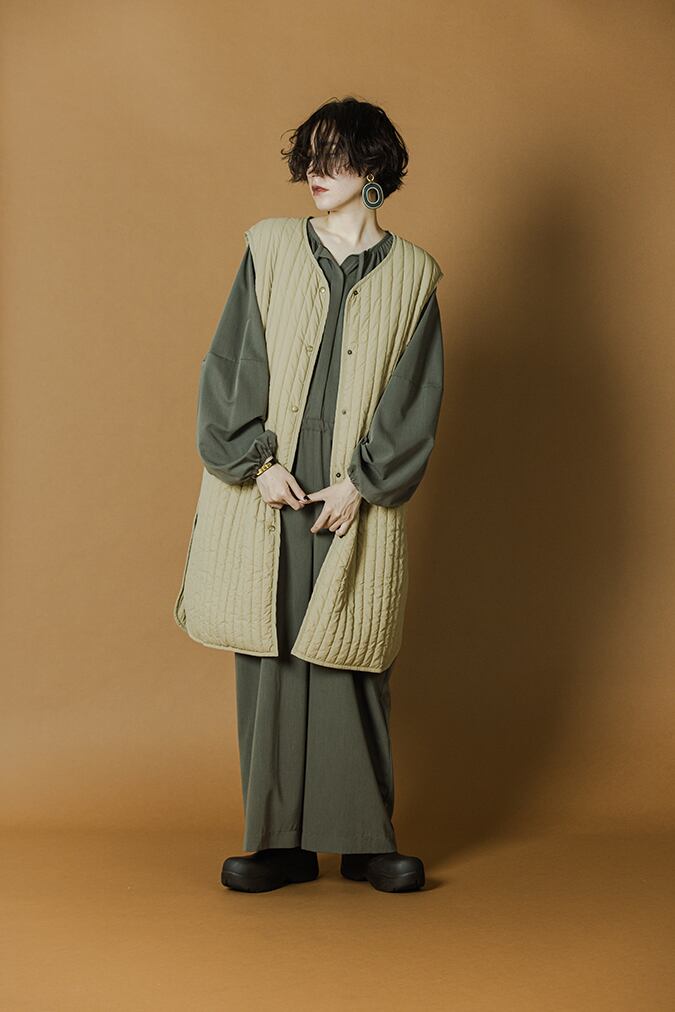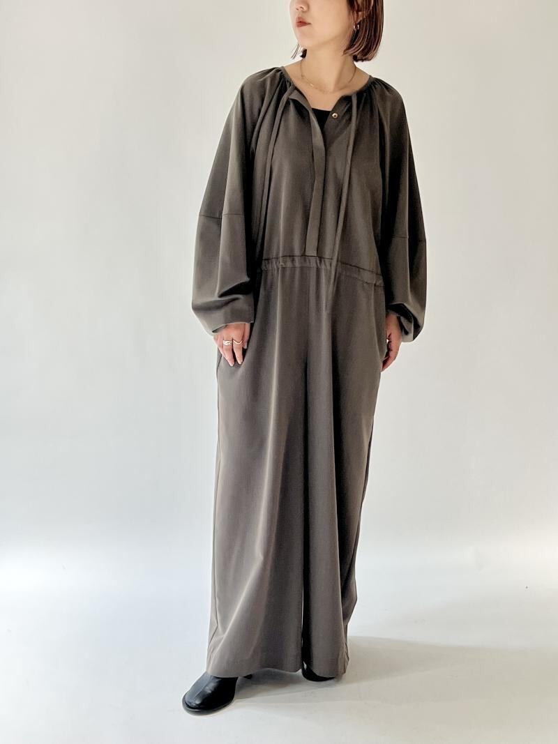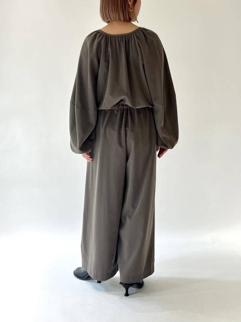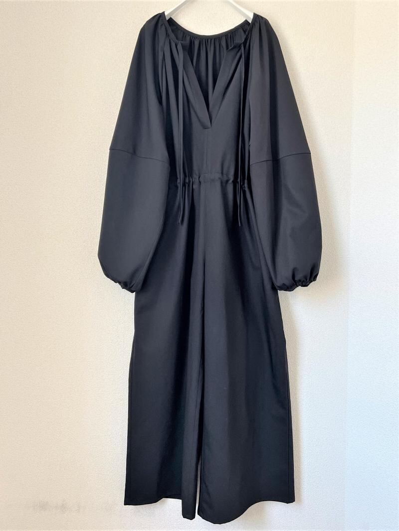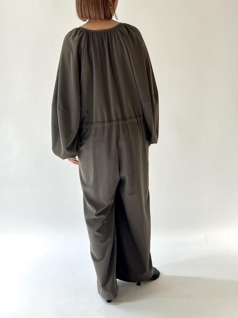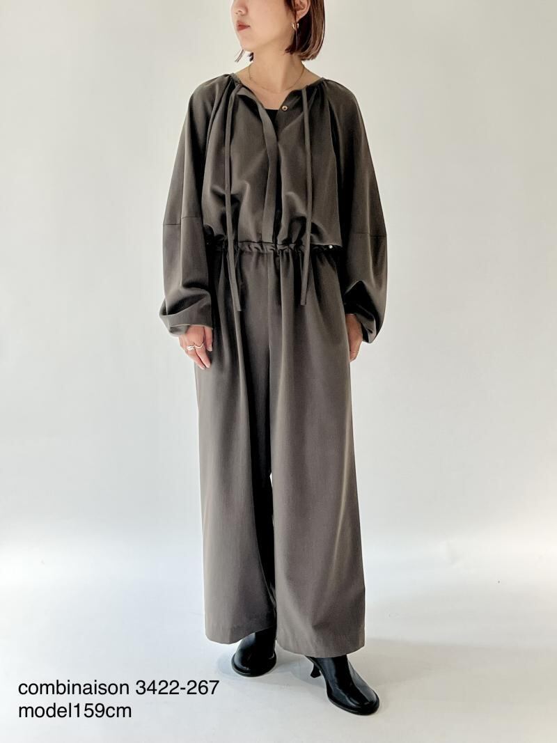 ギャザーたっぷりのデザインや袖ボリュームのデザインで甘くなりすぎないよう調整し、きちんと感のあるコンビネゾンに仕上げました。