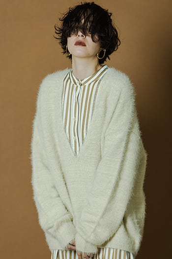 フェザーヤーンの糸がかわいいニットプルオーバーです。