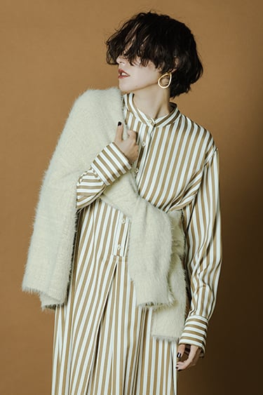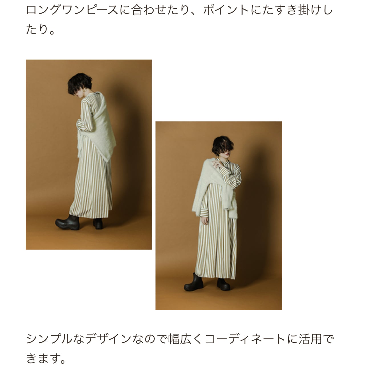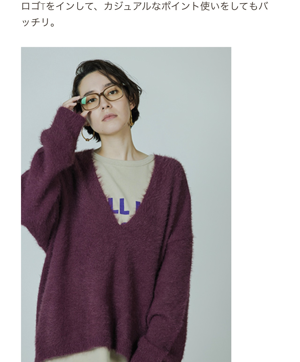 シンプルな形に落としているので、とても使いやすいニットです。是非ロンTeeレイヤードや、ワンピースレイヤードで楽しんでみて下さい。