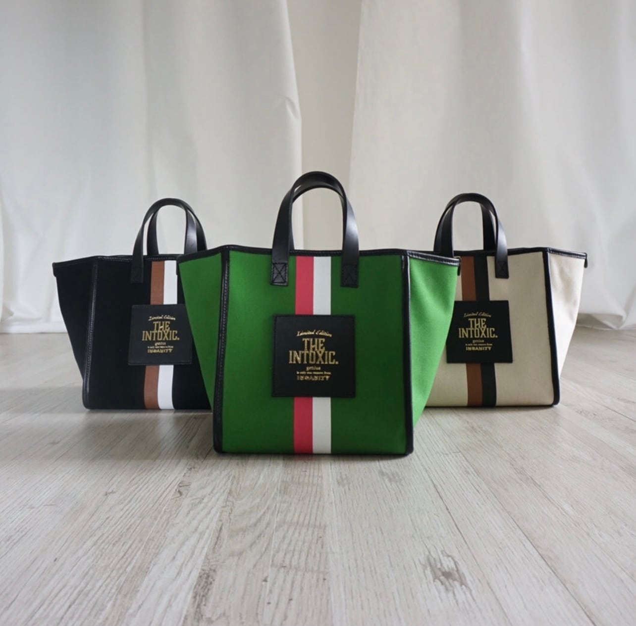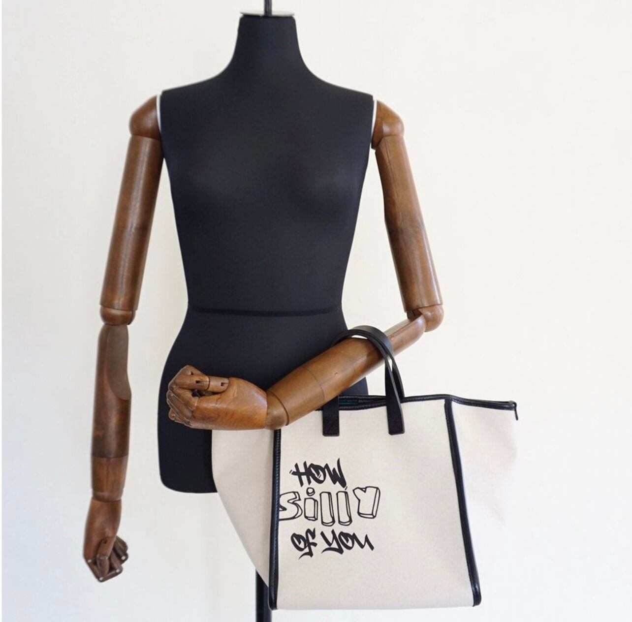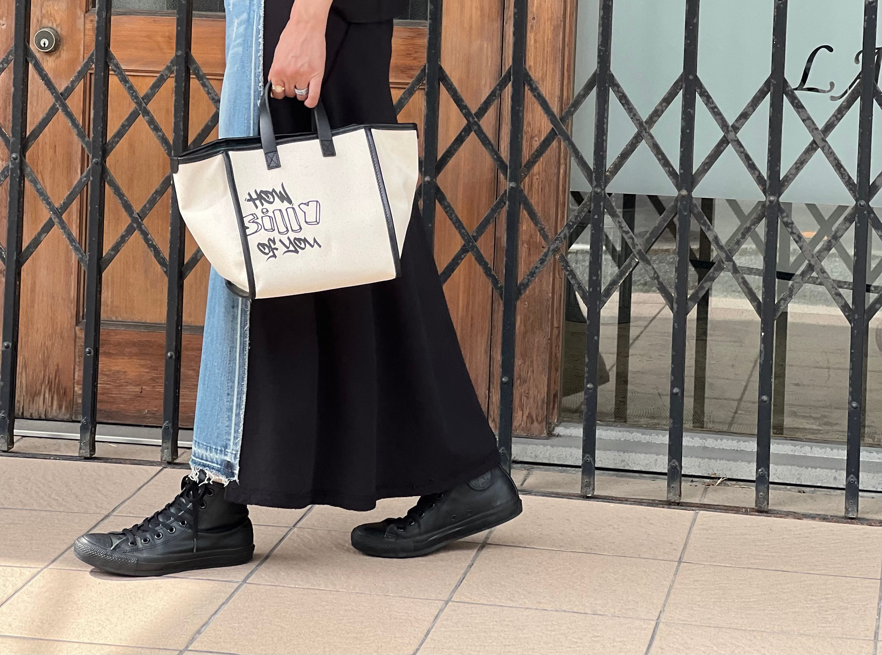 今回のデザインは以前のアーバンシリーズを変更し新しい形にアップデートしました。今までよりもさらに都会的なエッセンスの入った形です。レザー部分は日本製の革を使用し柔軟性のある柔らかいレザーパイピングをしています。ハンドルは硬めのトスカーナ産ステアレザーを使用。耐久性があり持ちやすく汚れや傷も心配にならずに使っていただけます。金具もしっかりとしているものを選びました。両面にプリントを施して片側のフロント部分にはリミテッドタグ、今回は厚みのあるレザーをタグにし、箔押しでロゴを入れています。またラインも入っていてアイビーな雰囲気を醸しています。もう片側の背面にはグラフィティーのロゴを入れました。ストリートを思わせる手書き風のロゴがカジュアルな印象になっています。今回のモデルはそれぞれの型ごとにロゴを変えています。このバッグには<HOW SILLY OF YOU>君はなんてくだらないことしてるの?というニュアンスの意味の言葉を入れました。