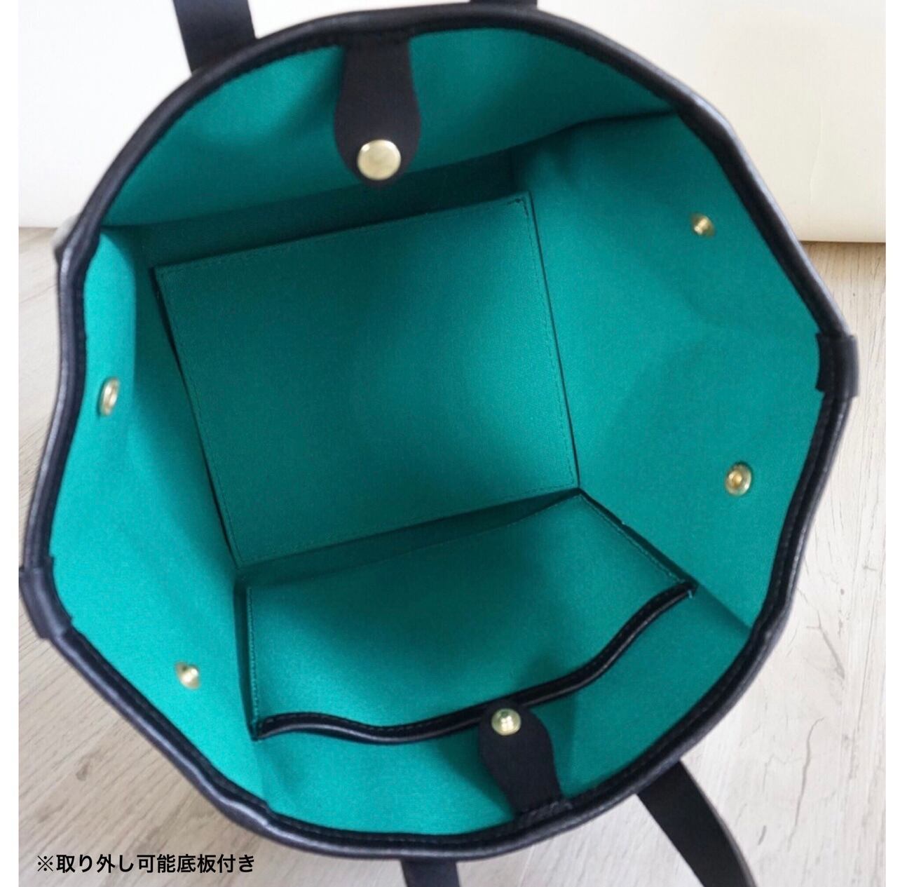 今回のポイントは2つのハンドルの付け根を狭くし、可愛らしい雰囲気を作りました。マチ部分を中に収めるとさらに小さく見えて変化を楽しめるようにしています。