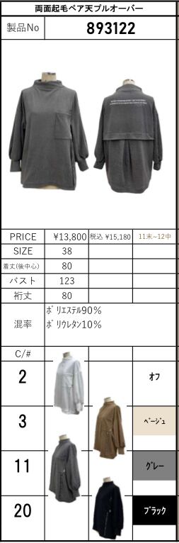 予約販売【 ayane 】両面起毛ベア天プルオーバー(893122)