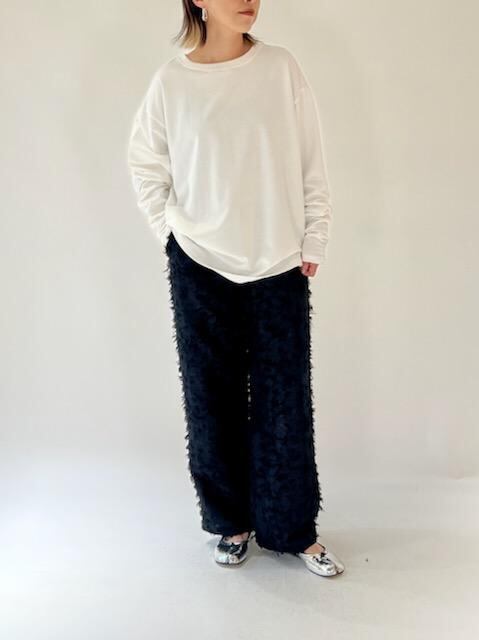 身頃はルーズなサイズ感にし、袖丈を長めに設定しているのがポイントです。着用して頂くと、クシュクシュと袖口に溜まるシルエットがなんとも可愛い、抜け感ある1枚です。