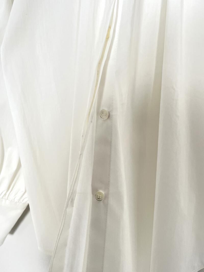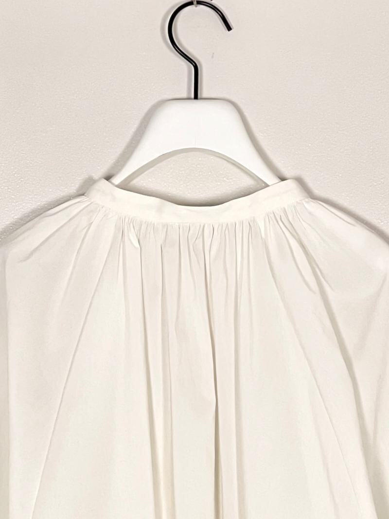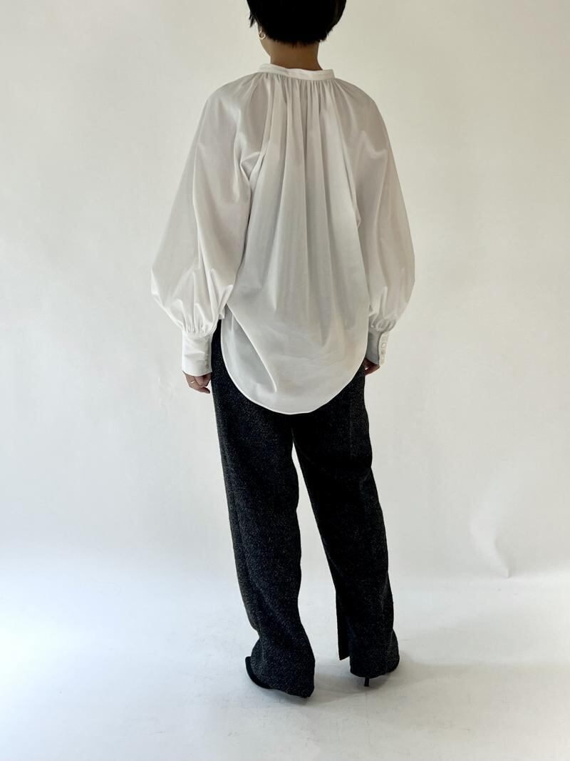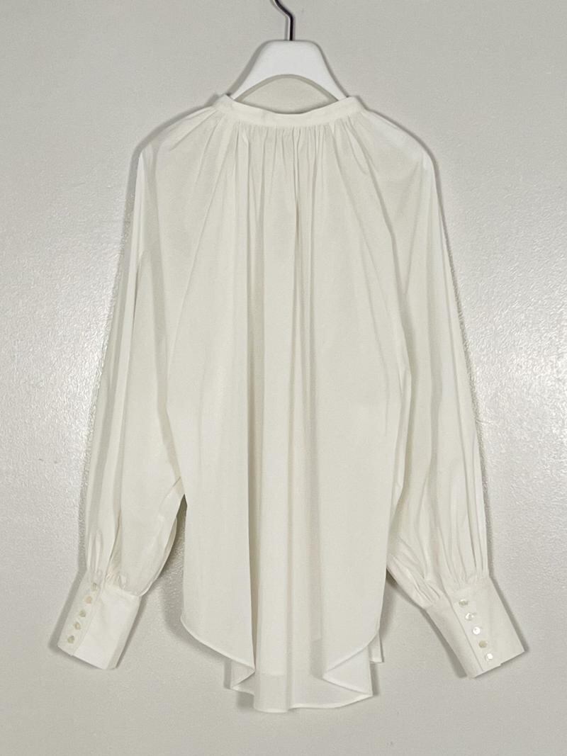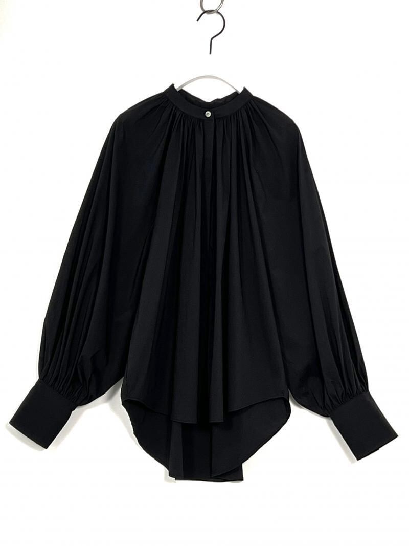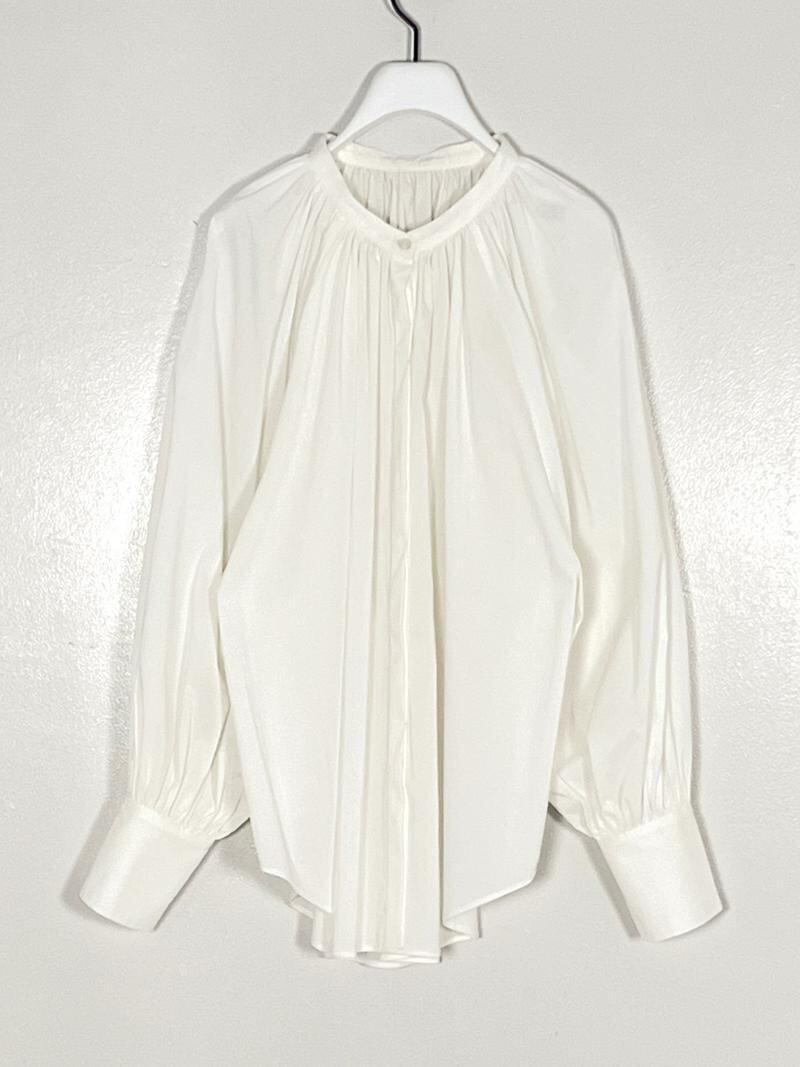 パリッとしたシャープでクリーンな印象のシャツ地合繊素材を使用。衿、袖口にギャザーをたっぷりと入れトレンドのボリューム袖に仕上げました。