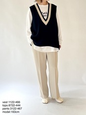 チルデンニットのようなデザインを落ち感のあるきれいな布帛で仕立てた他には無い新鮮なアイテムです。シャツやTシャツの上にレイヤードしたり、春にはノースリブラウスとして着用いただけます。同素材のパンツとのセットアップ合わせがおすすめです。