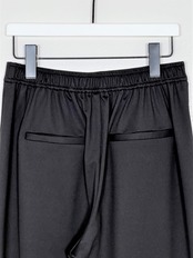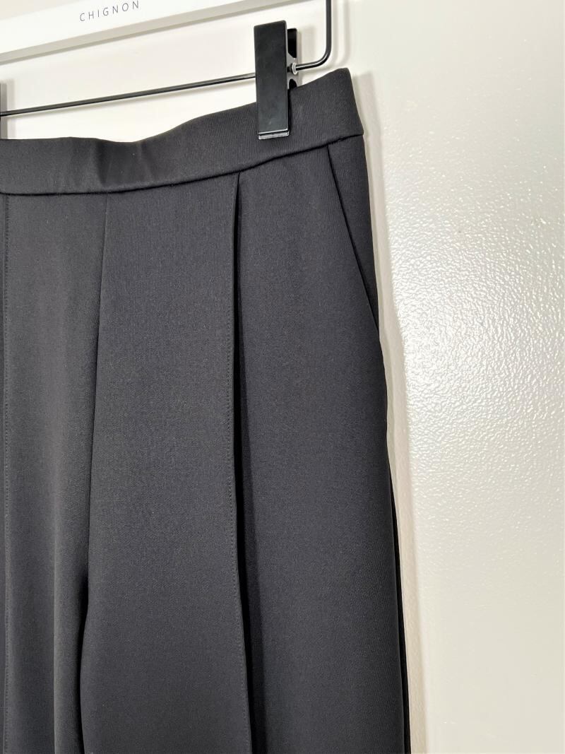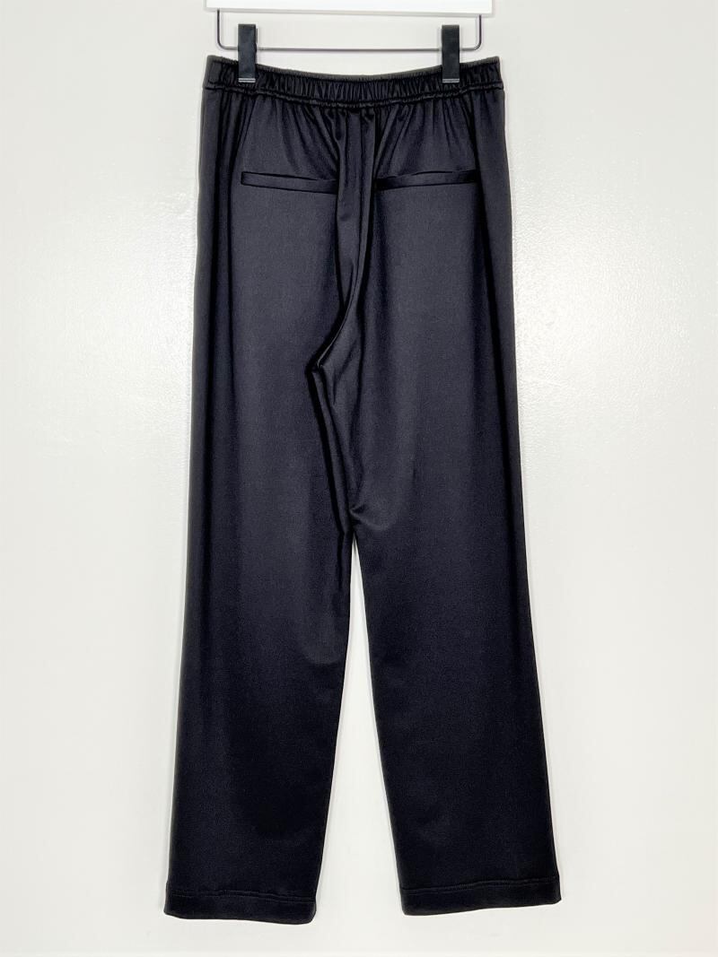 タックから続くセンタープレス風のSTが入った、布帛仕立てのジャージーパンツになります。