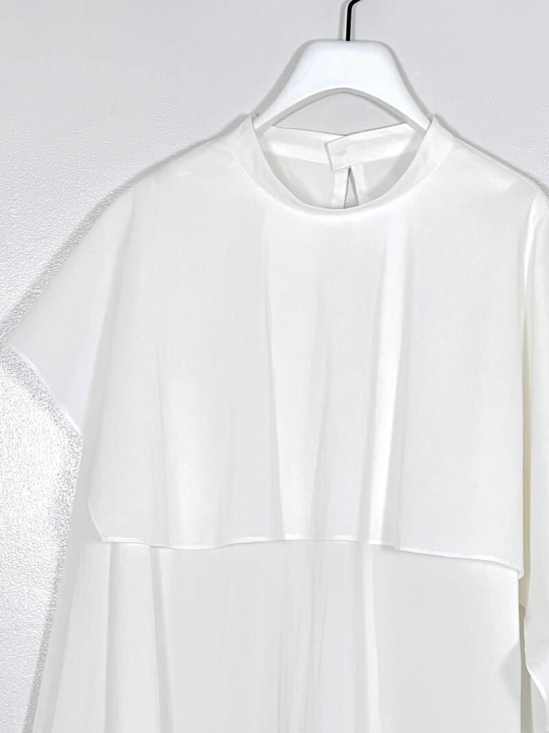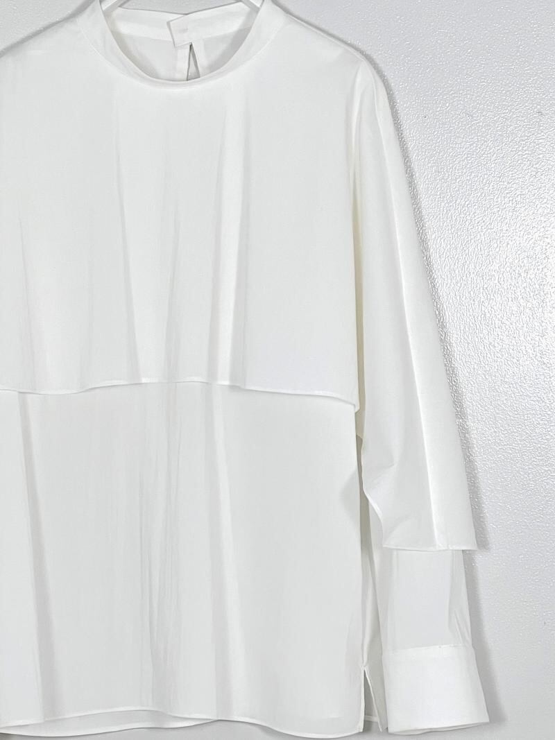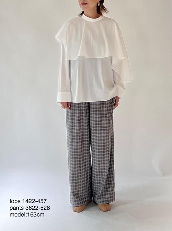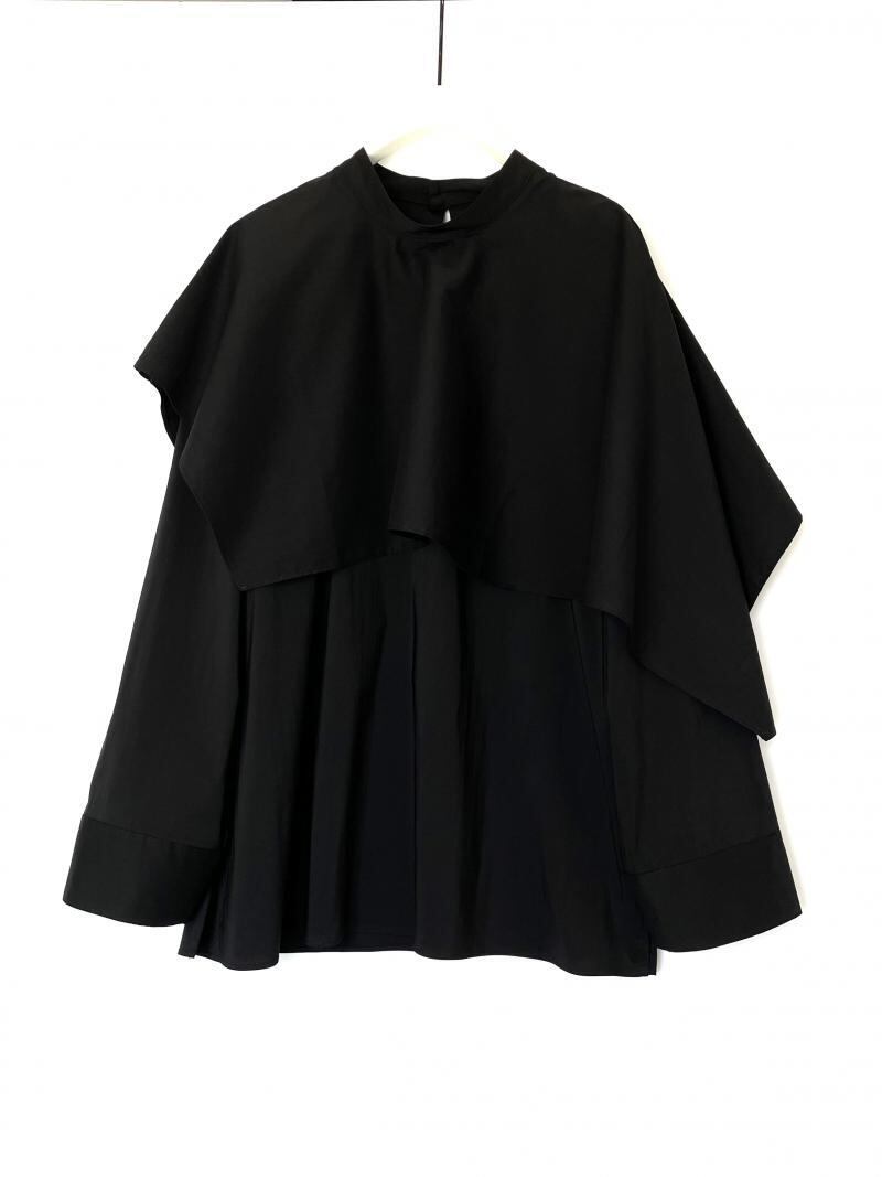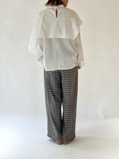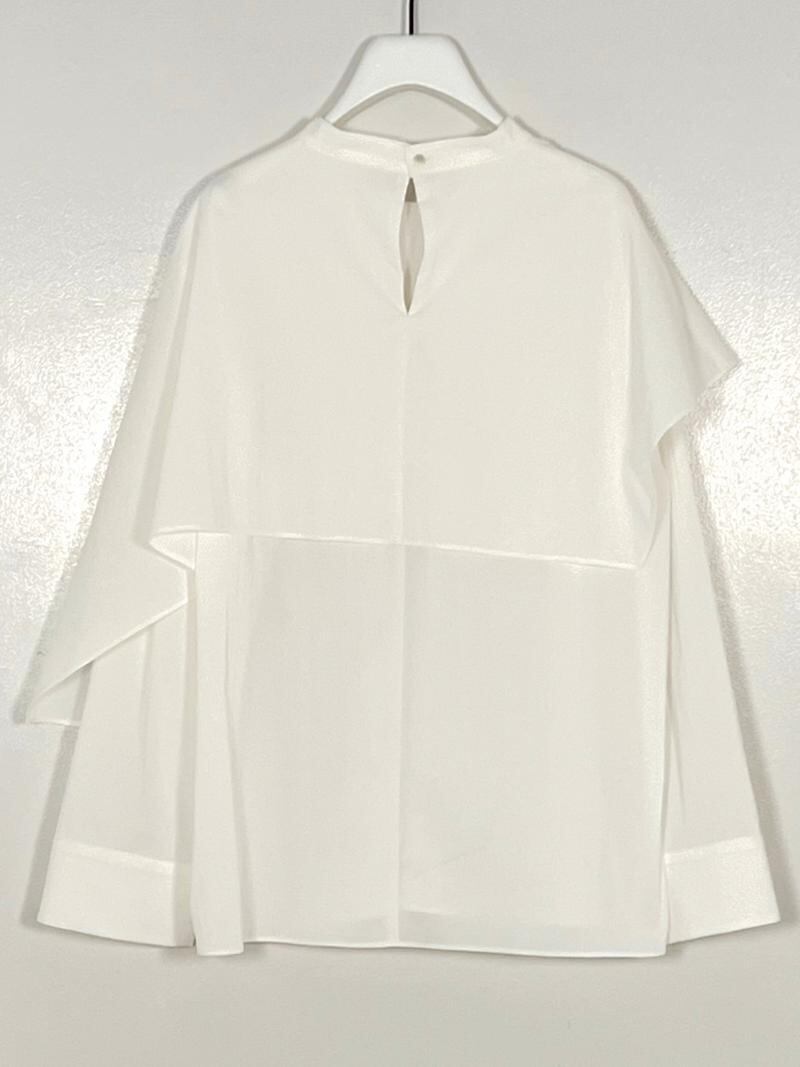 トレンドの襟まわりデザインでモード感が出るようアシンメトリーのラッフルディテールを入れました。
