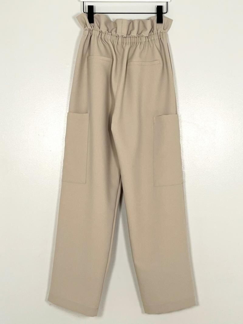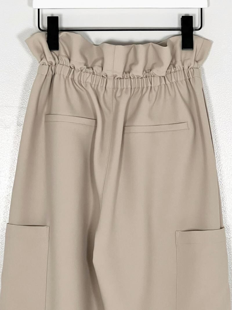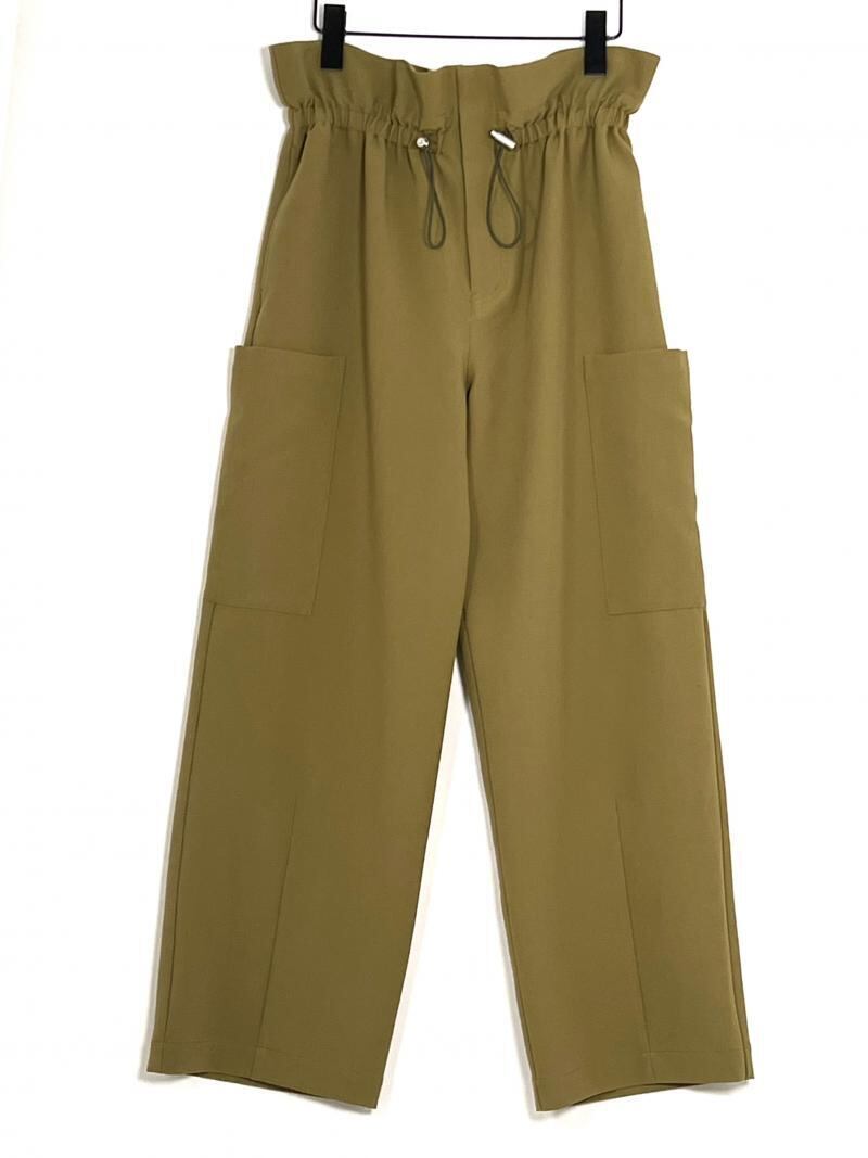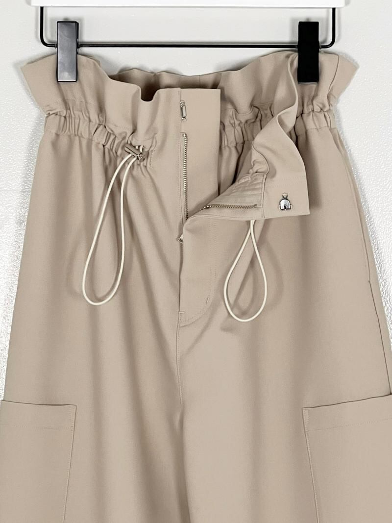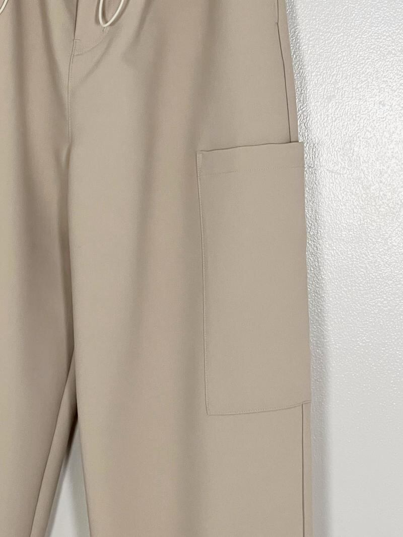 程よく肉感のある、合繊素材を使用しています。カーゴパンツの様なワークDETAILにしていますが、合繊の素材感で、少し綺麗な印象のパンツに仕上げています。