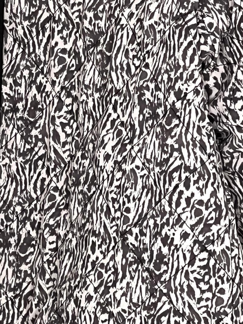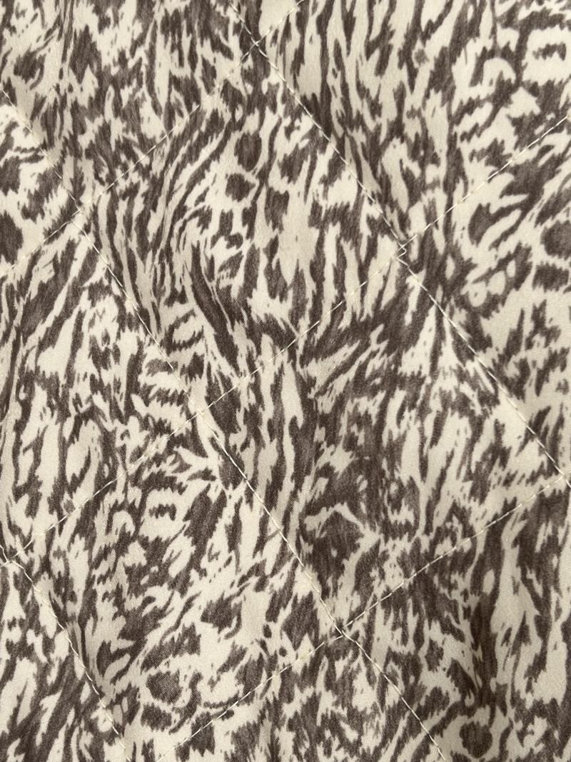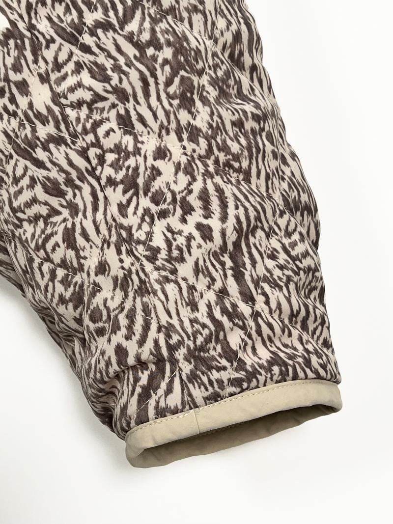 無地側はナイロン素材の少しハリのあるものを使用し、プリント側はゼブラの様なアニマル柄の中綿キルティングにしています。