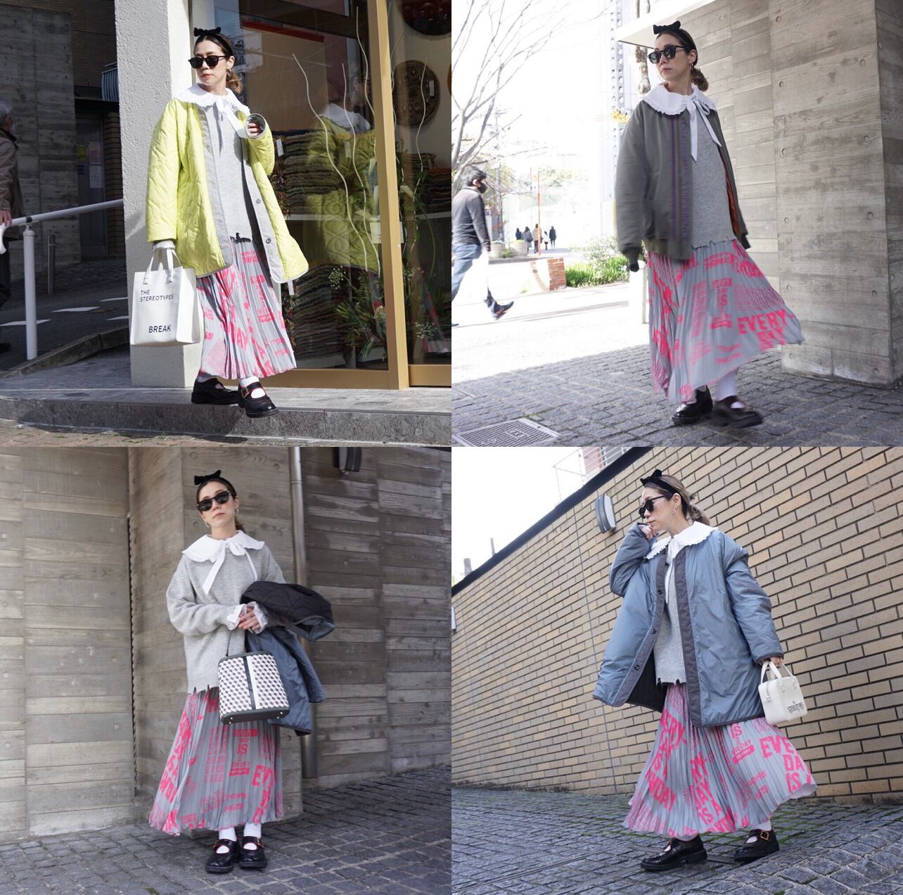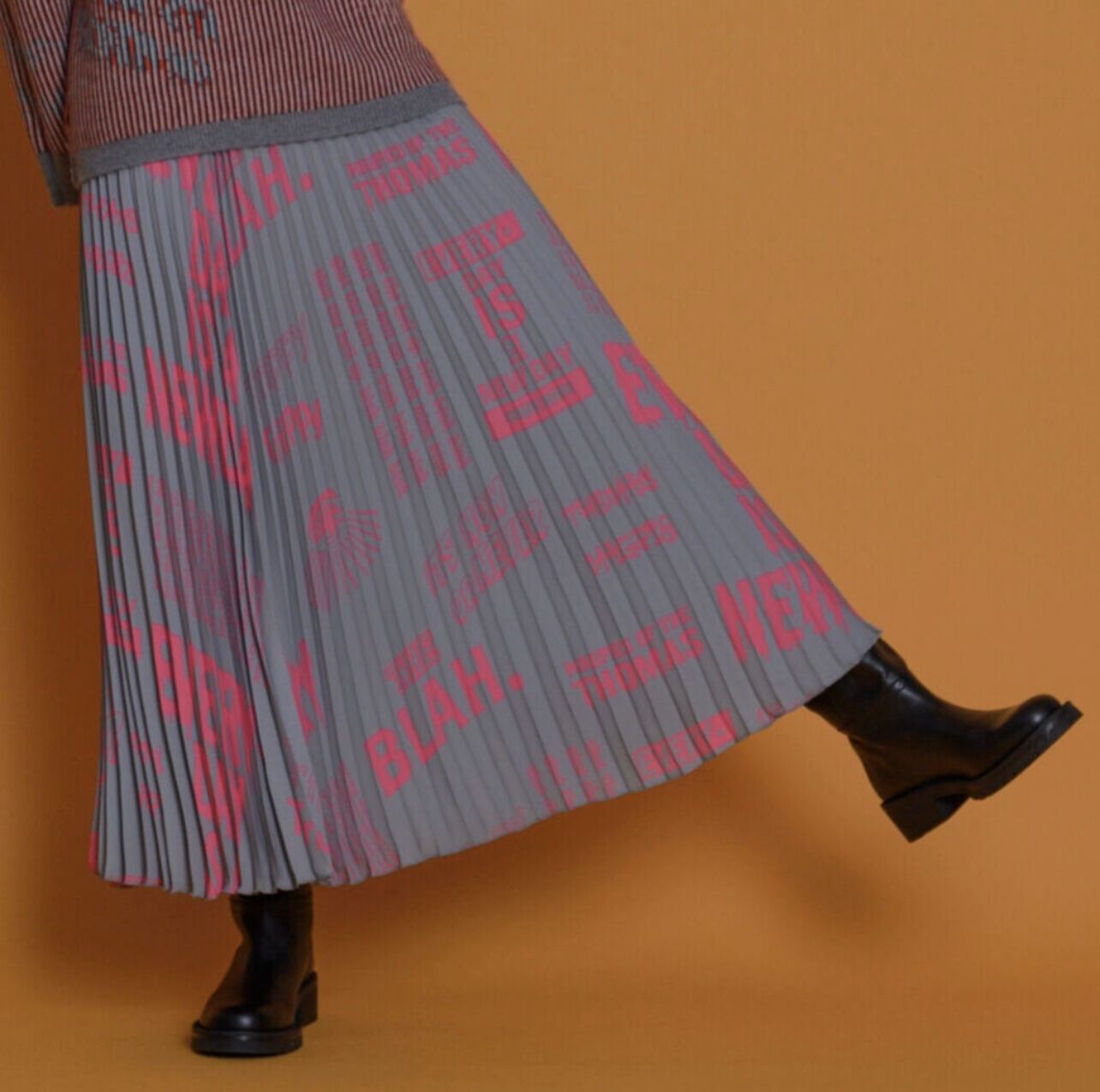 ロゴには今回Tシャツ、スウェット、ニットなどに入れているロゴをスカートに集約させて生地のデザインにしました。私の手書きのロゴも入れています。今回のコレクションテーマは’’おしゃべり女’’くだらぬおしゃべりは女性の特性。そしてストレス発散。そこにフォーカスしてビハインドテーマとしてロゴをそれぞれに作りました。新しい毎日への活力はおしゃべりやお酒を飲んだりすることで、新しい毎日へ向かうために女性は頑張っていると思います。日常にあるシーンの切り取りでロゴを作っています。プリーツになっていてロゴはほとんど読めませんが、おしゃべり女たちへ向けた言葉を作りました。