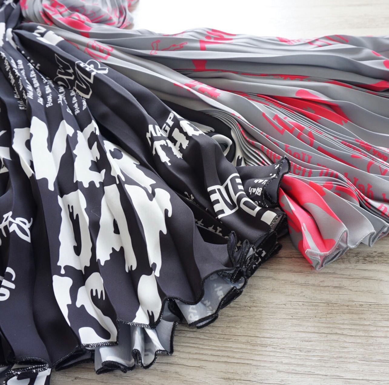 今回のお勧めのカラーは グレーにピンクのロゴです。以前蛍光のプリーツを作りましたが大ヒットでした。それに代わるクセのあるスカートです。