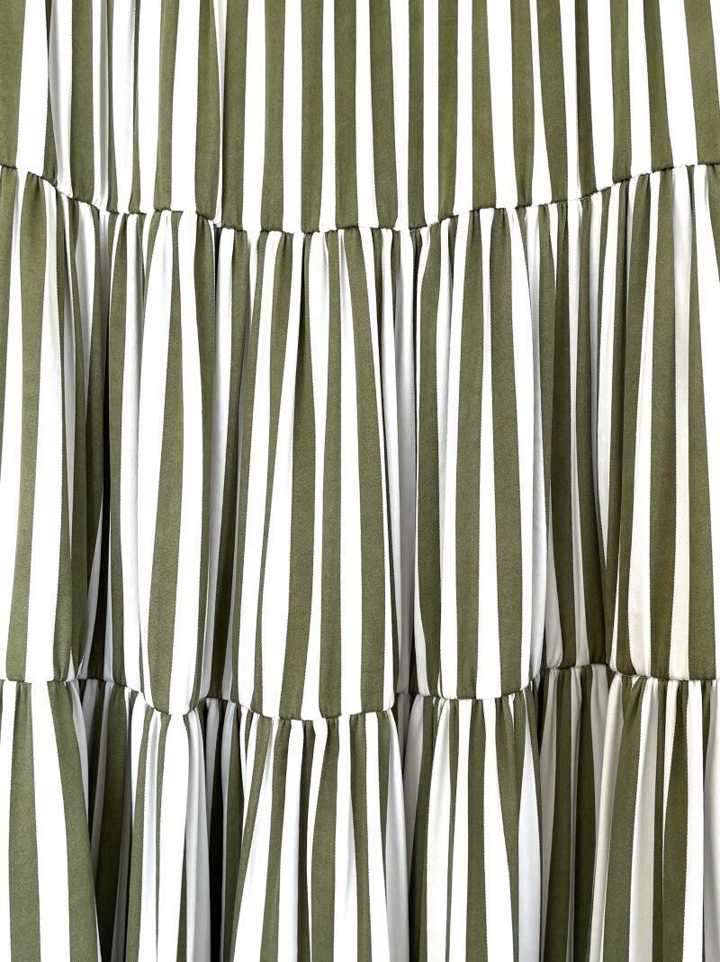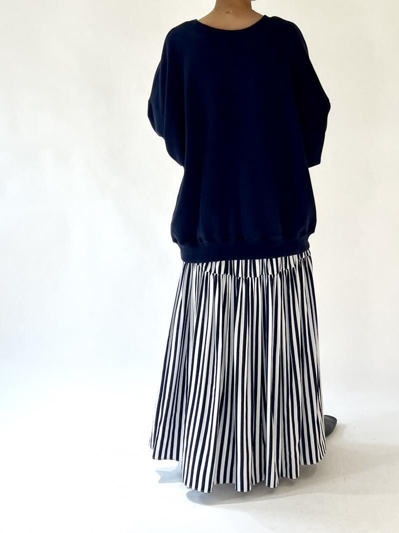 透けにくく、落ち感のあるストライプ生地を使用し、ギャザー分量をたっぷりとったティアードスカート。