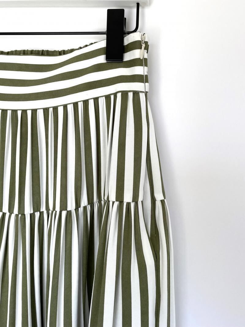 ストライプの柄にティアードのディテールを入れることで柄に変化が出るため、大胆な見え方になり甘くなり過ぎないティアードスカートに仕上げました。