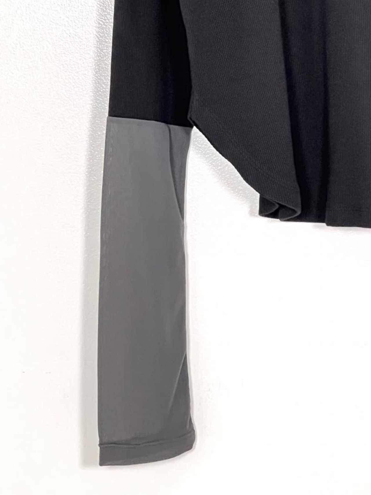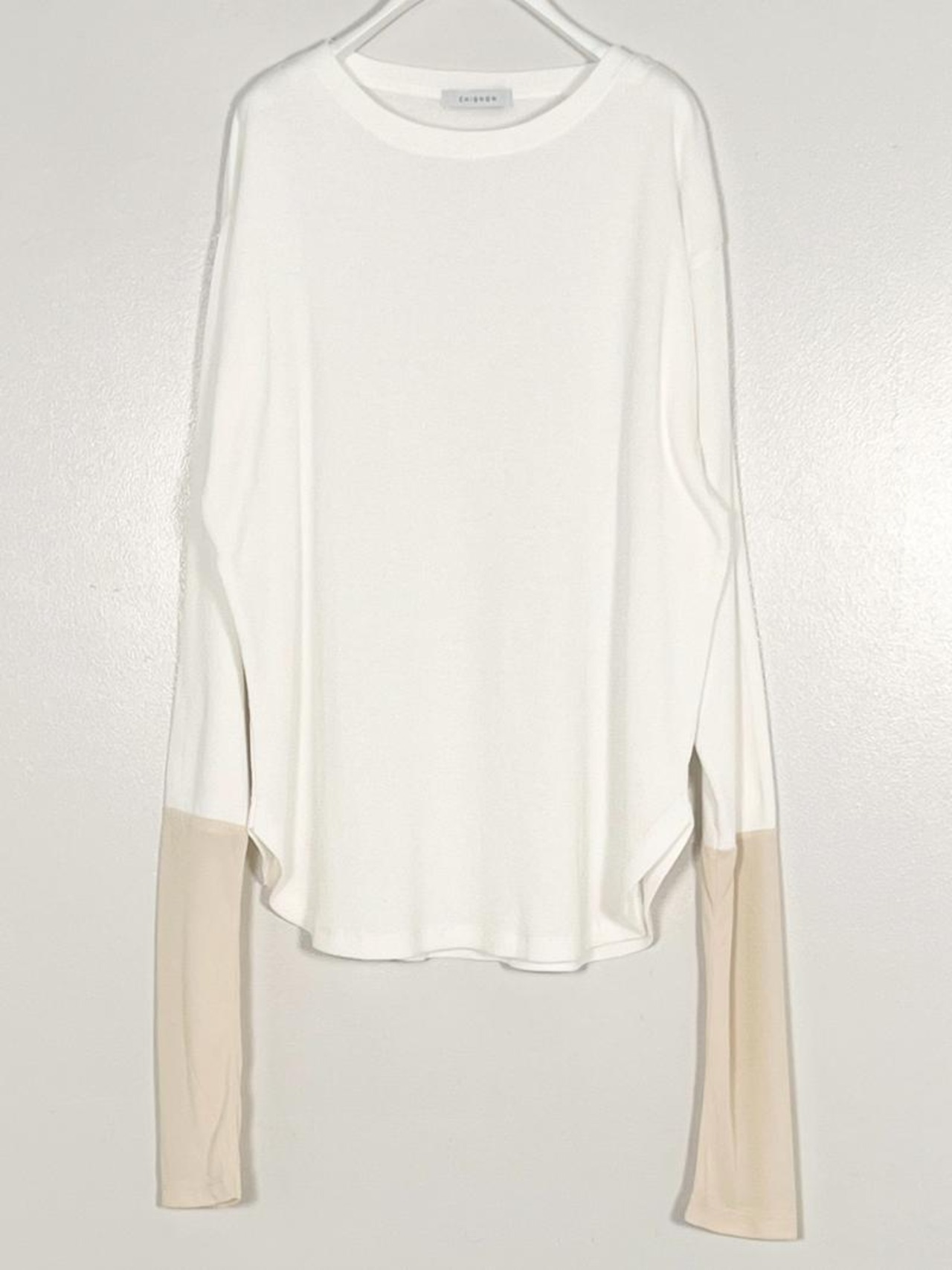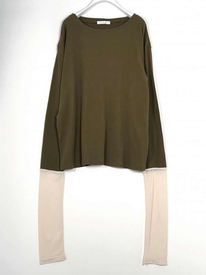 柔らかいリブ素材を使用し、袖口部分にシアー素材をドッキングしています。袖丈も長めに設定しているので、着用して頂くとクシュクシュと袖口に溜まったシアー素材が可愛いカットソーです。