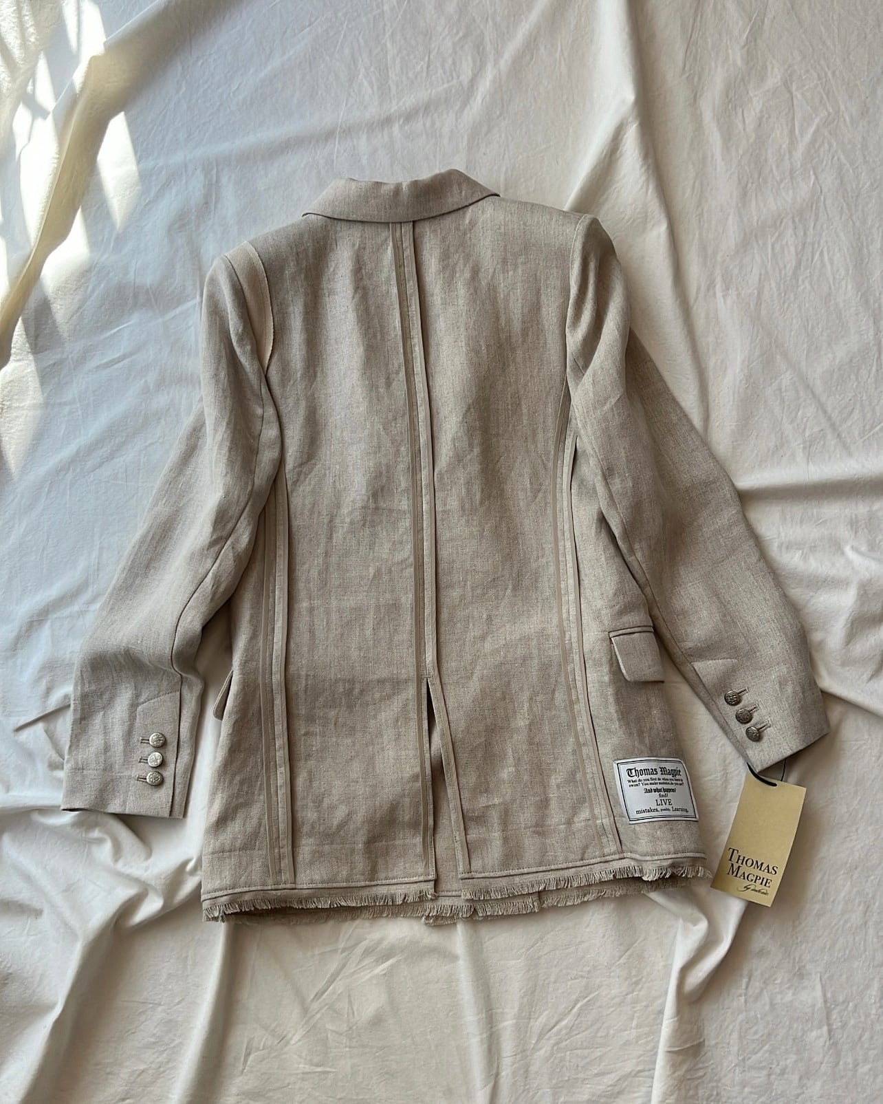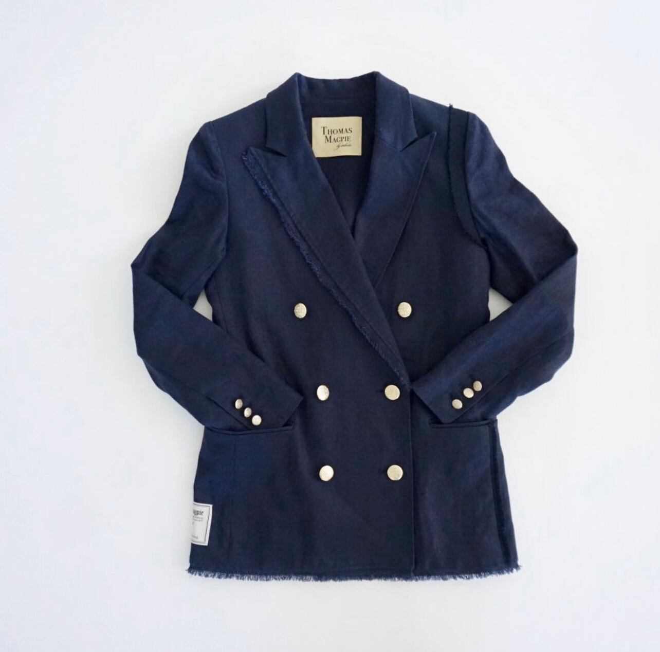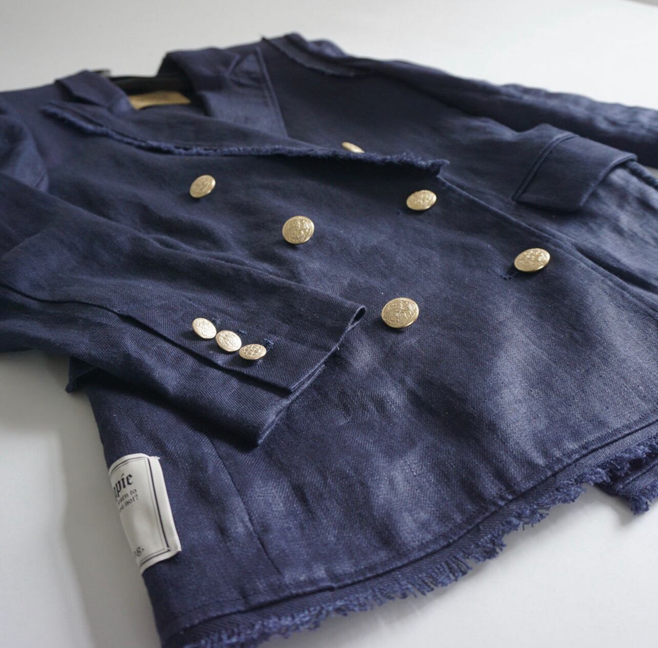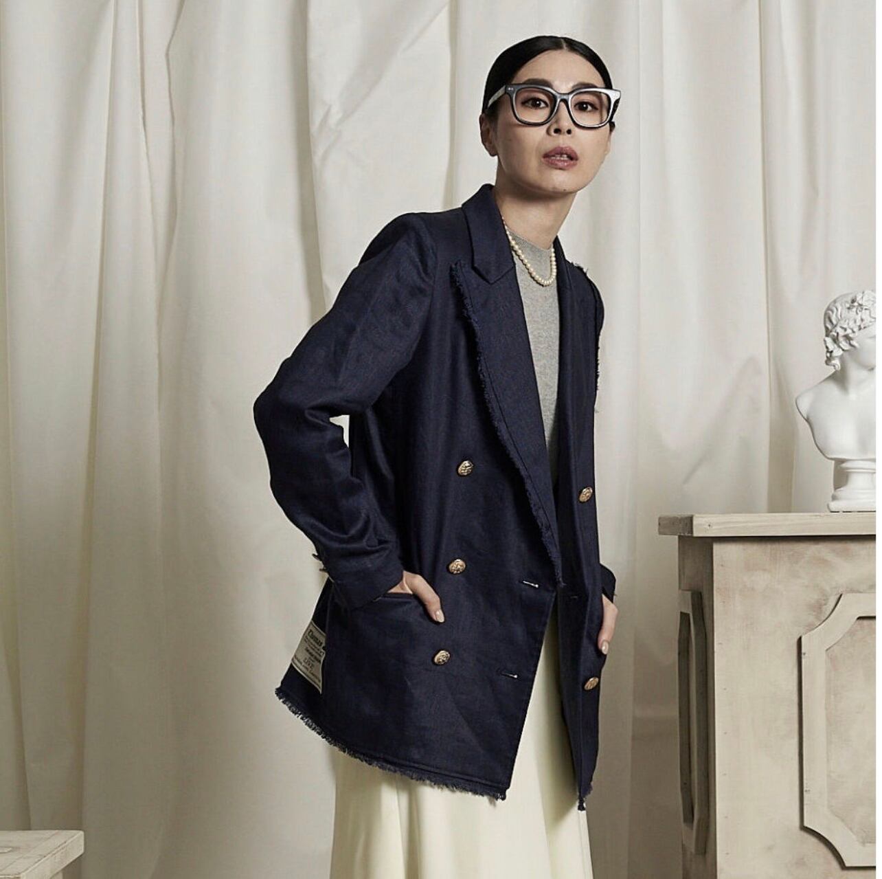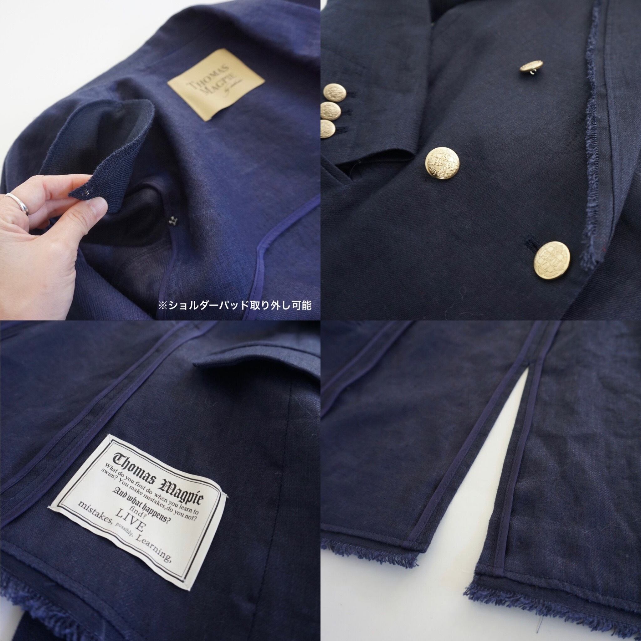 ネイビーのブレザーが作りたくて、今回は金ボタンで少しトラッド色が強いものにしてみました。トラッドな紺のブレザーを出したのは2回目になります。以前から私も大好きでブラックに加え紺のブレザーはいくつか持っていますが、今回はとても涼しいもの、そこに重点をおき、作ってみました。夏にも半袖の上にかっこいいジャケットを羽織りたい。夏は暑いからTシャツに頼りがちですが、Tシャツばかりの毎日は楽しくないと思い、ライナーレスの涼しいジャケットにしています。裏地がないことで驚くほど涼しい。ですがやや厚みのあるしっかりしたリネン素材なので、春、秋でもシーズンは気にせずに着用したくなる雰囲気を持っています。